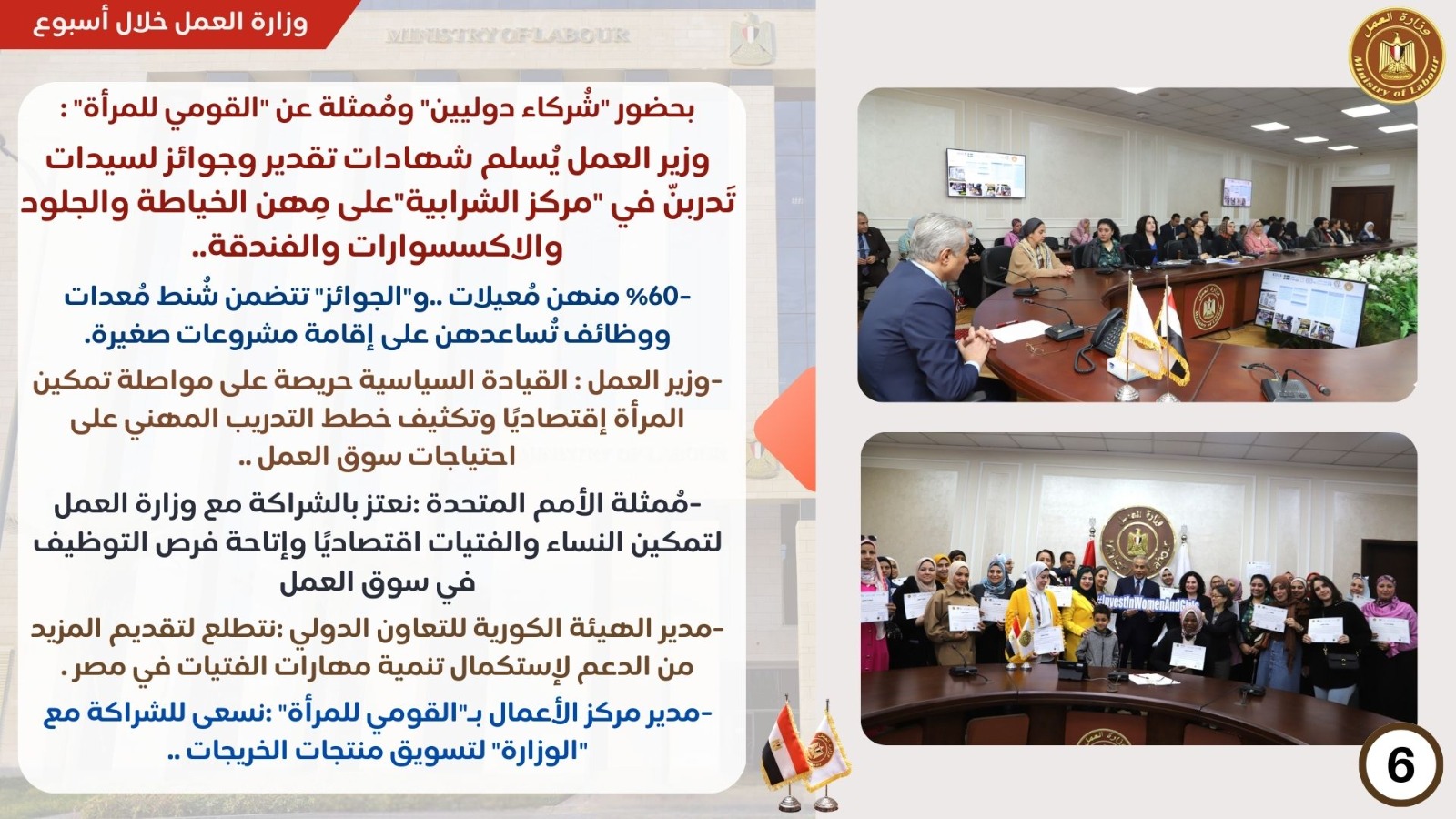 وجاء ذلك خلال تسليم وزير العمل شهادات تقدير وجوائز لـ 25 مُتدربة من خريجي مركز تدريب مهني شهداء الكتيبة 103 صاعقة بالشرابية، في إطار مشروع تُنفذه "وحدة المساواة بين الجنسين" بوزارة العمل مع هيئة الأمم المتحدة للمرأة، وشركة قدرة للتنمية والحلول التكنولوجية للتعليم، بتمويل من هيئة التعاون الدولي الكورية "كويكا "، و الوكالة السويدية "سيدا"، والذي يستهدف تدريب 300 سيدة في 3 محافظات هي:الأسكندرية ، وبني سويف ، والقاهرة.