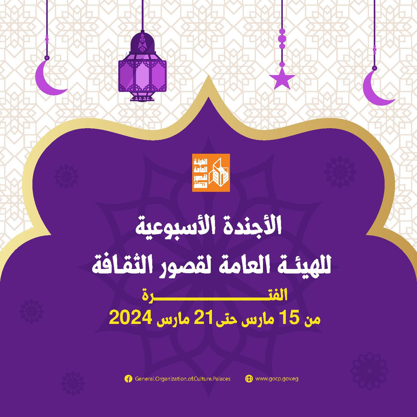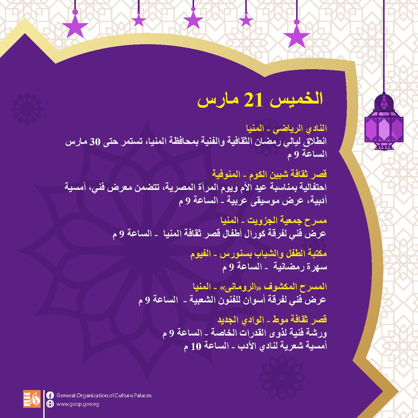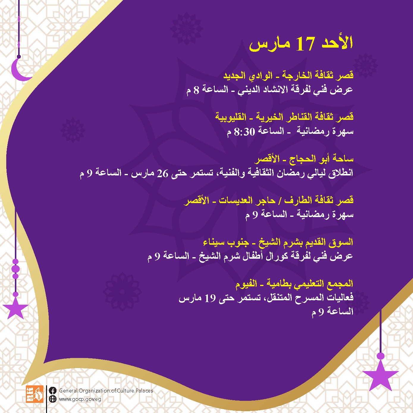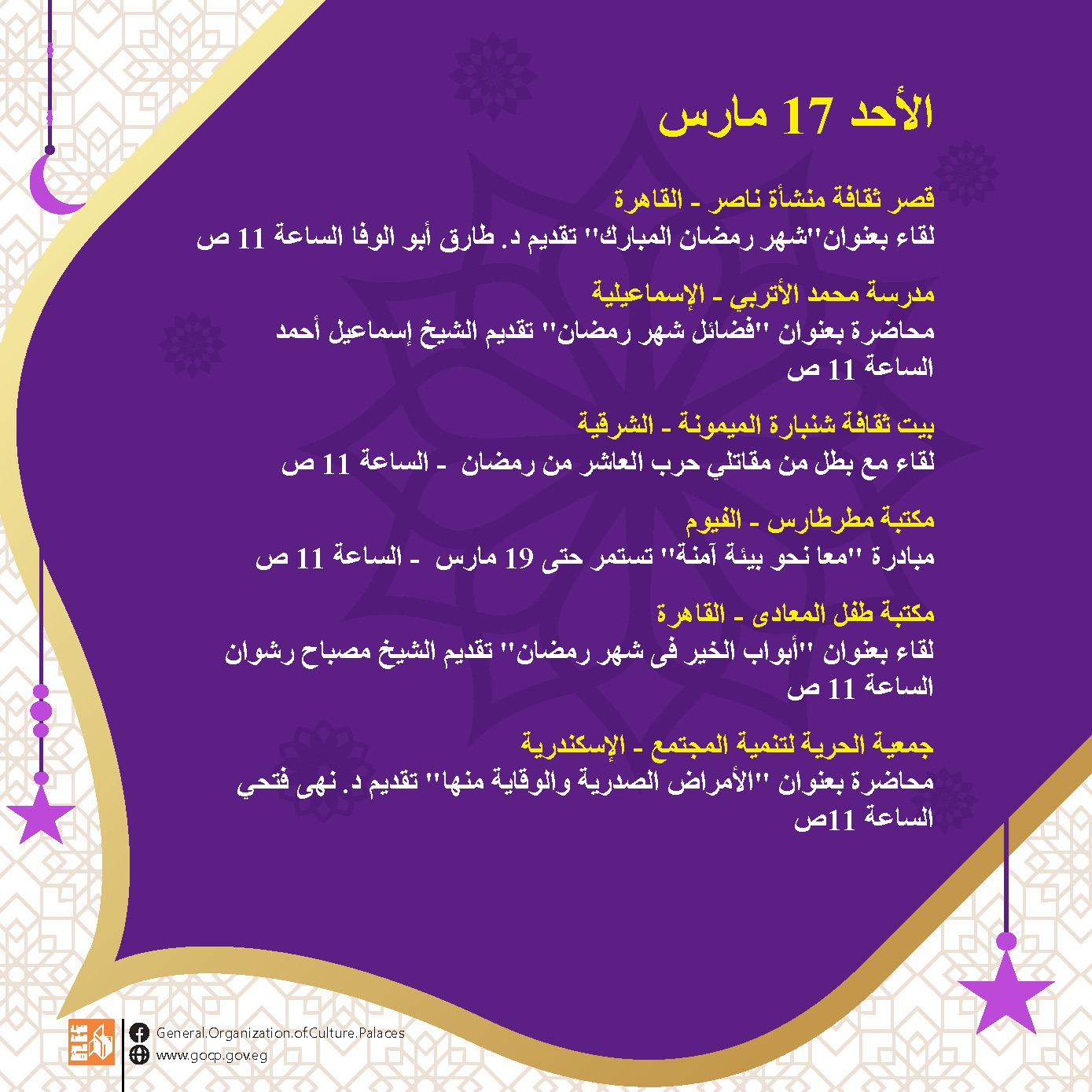 من أبرز تلك الفعاليات انطلاق البرنامج السنوي المكثف لهيئة قصور الثقافة احتفالًا بشهر رمضان المبارك في القاهرة والمحافظات، تحت عنوان "ليالي رمضان الثقافية والفنية"، الذي تتنوع فيه الأنشطة طوال الشهر ما بين العروض الفنية والمسرحية والأمسيات الأدبية وليالي السيرة الهلالية واللقاءات التثقيفية ومنها عطر الأحباب والعودة إلى الجذور ومناقشات الكتب ومعارض الكتب، وأنشطة الأطفال وذوي القدرات الخاصة، والورش والمعارض الحرفية والتراثية وغيرها.