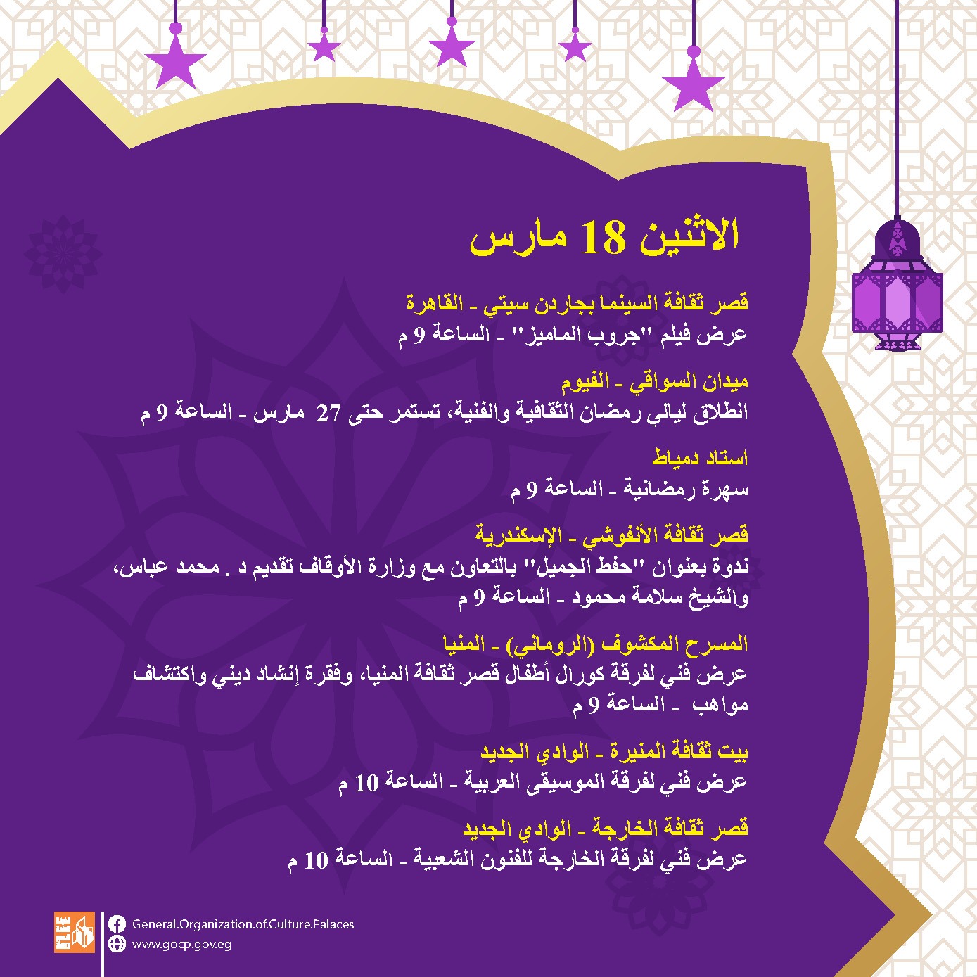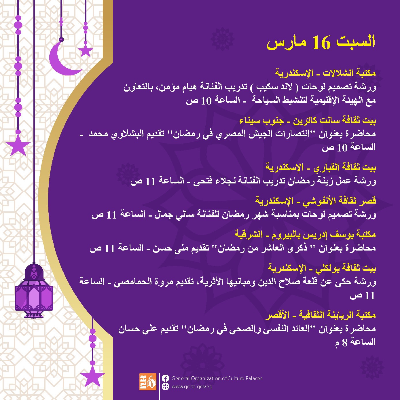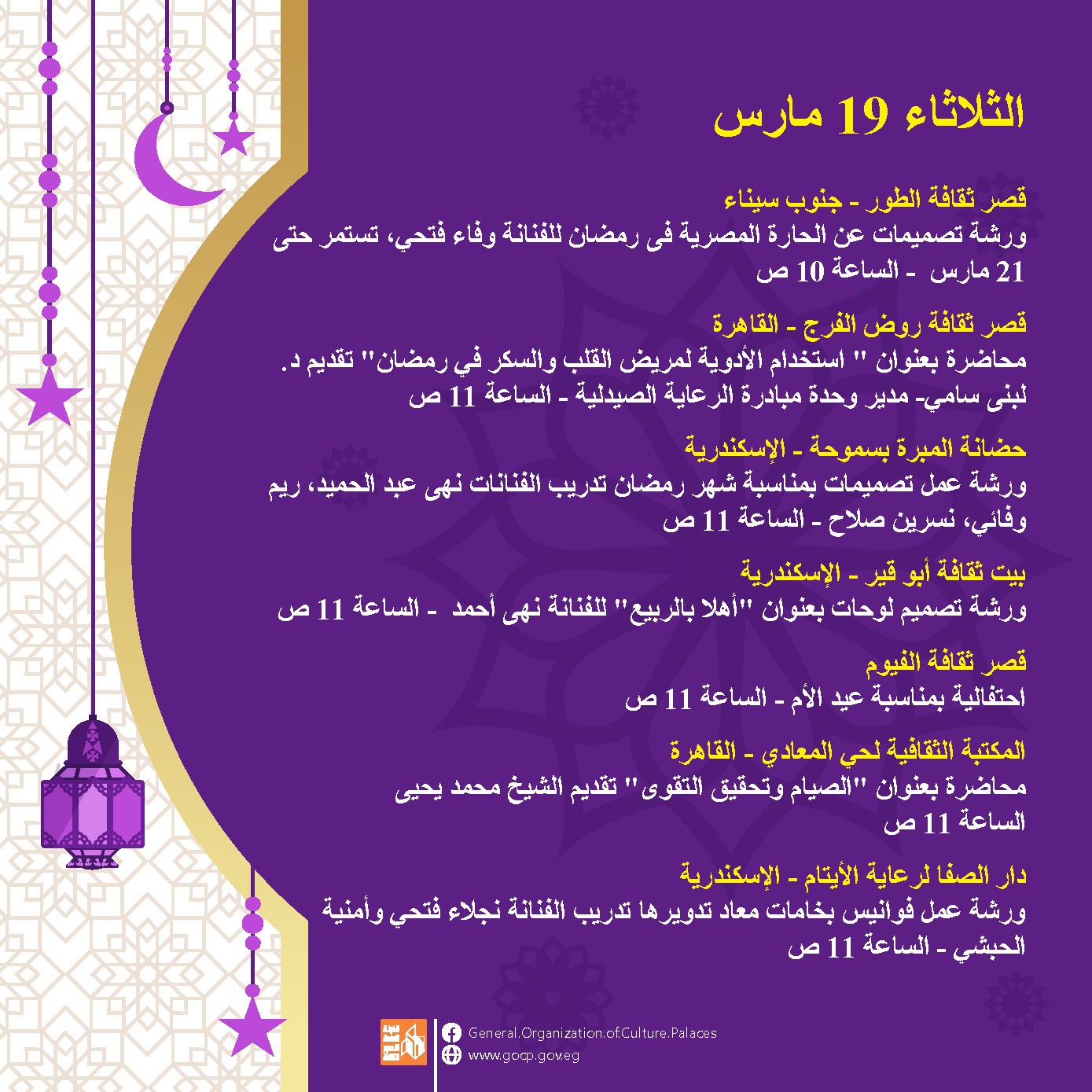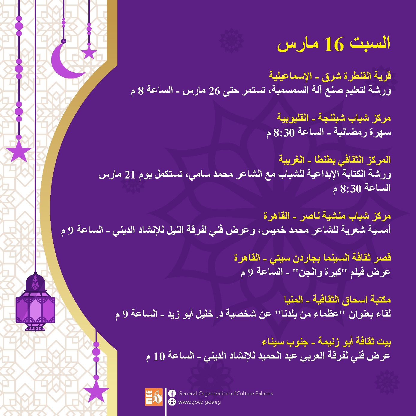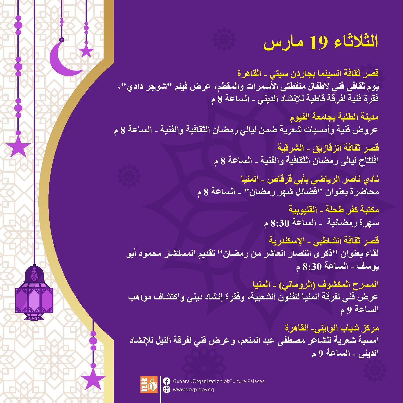 من أبرز تلك الفعاليات انطلاق البرنامج السنوي المكثف لهيئة قصور الثقافة احتفالًا بشهر رمضان المبارك في القاهرة والمحافظات، تحت عنوان "ليالي رمضان الثقافية والفنية"، الذي تتنوع فيه الأنشطة طوال الشهر ما بين العروض الفنية والمسرحية والأمسيات الأدبية وليالي السيرة الهلالية واللقاءات التثقيفية ومنها عطر الأحباب والعودة إلى الجذور ومناقشات الكتب ومعارض الكتب، وأنشطة الأطفال وذوي القدرات الخاصة، والورش والمعارض الحرفية والتراثية وغيرها.