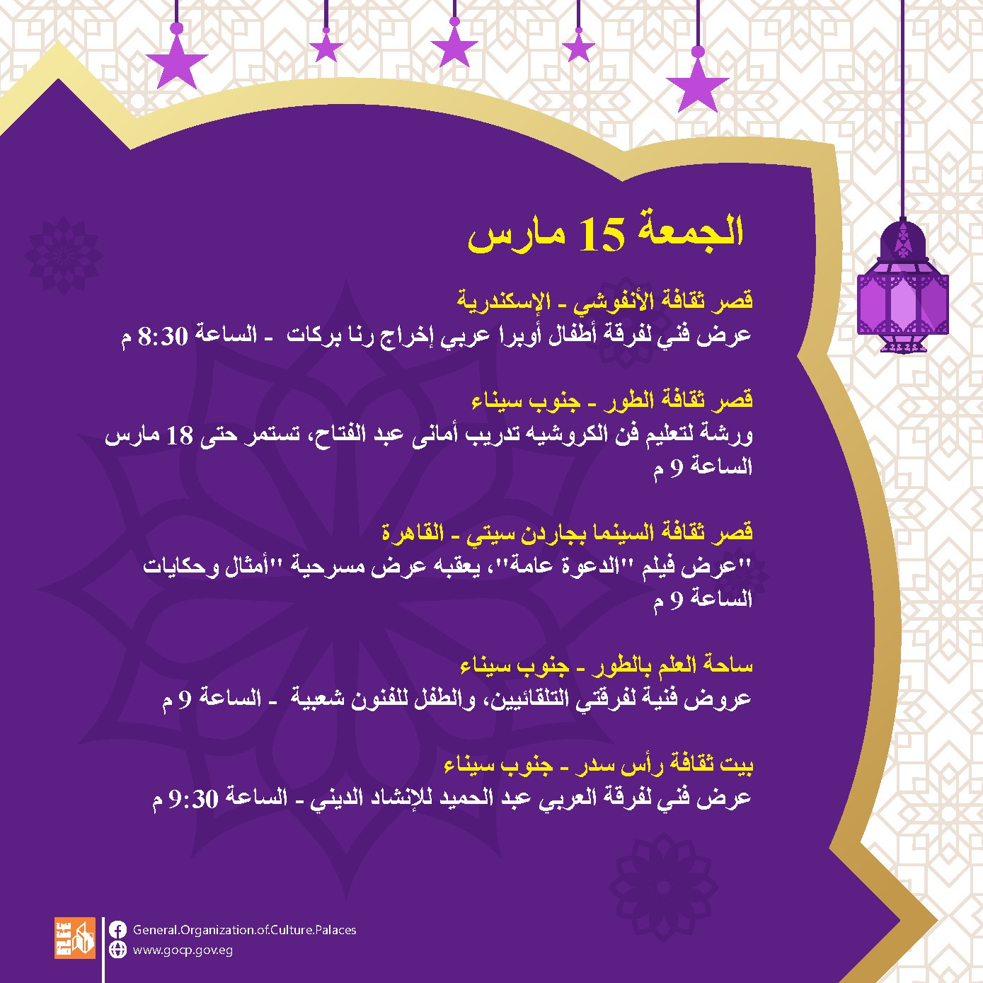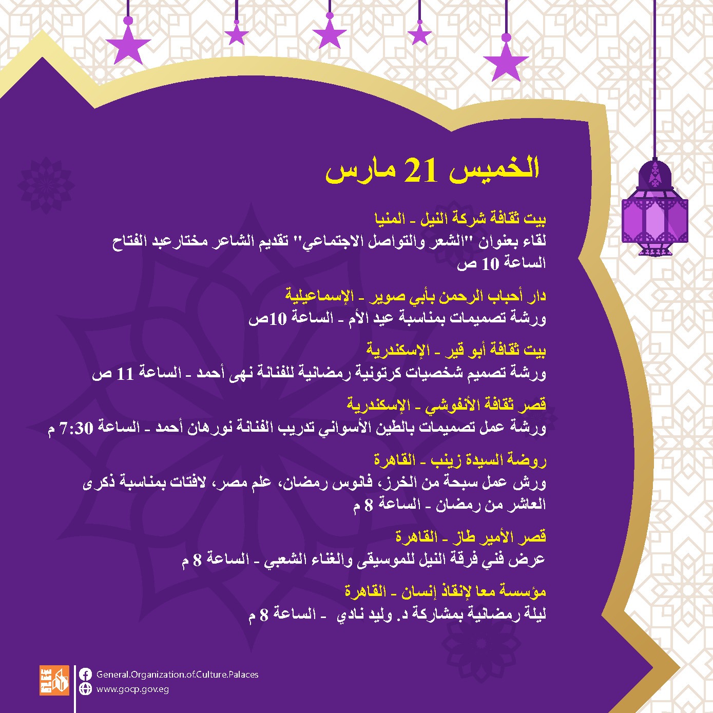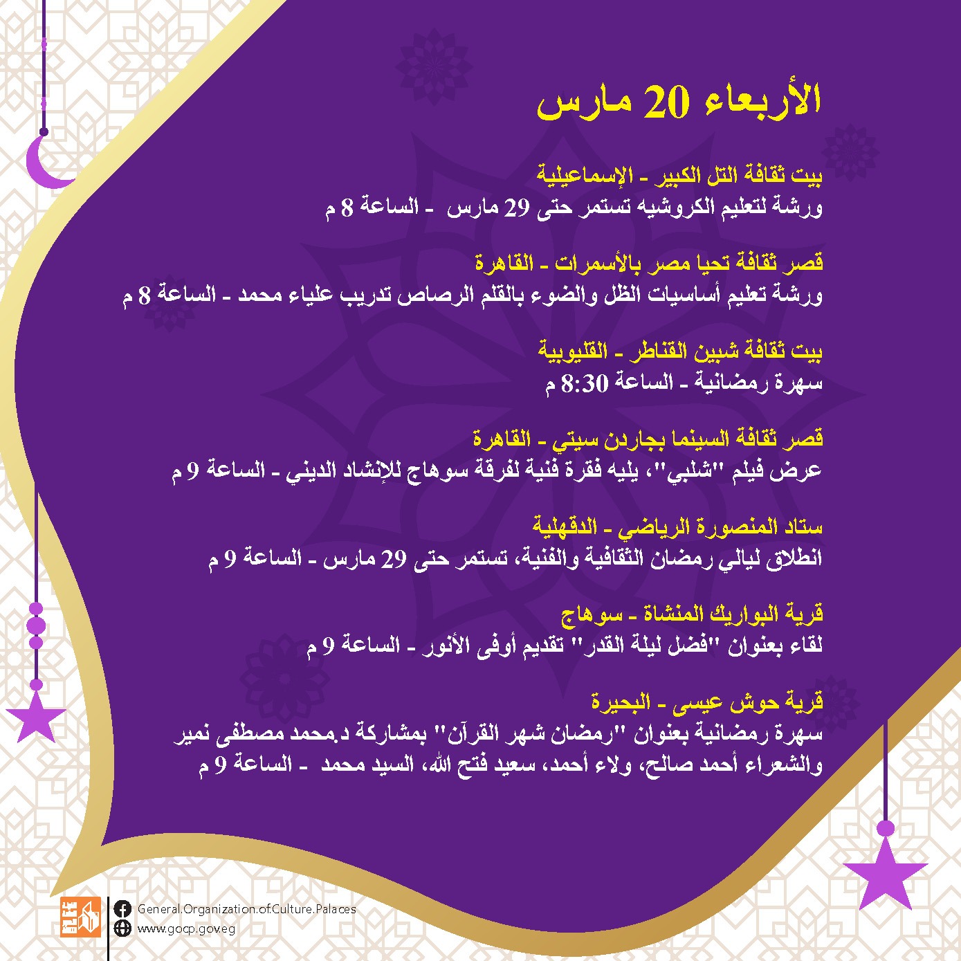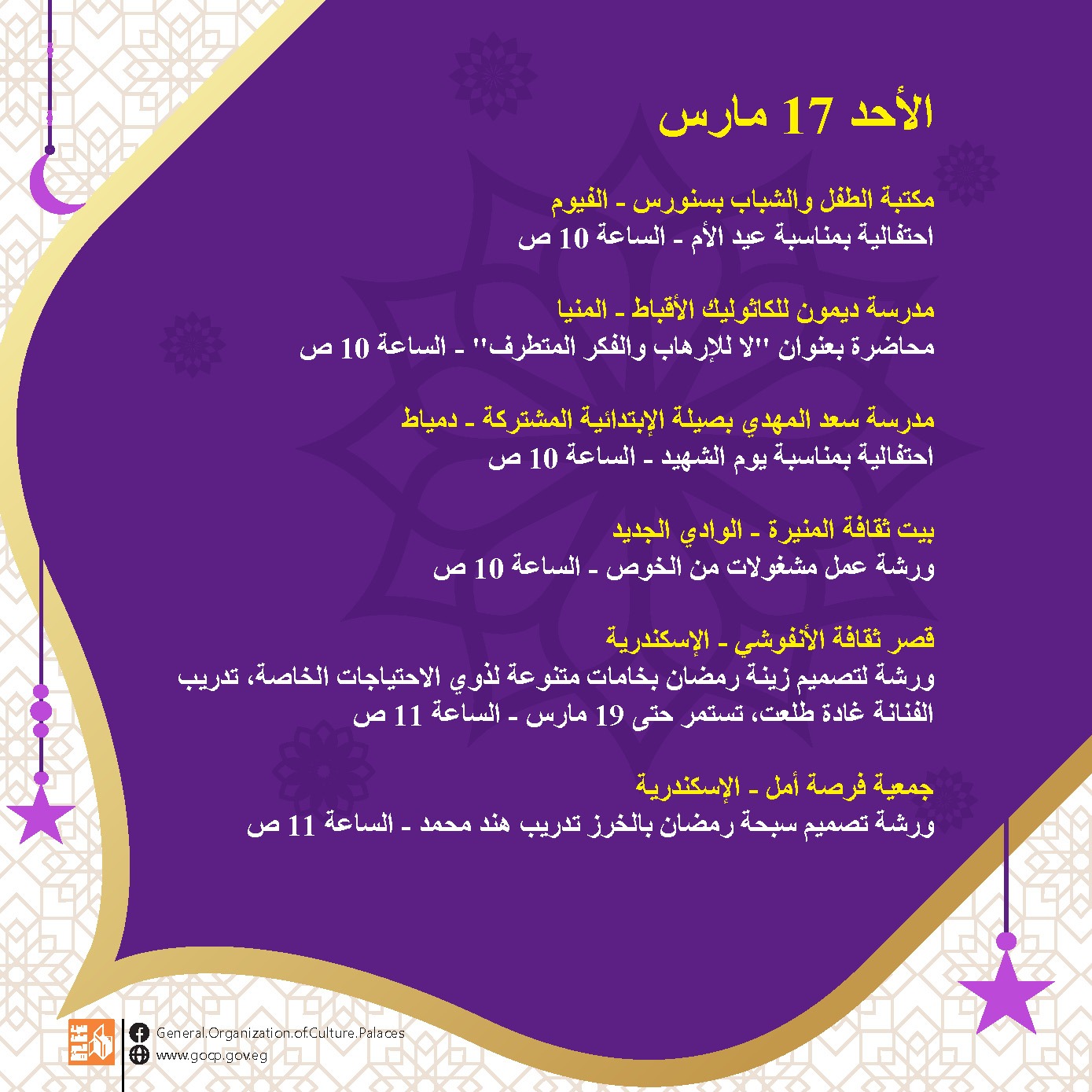 من أبرز تلك الفعاليات انطلاق البرنامج السنوي المكثف لهيئة قصور الثقافة احتفالًا بشهر رمضان المبارك في القاهرة والمحافظات، تحت عنوان "ليالي رمضان الثقافية والفنية"، الذي تتنوع فيه الأنشطة طوال الشهر ما بين العروض الفنية والمسرحية والأمسيات الأدبية وليالي السيرة الهلالية واللقاءات التثقيفية ومنها عطر الأحباب والعودة إلى الجذور ومناقشات الكتب ومعارض الكتب، وأنشطة الأطفال وذوي القدرات الخاصة، والورش والمعارض الحرفية والتراثية وغيرها.