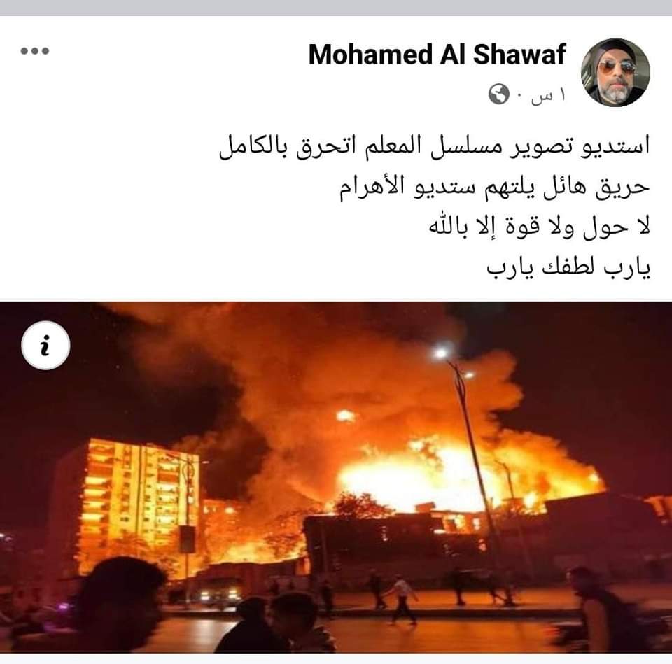علق محمد الشواف عبر حسابه الرسمي بموقع "فيسبوك"، قائلاً: "ستديو تصوير مسلسل المعلم اتحرق بالكامل، حريق هائل يلتهم ستديو الأهرام، لا حول ولا قوة إلا بالله، يا رب لطفك يا رب".