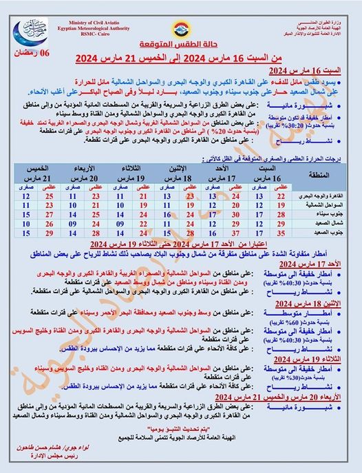 فيما توقعت هيئة الأرصاد سقوط الأمطار على شمال ووسط الصعيد بداية من يوم غدٍ الأحد تصل إلى القاهرة الكبرى والوجه البحري وجنوب الصعيد ومحافظة البحر الأحمر وسيناء يوم الاثنين المقبل كما تنشط الرياح هناك