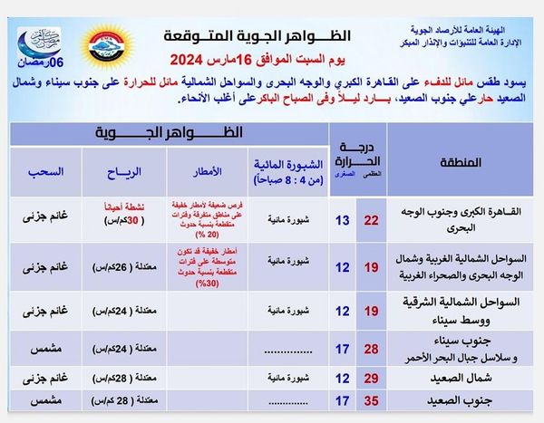 بيان هيئة الأرصاد بـ درجات الحرارة المتوقعة اليوم السبت على محافظات ومدن مصر