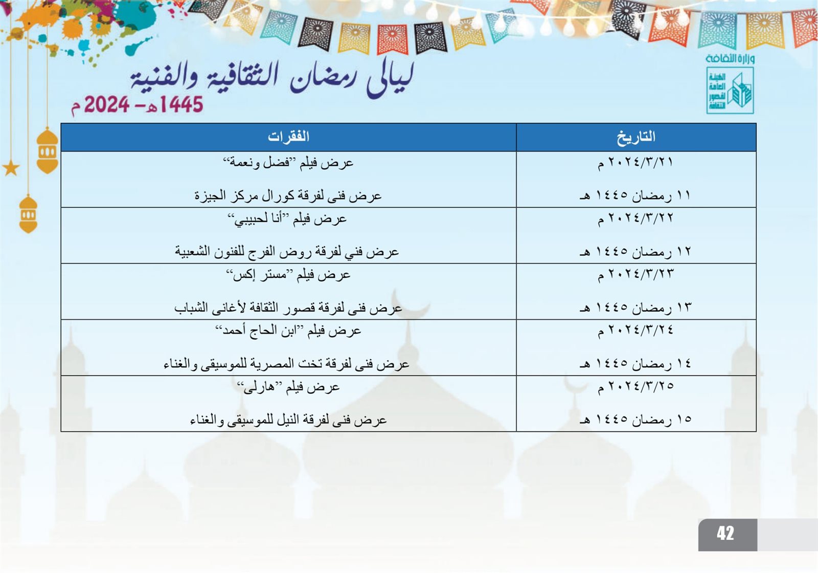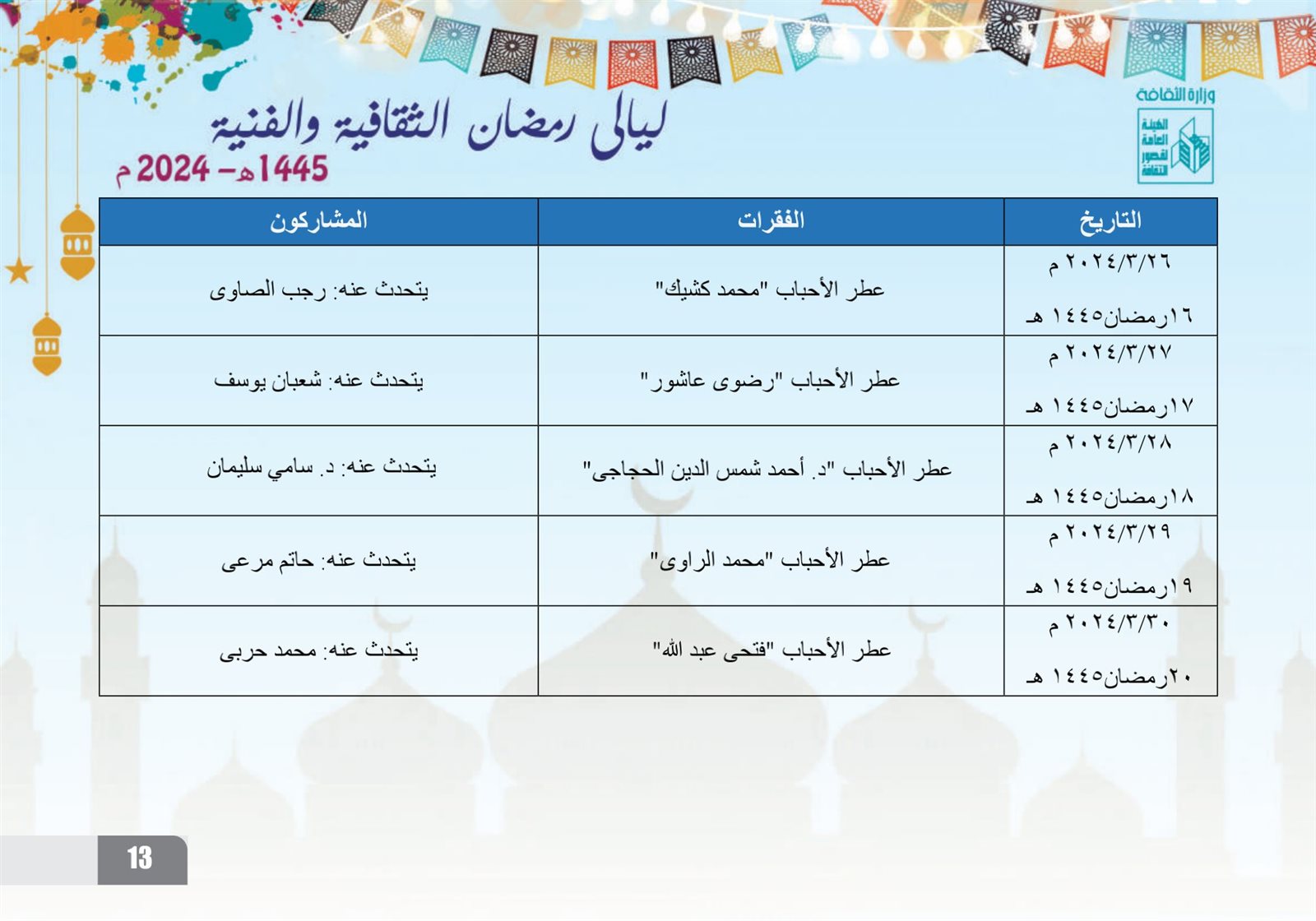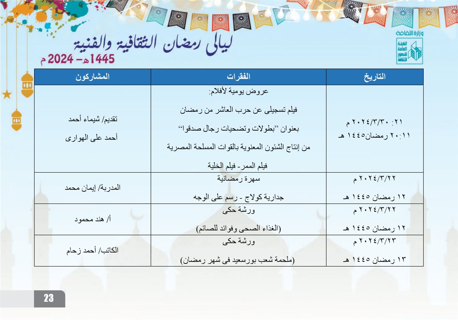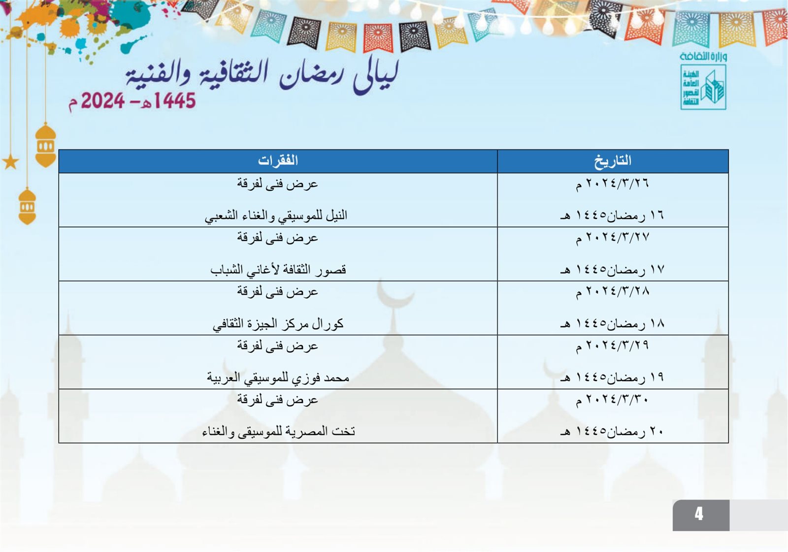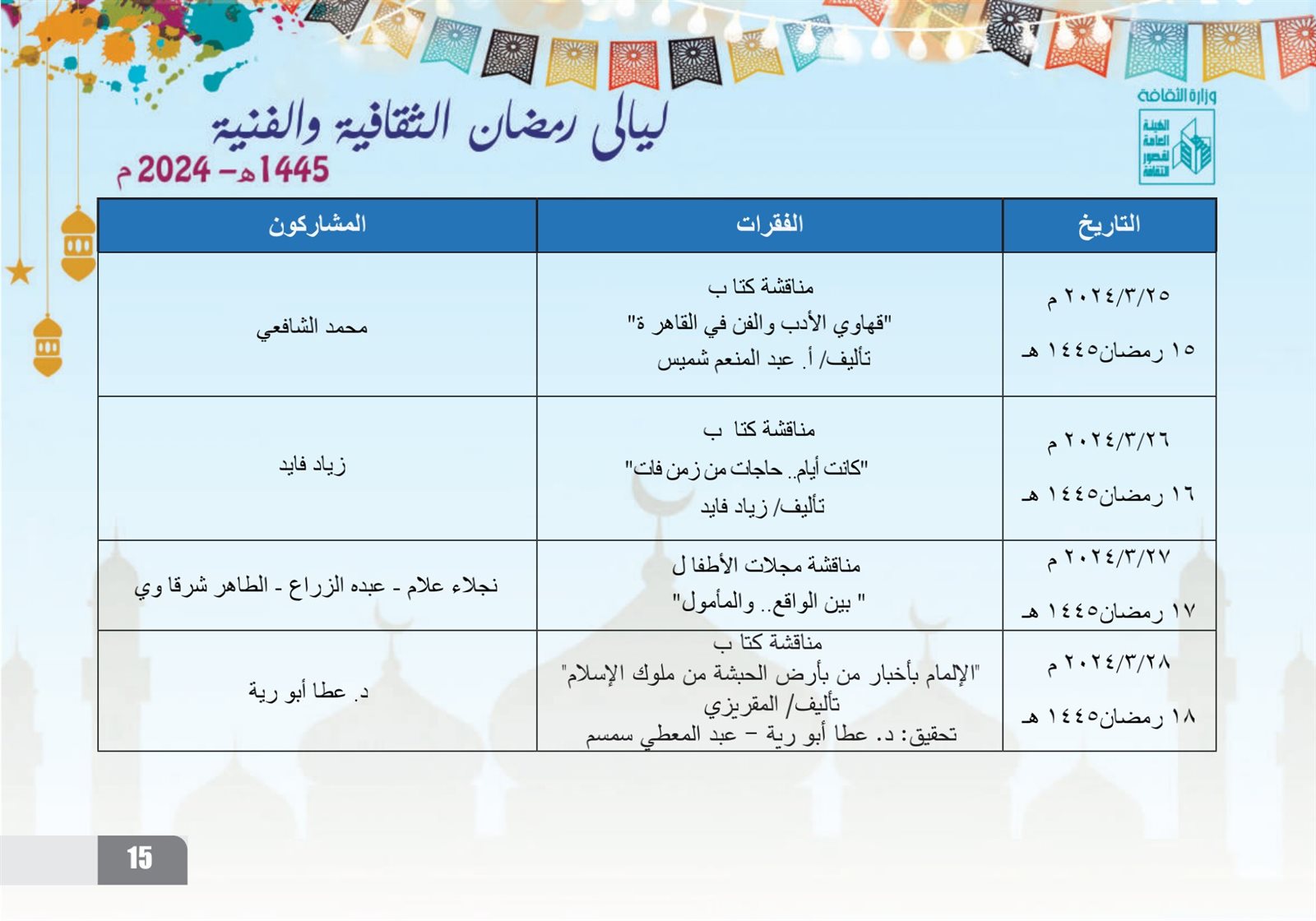 تنشر بوابة الوفد الالكترونية البرنامج التفصيلي لاحتفالات الهيئة العامة لقصور الثقافة "ليالي رمضان الثقافية والفنية" 1445ه - 2024م بقصر ثقافة روض الفرج والحديقة الثقافية بالسيدة زينب ومسرح السامر وقصر السينما وغيرها من المواقع.