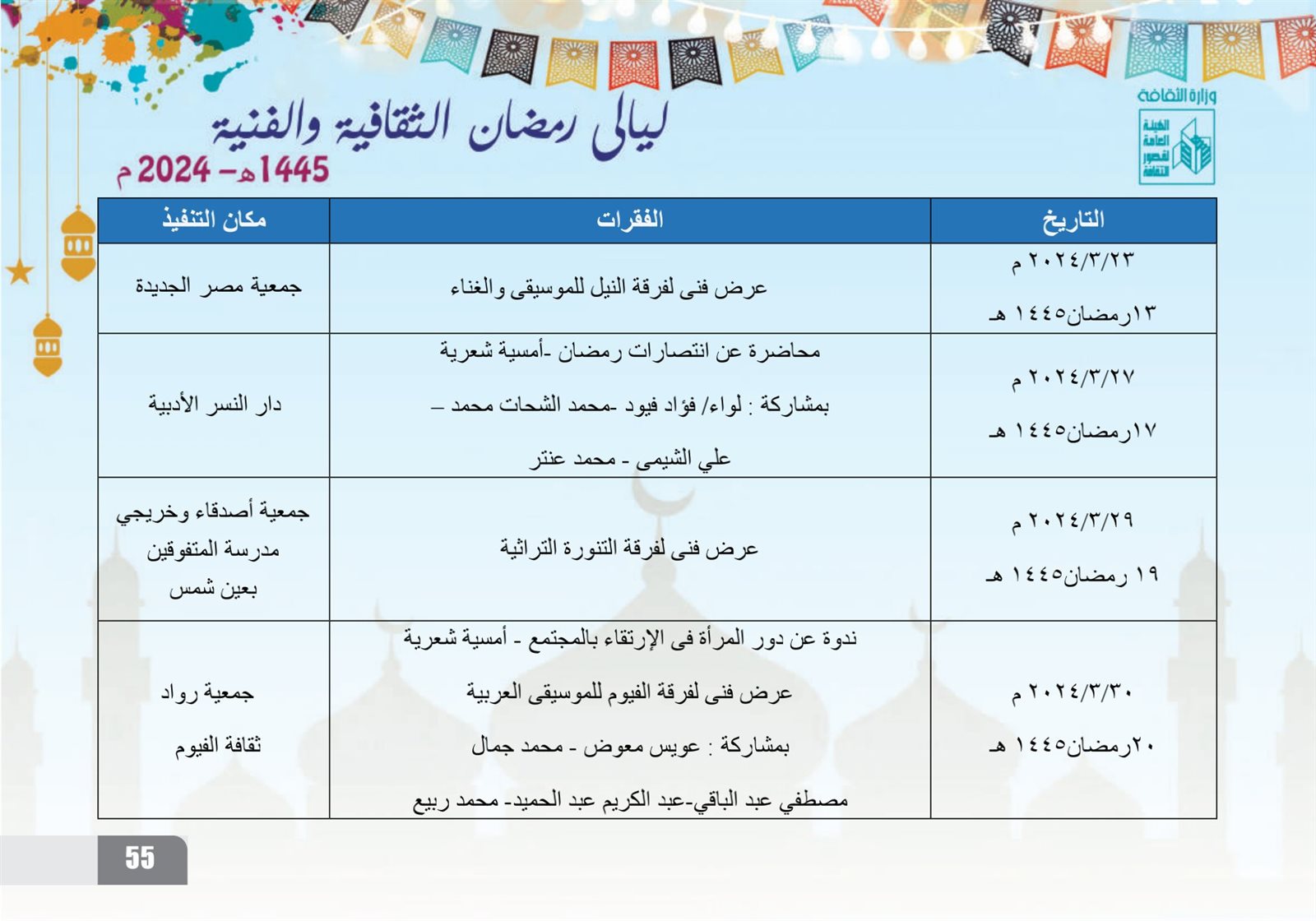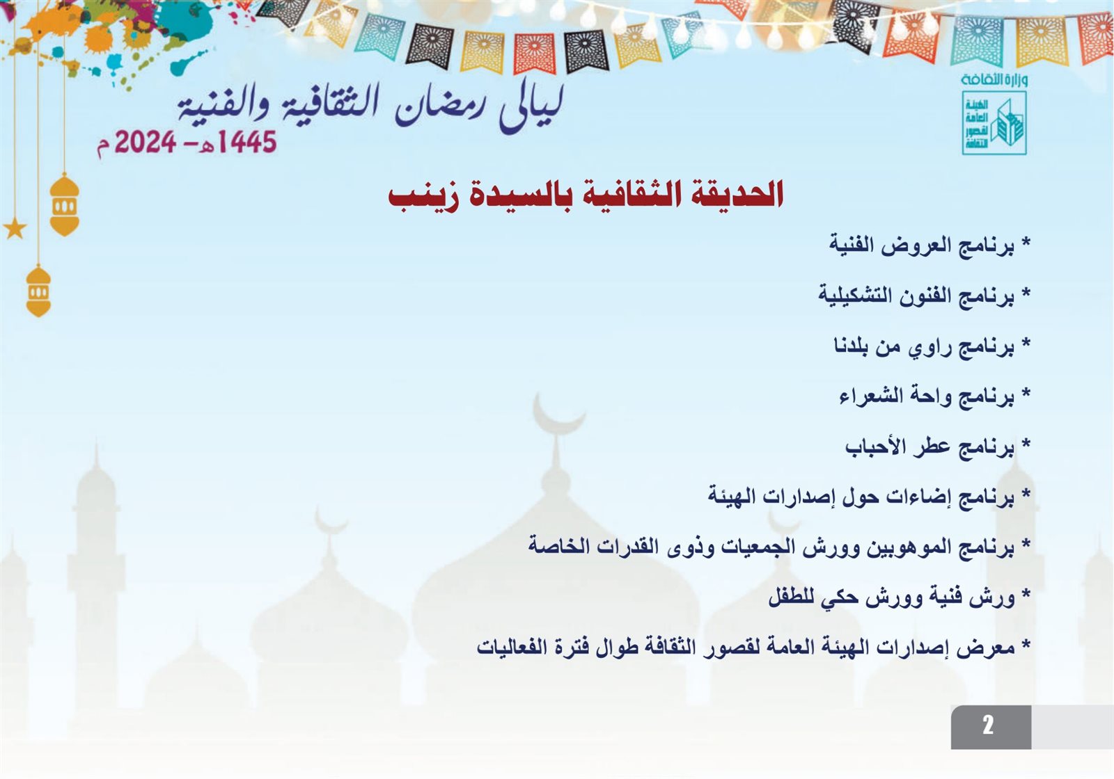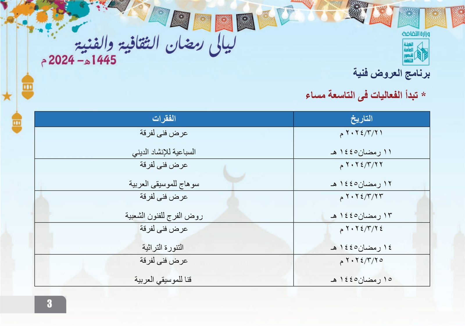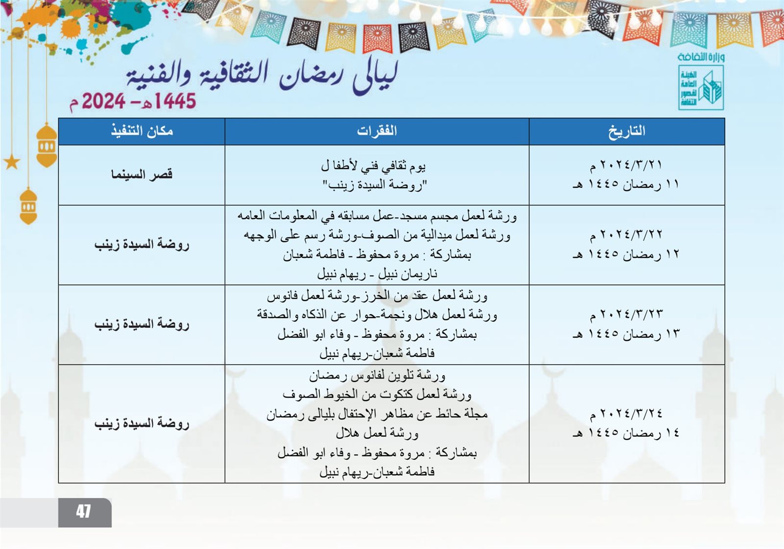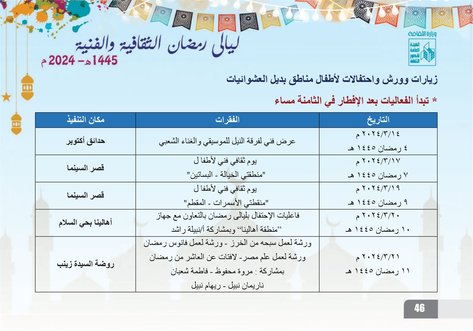 تنشر بوابة الوفد الالكترونية البرنامج التفصيلي لاحتفالات الهيئة العامة لقصور الثقافة "ليالي رمضان الثقافية والفنية" 1445ه - 2024م بقصر ثقافة روض الفرج والحديقة الثقافية بالسيدة زينب ومسرح السامر وقصر السينما وغيرها من المواقع.