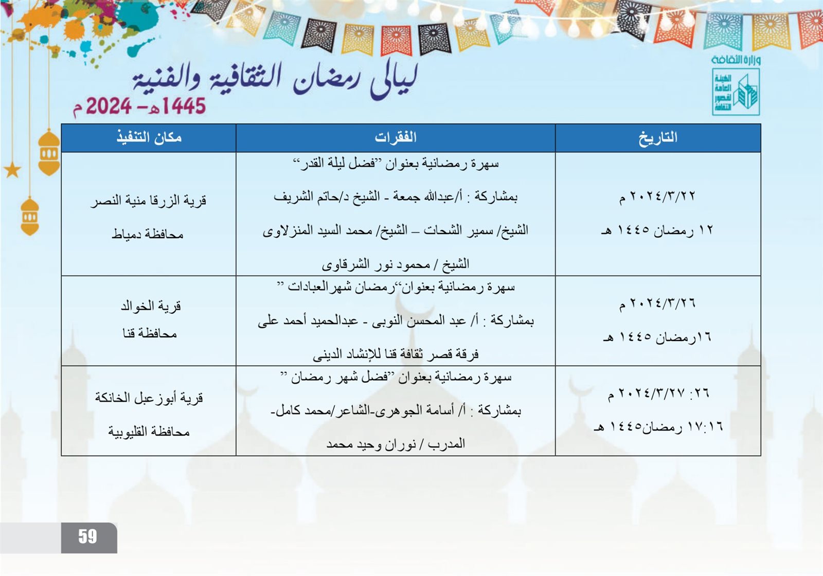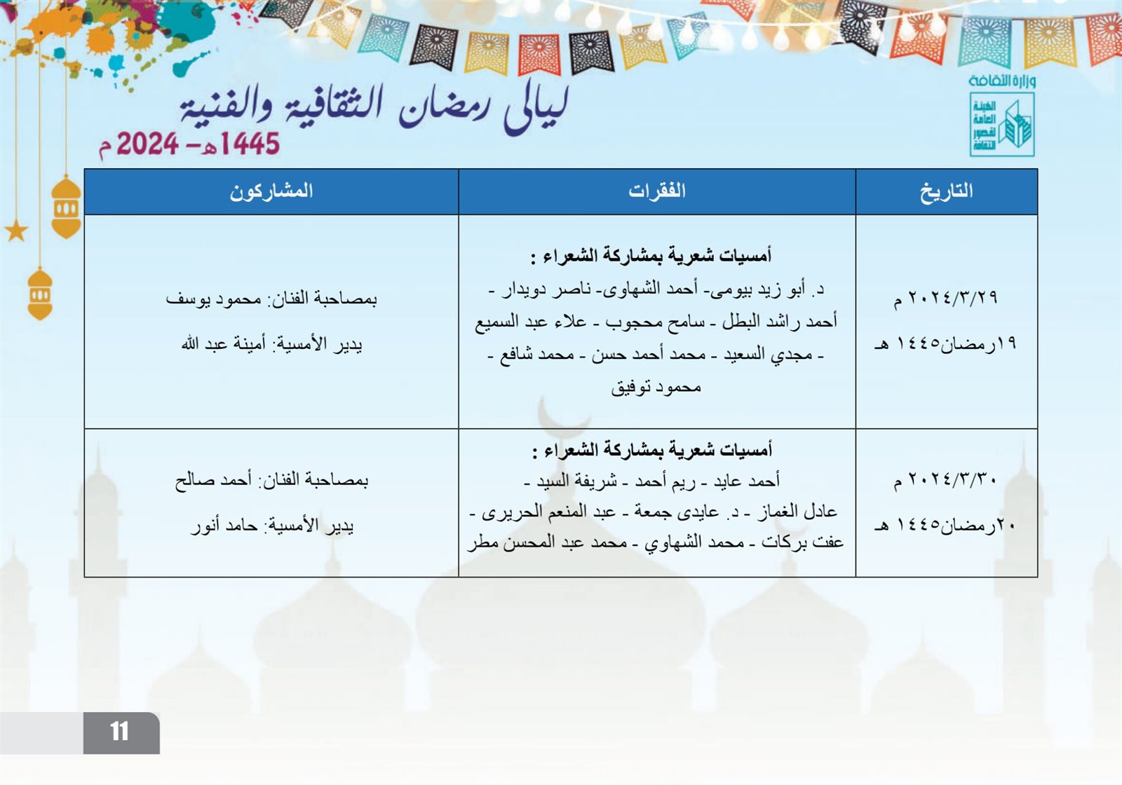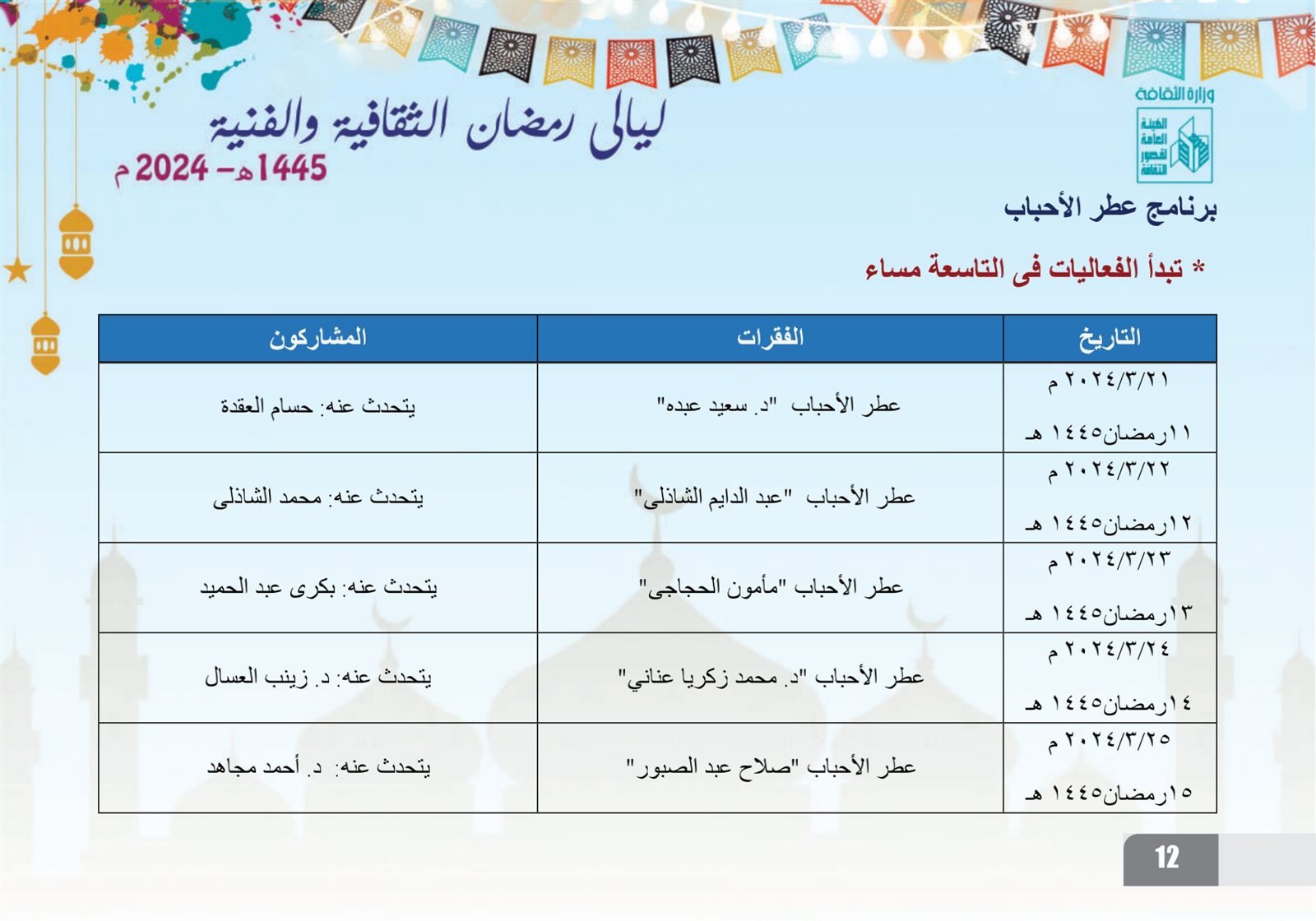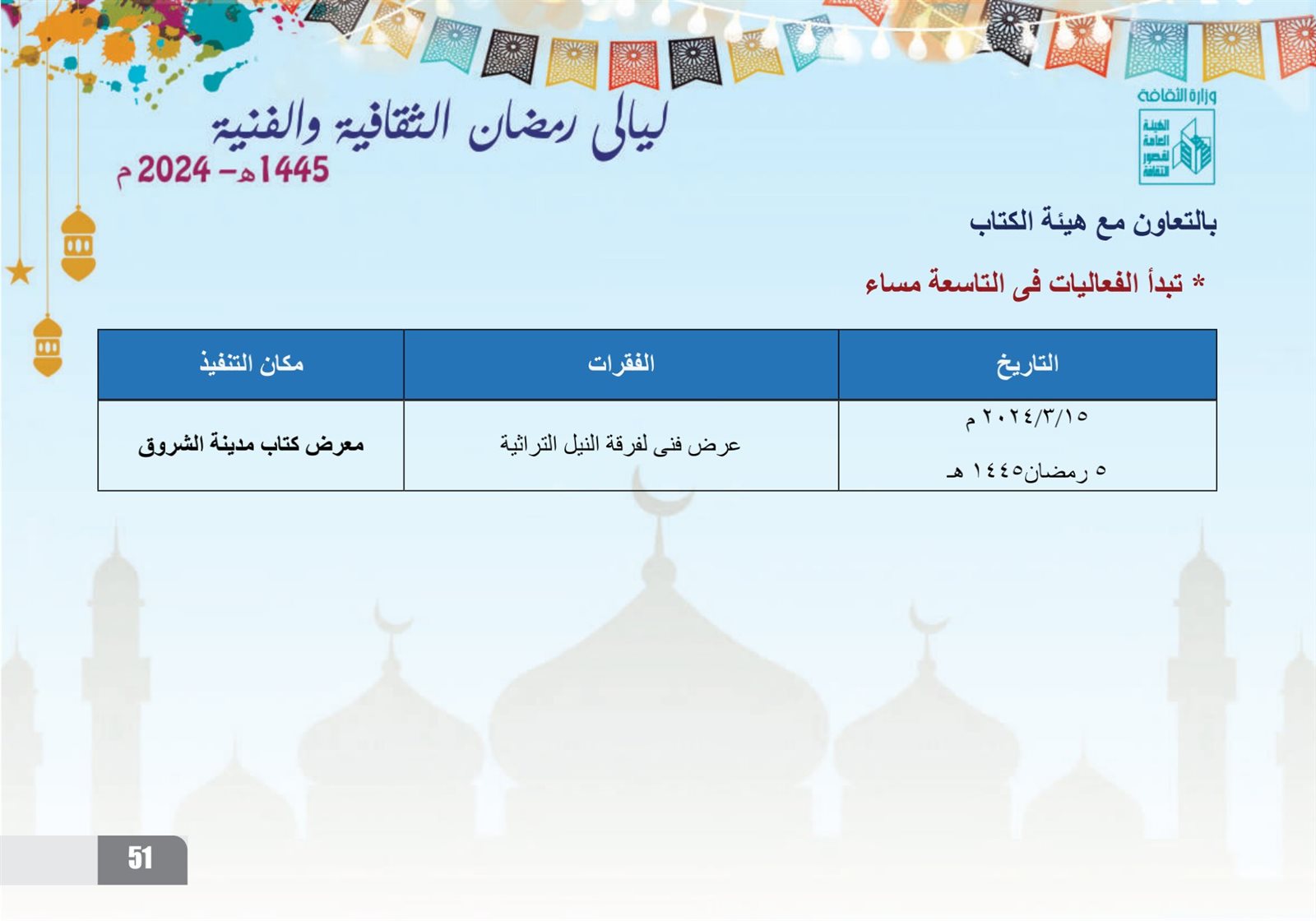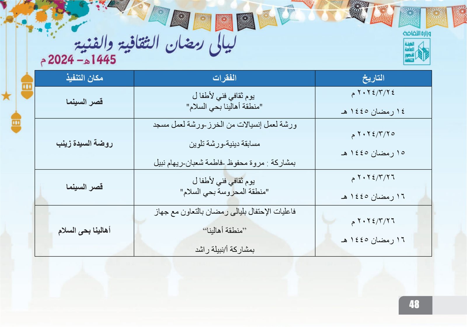 تنشر بوابة الوفد الالكترونية البرنامج التفصيلي لاحتفالات الهيئة العامة لقصور الثقافة "ليالي رمضان الثقافية والفنية" 1445ه - 2024م بقصر ثقافة روض الفرج والحديقة الثقافية بالسيدة زينب ومسرح السامر وقصر السينما وغيرها من المواقع.