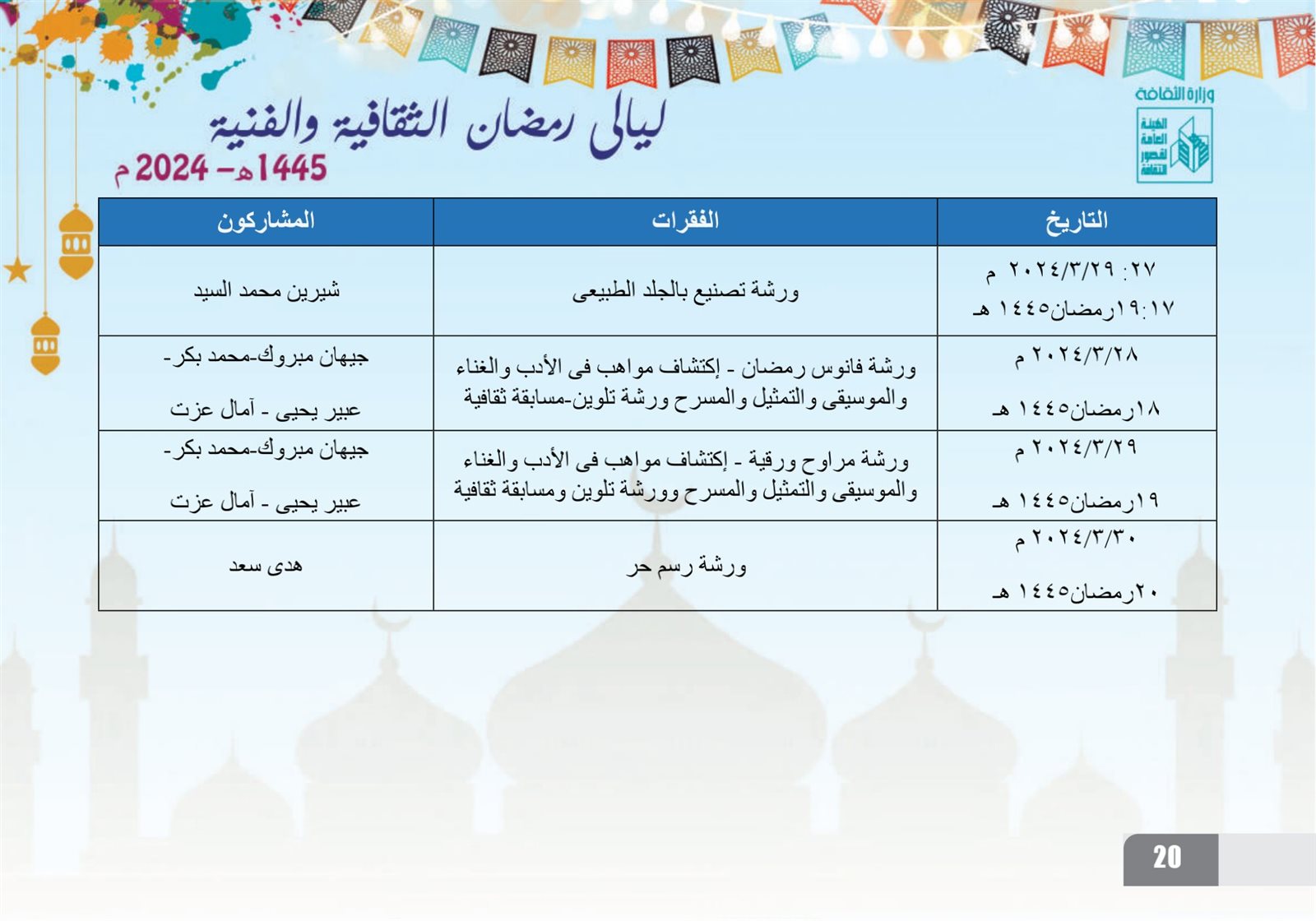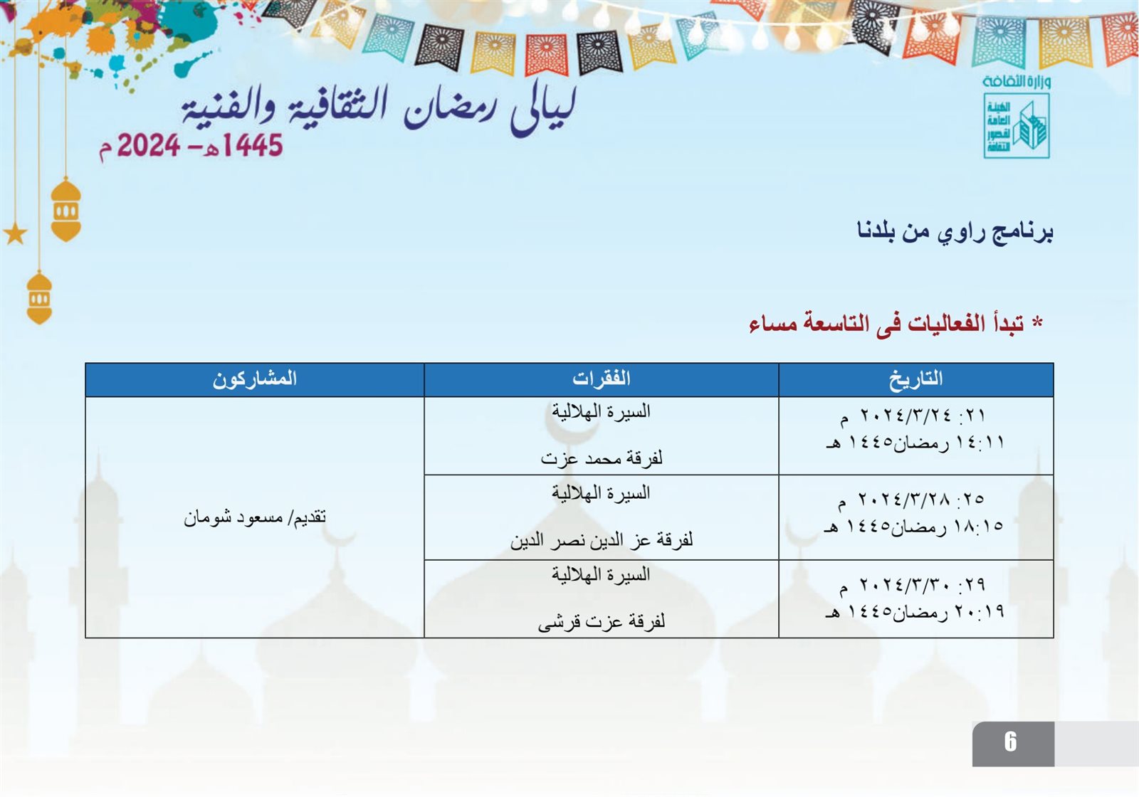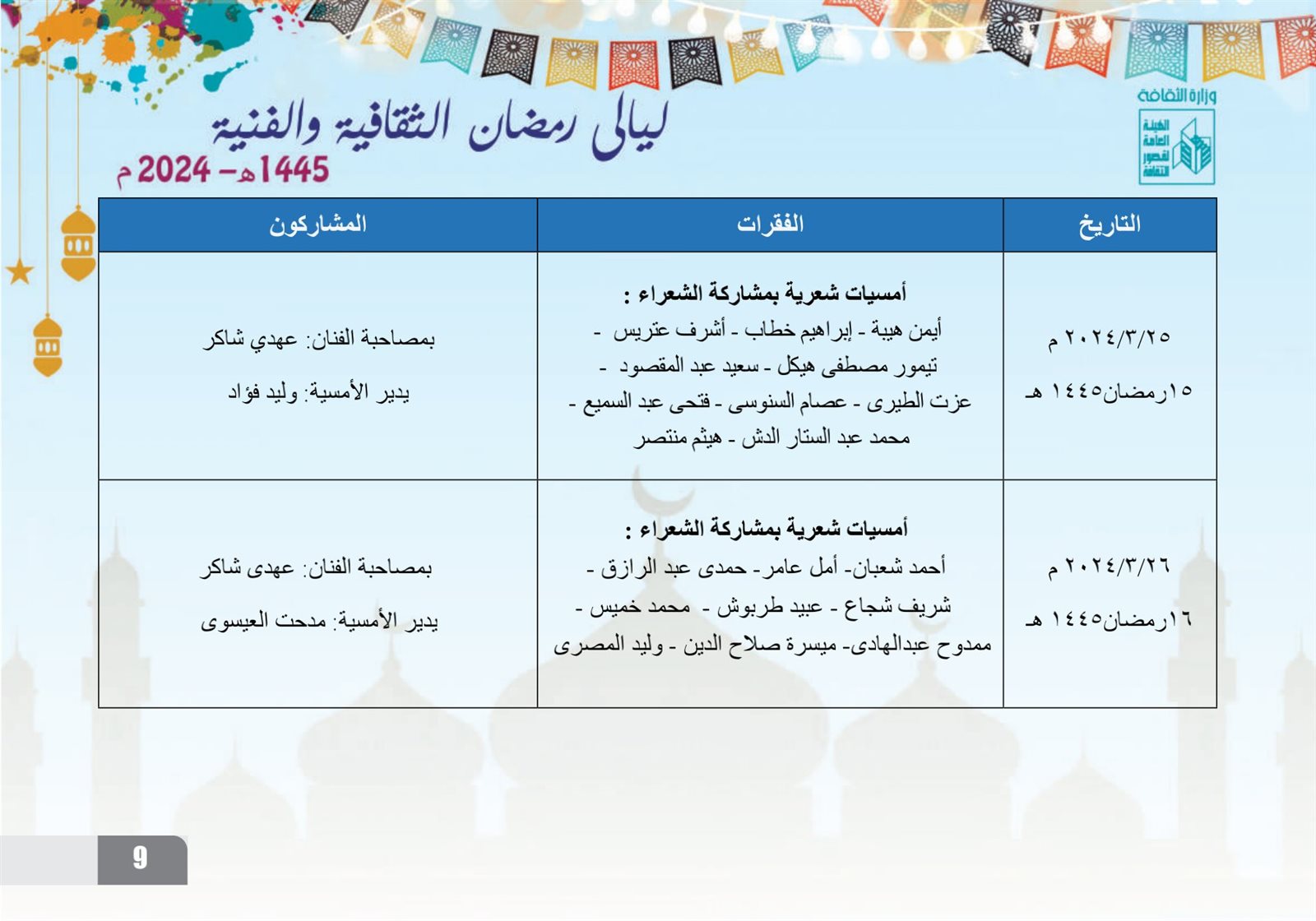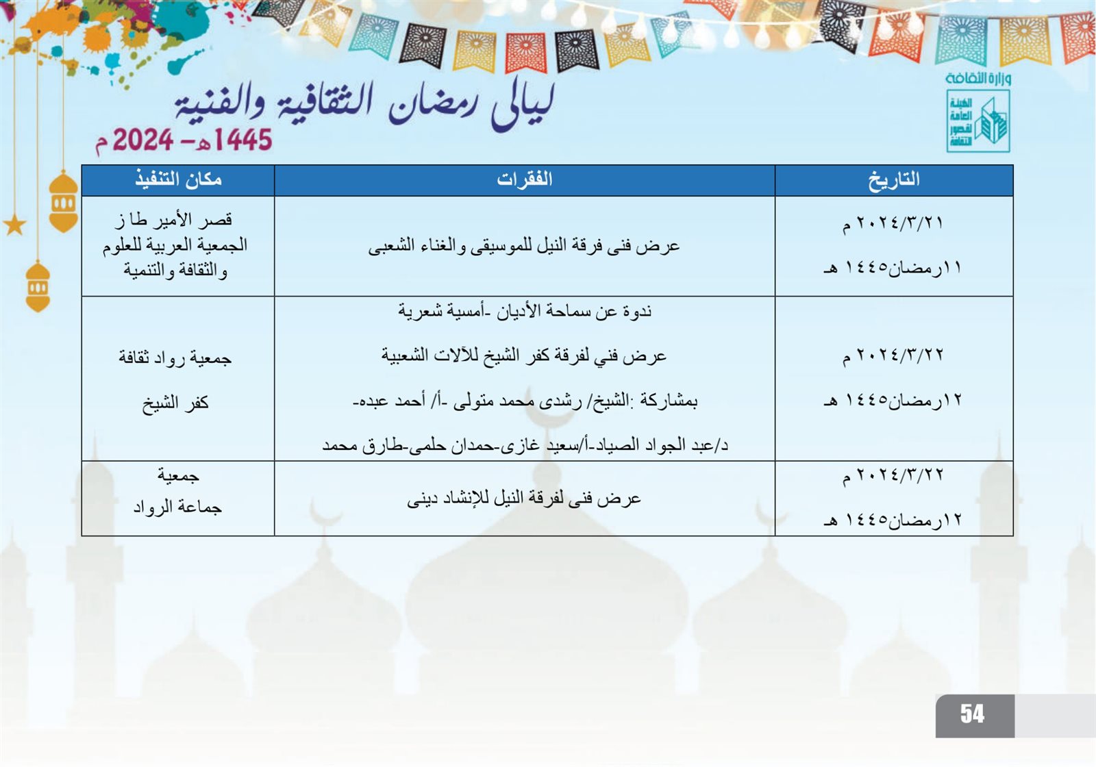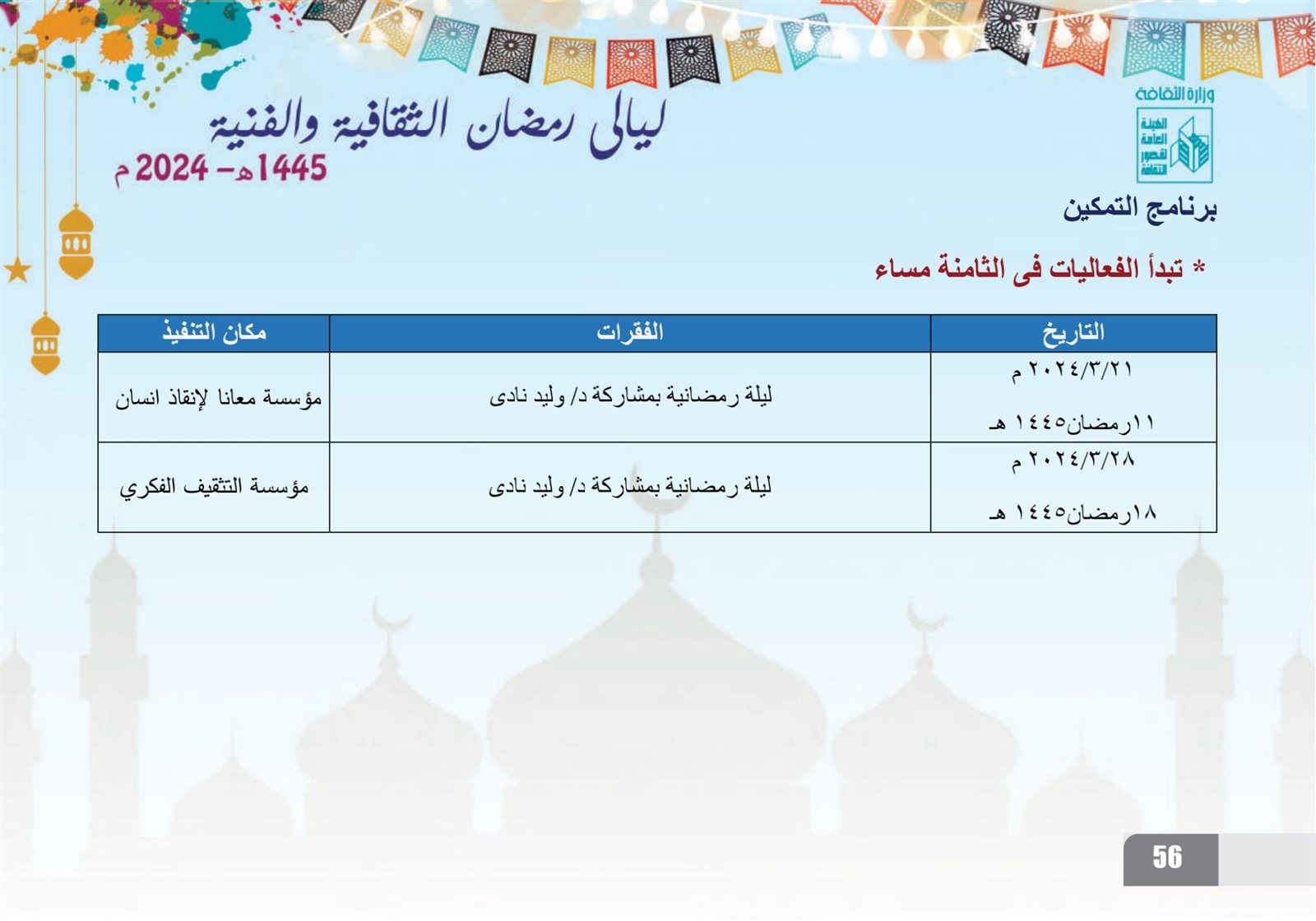 تنشر بوابة الوفد الالكترونية البرنامج التفصيلي لاحتفالات الهيئة العامة لقصور الثقافة "ليالي رمضان الثقافية والفنية" 1445ه - 2024م بقصر ثقافة روض الفرج والحديقة الثقافية بالسيدة زينب ومسرح السامر وقصر السينما وغيرها من المواقع.