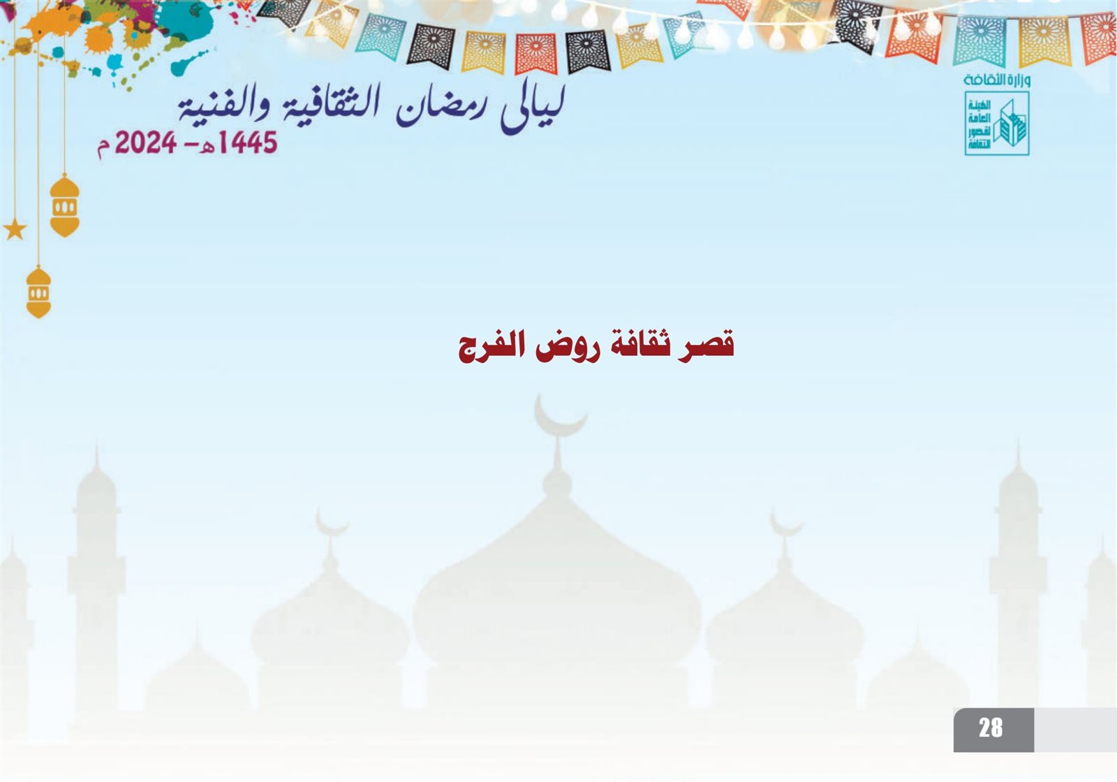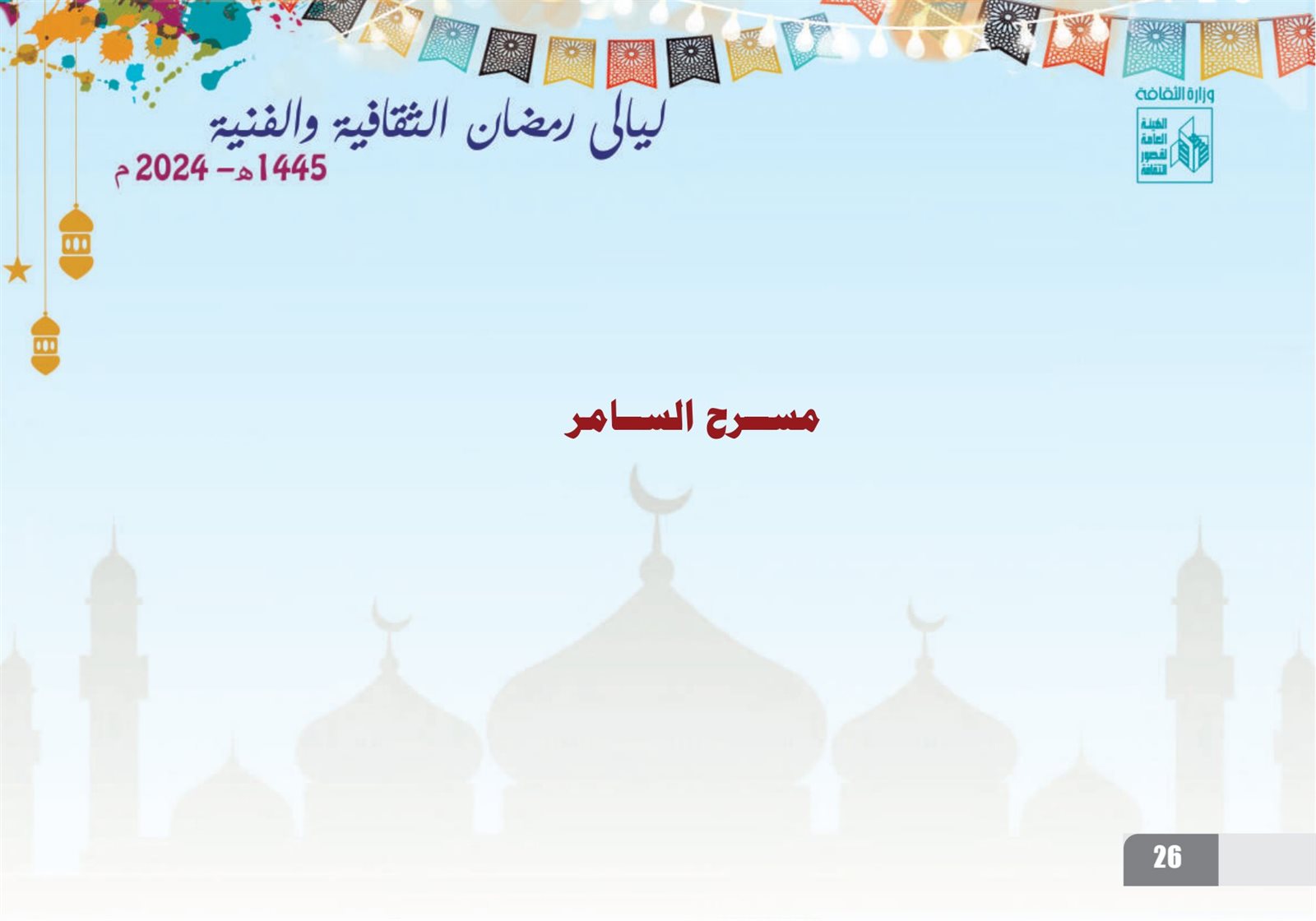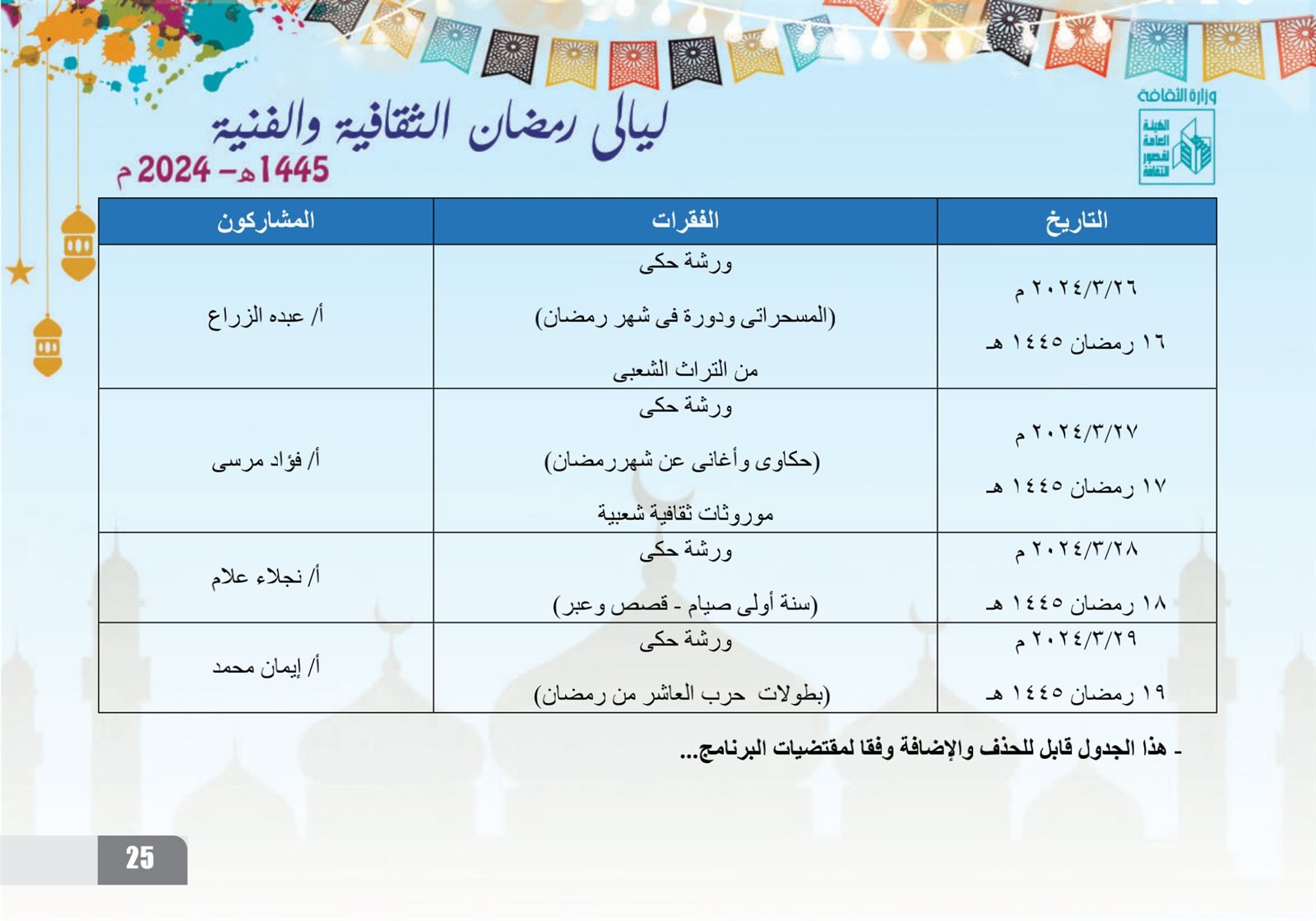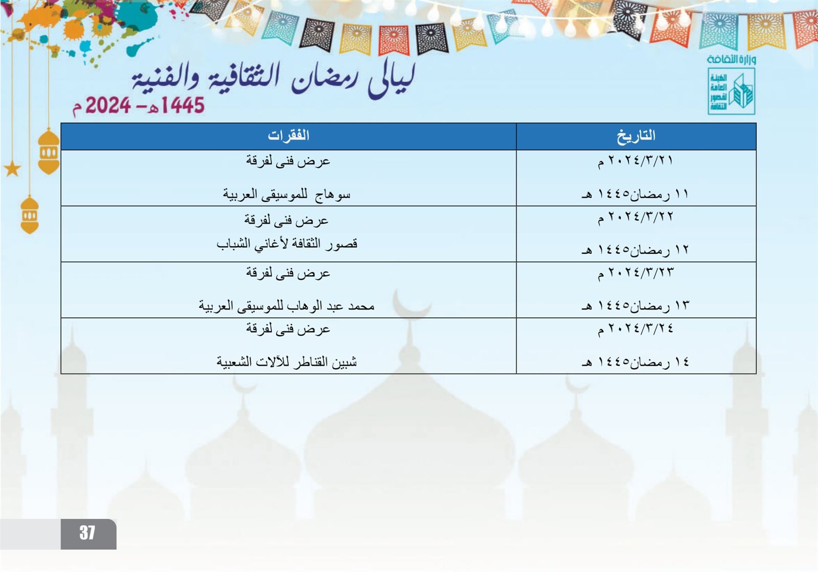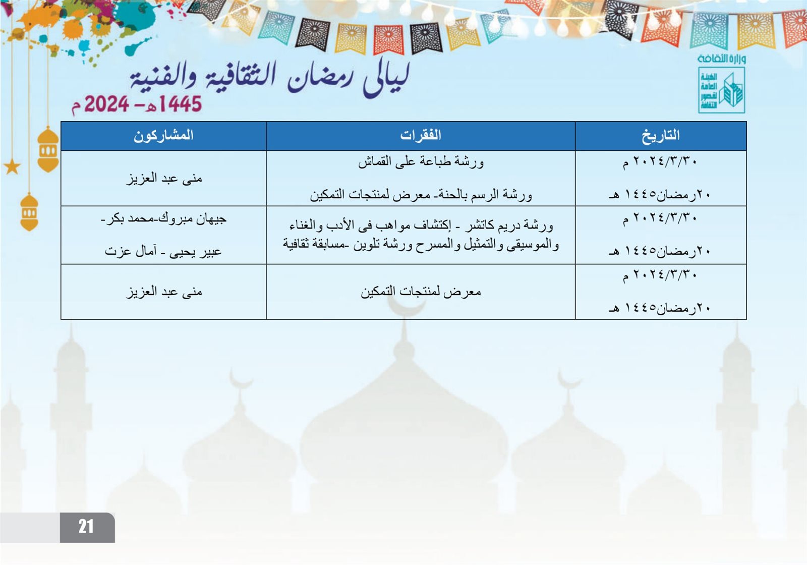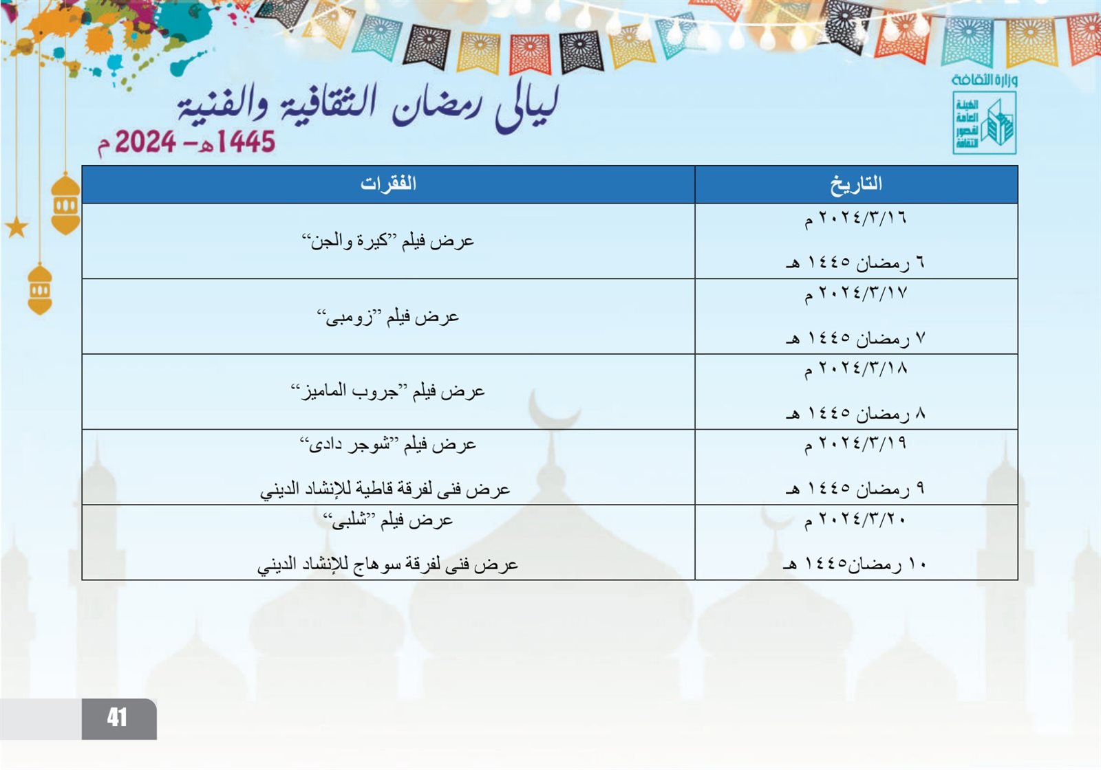 تنشر بوابة الوفد الالكترونية البرنامج التفصيلي لاحتفالات الهيئة العامة لقصور الثقافة "ليالي رمضان الثقافية والفنية" 1445ه - 2024م بقصر ثقافة روض الفرج والحديقة الثقافية بالسيدة زينب ومسرح السامر وقصر السينما وغيرها من المواقع.