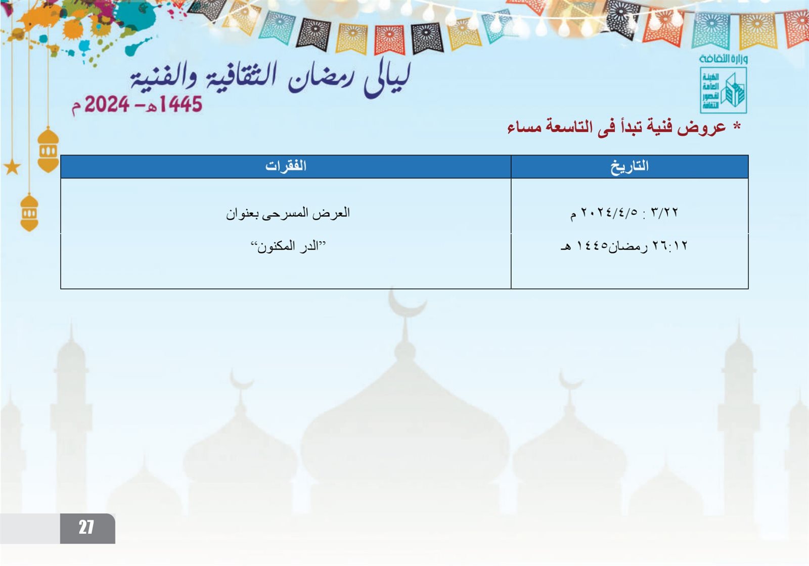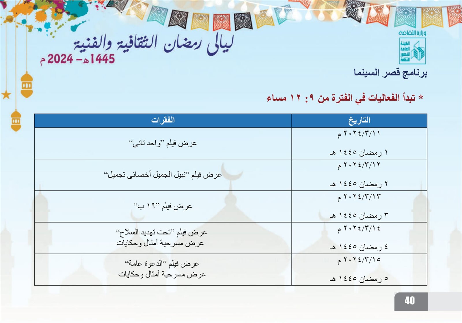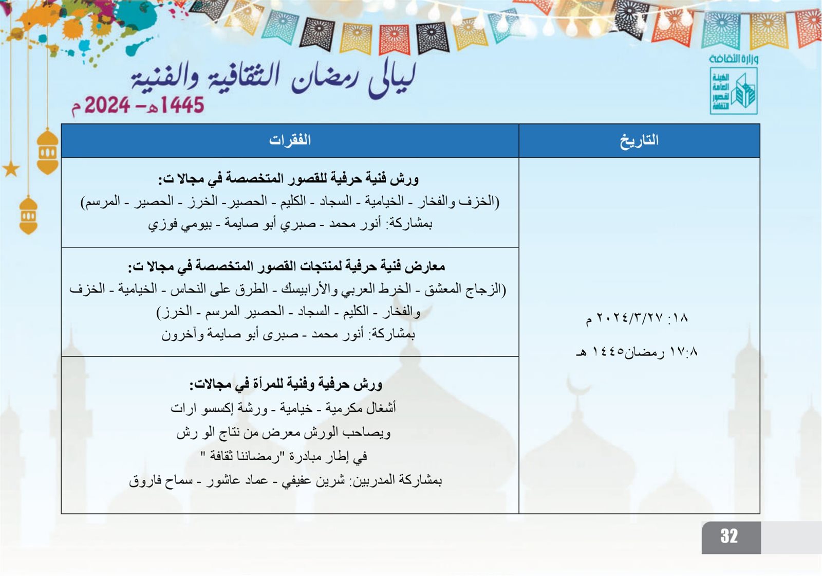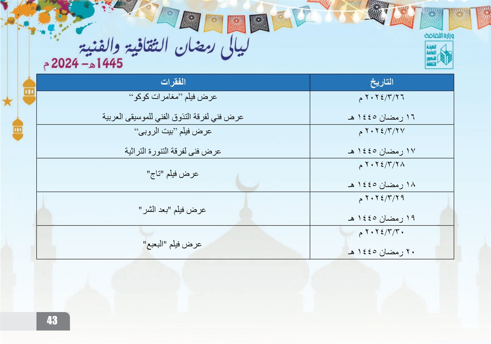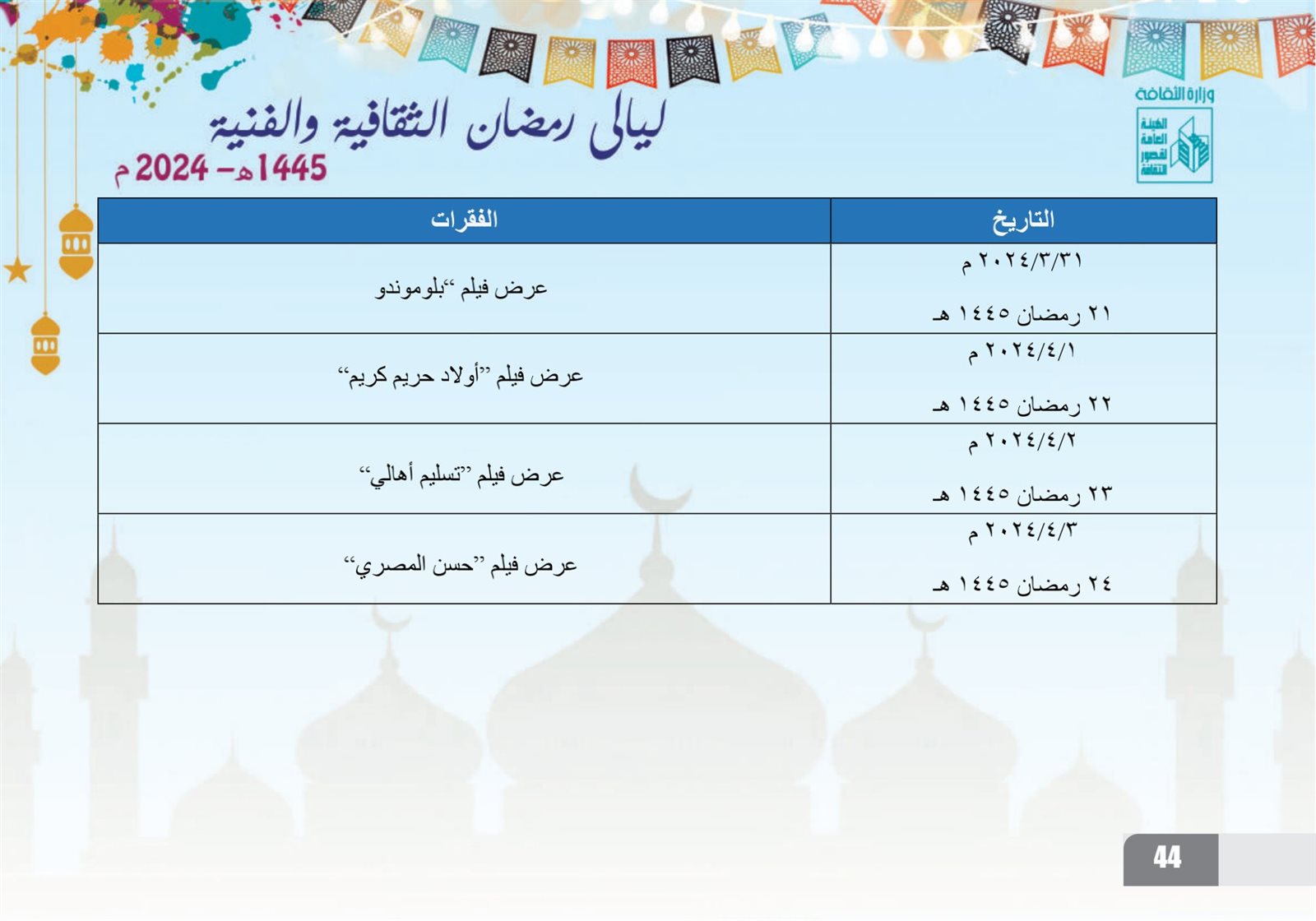 تنشر بوابة الوفد الالكترونية البرنامج التفصيلي لاحتفالات الهيئة العامة لقصور الثقافة "ليالي رمضان الثقافية والفنية" 1445ه - 2024م بقصر ثقافة روض الفرج والحديقة الثقافية بالسيدة زينب ومسرح السامر وقصر السينما وغيرها من المواقع.