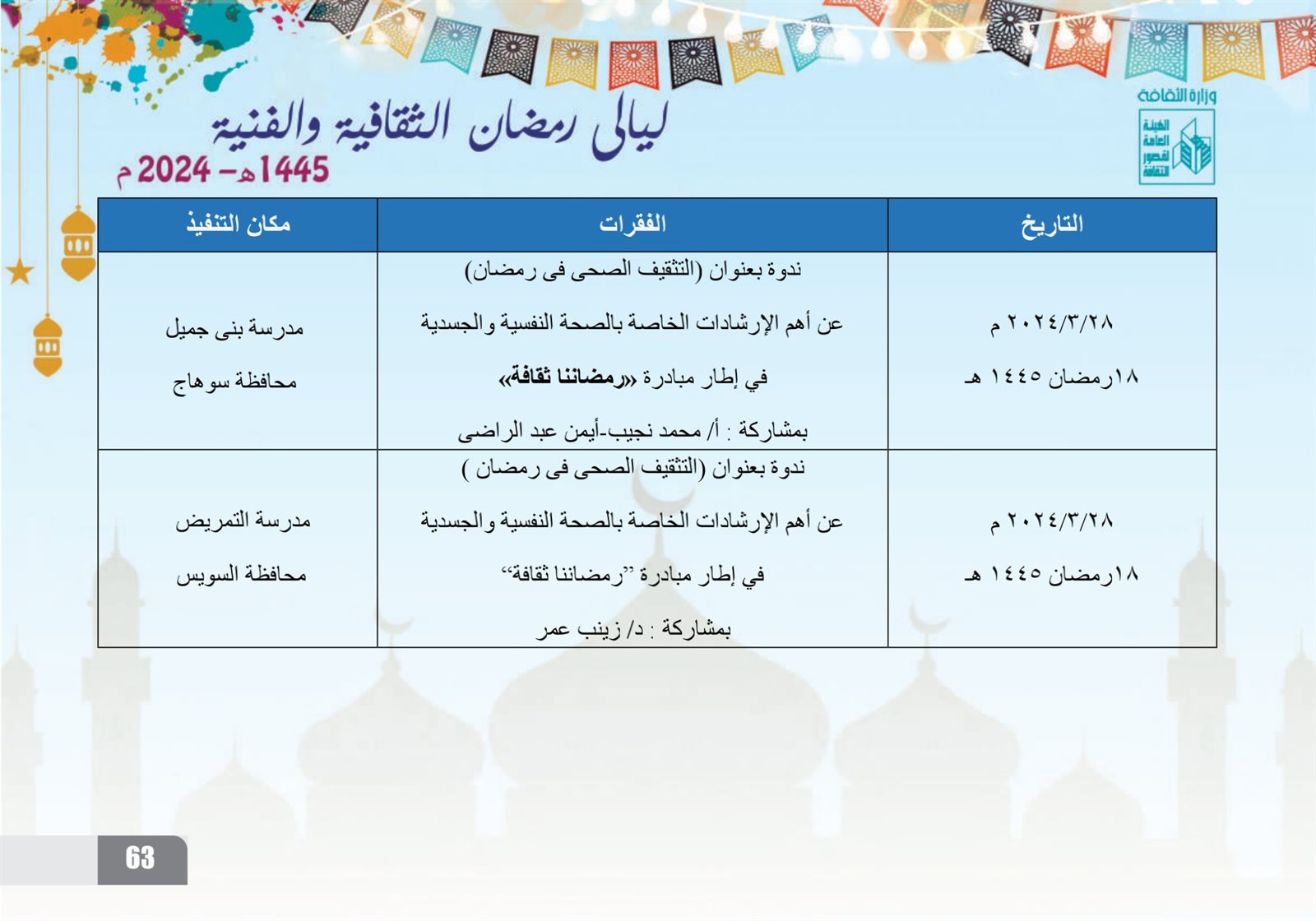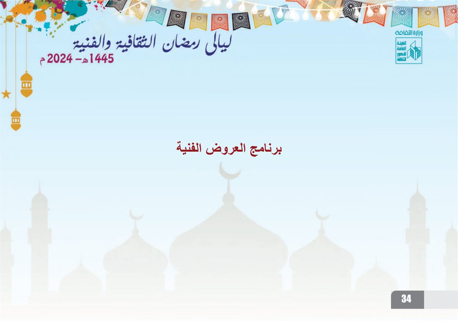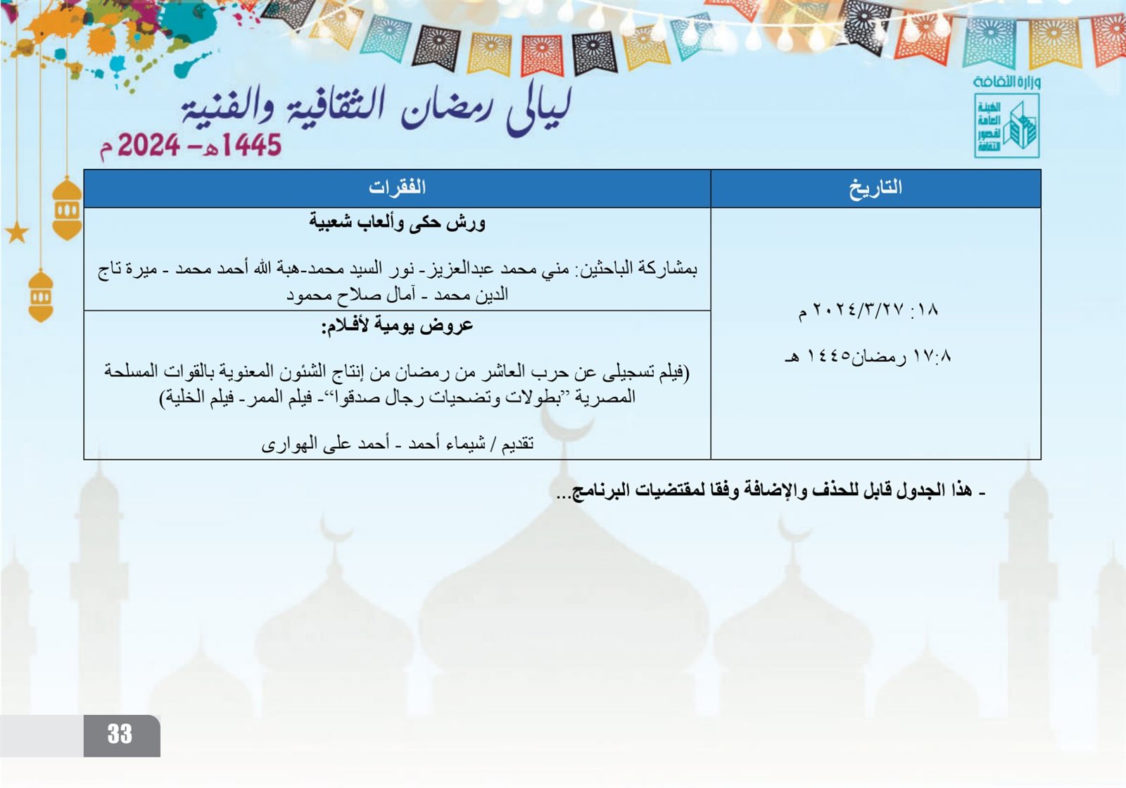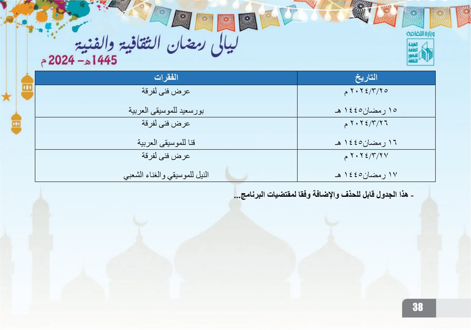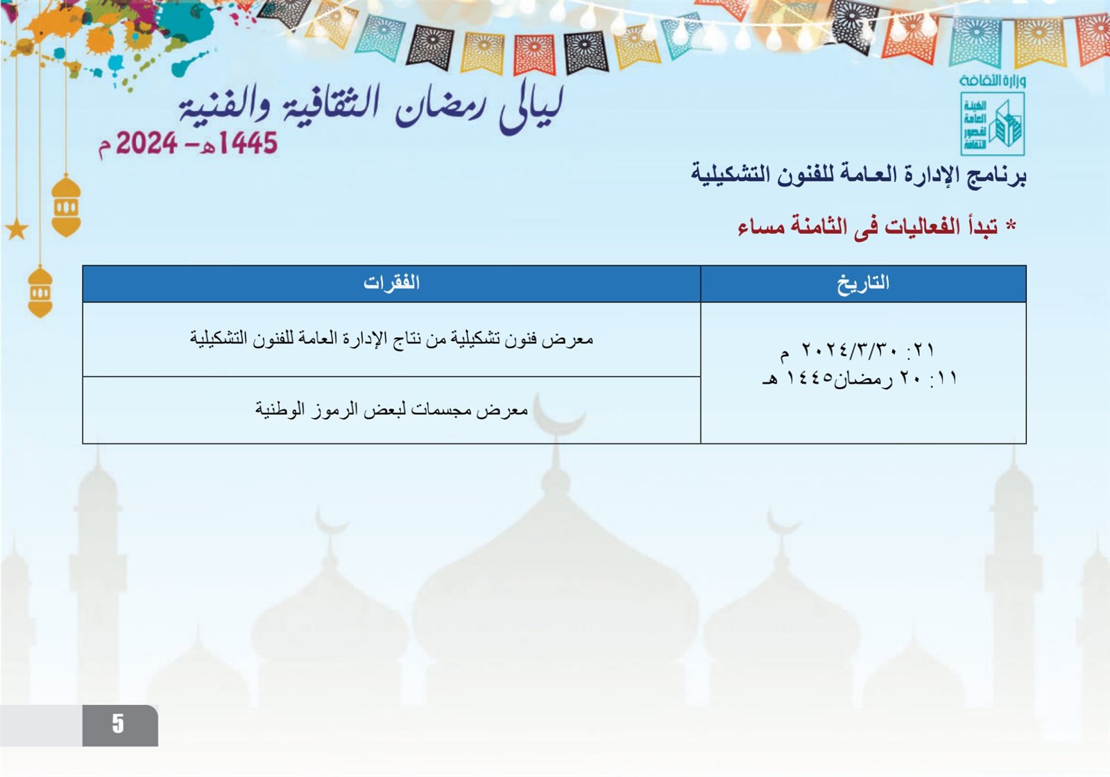 تنشر بوابة الوفد الالكترونية البرنامج التفصيلي لاحتفالات الهيئة العامة لقصور الثقافة "ليالي رمضان الثقافية والفنية" 1445ه - 2024م بقصر ثقافة روض الفرج والحديقة الثقافية بالسيدة زينب ومسرح السامر وقصر السينما وغيرها من المواقع.