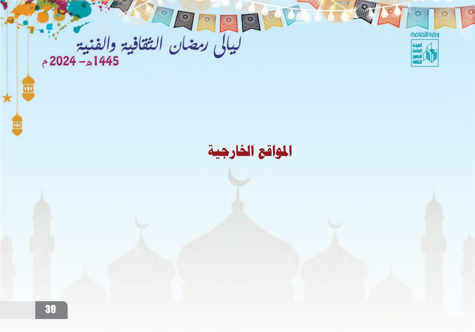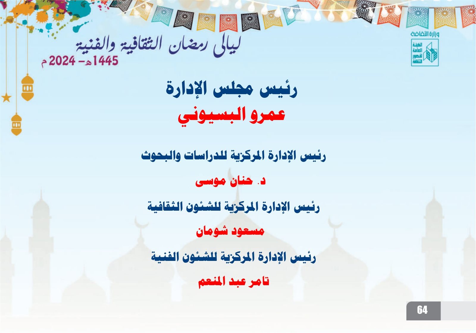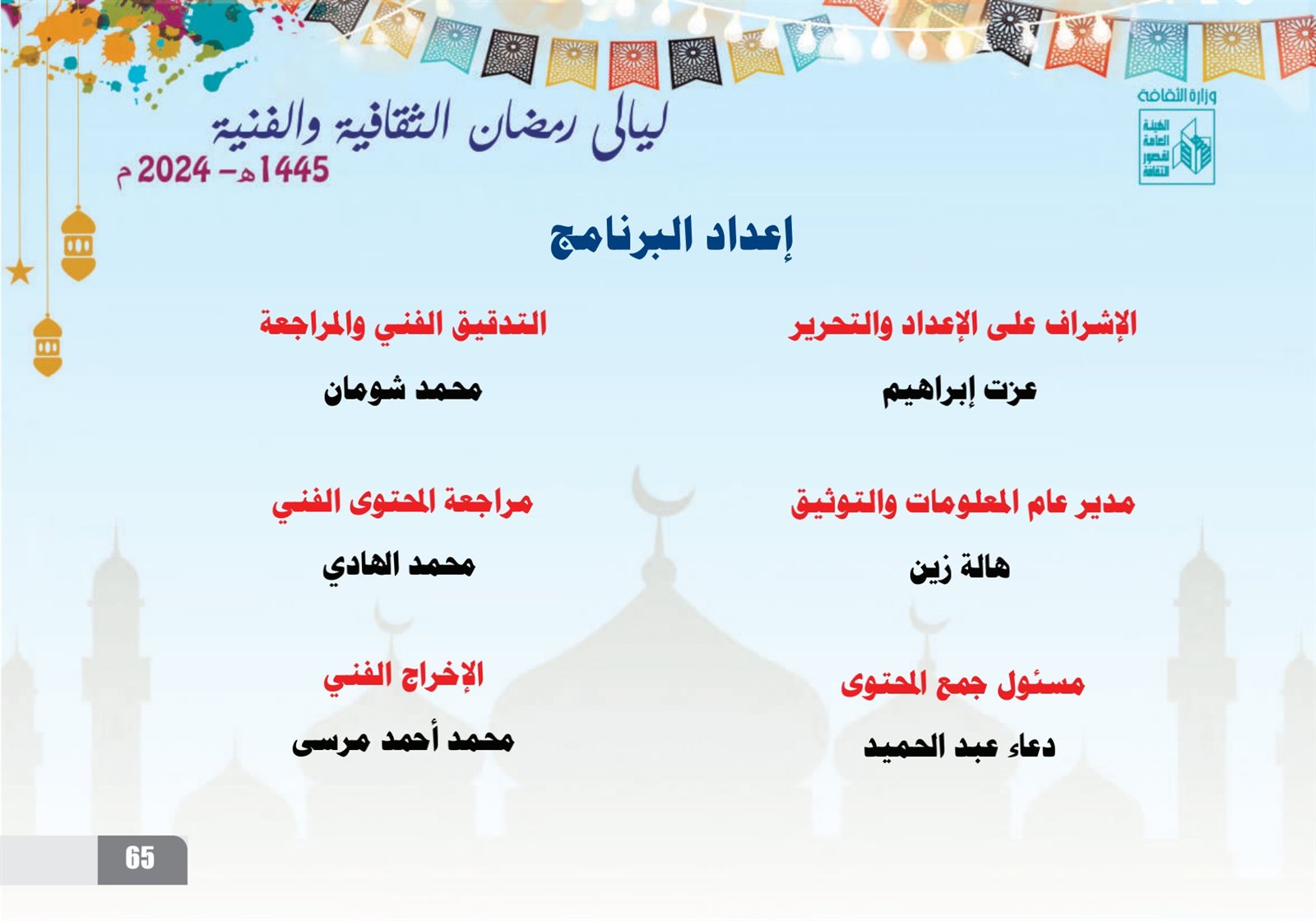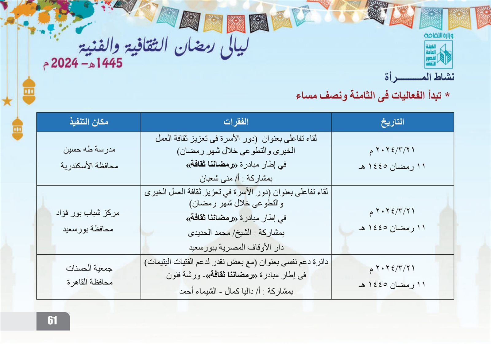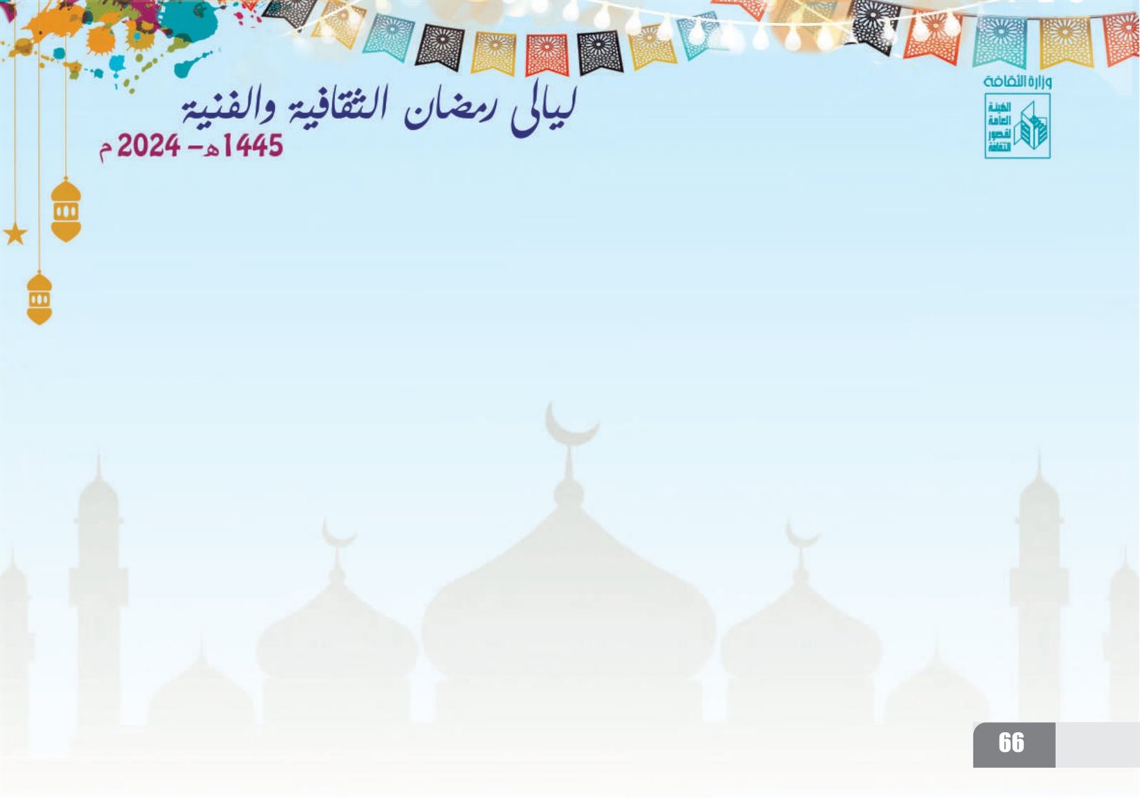 تنشر بوابة الوفد الالكترونية البرنامج التفصيلي لاحتفالات الهيئة العامة لقصور الثقافة "ليالي رمضان الثقافية والفنية" 1445ه - 2024م بقصر ثقافة روض الفرج والحديقة الثقافية بالسيدة زينب ومسرح السامر وقصر السينما وغيرها من المواقع.