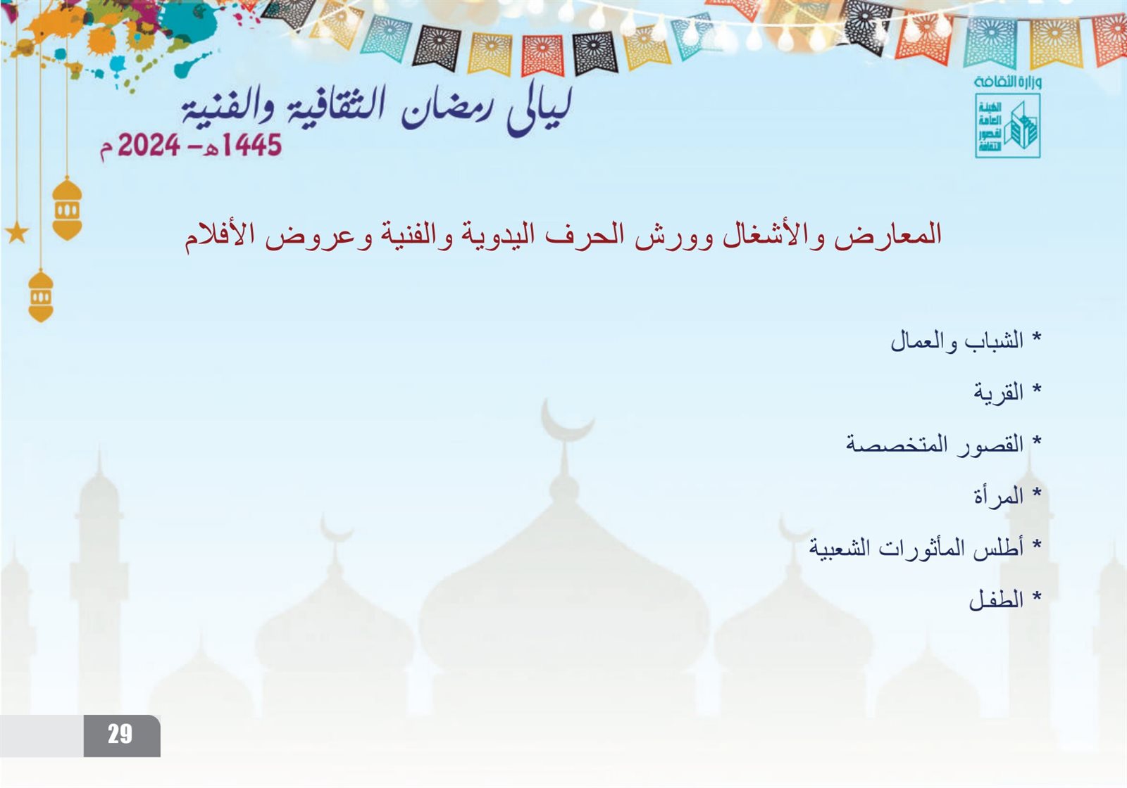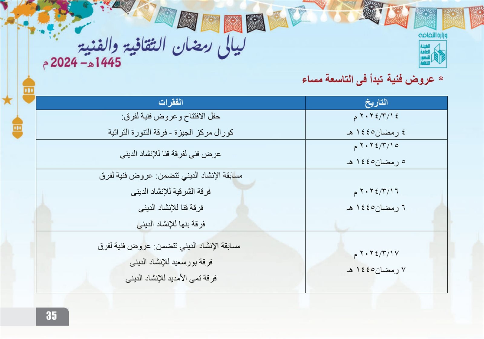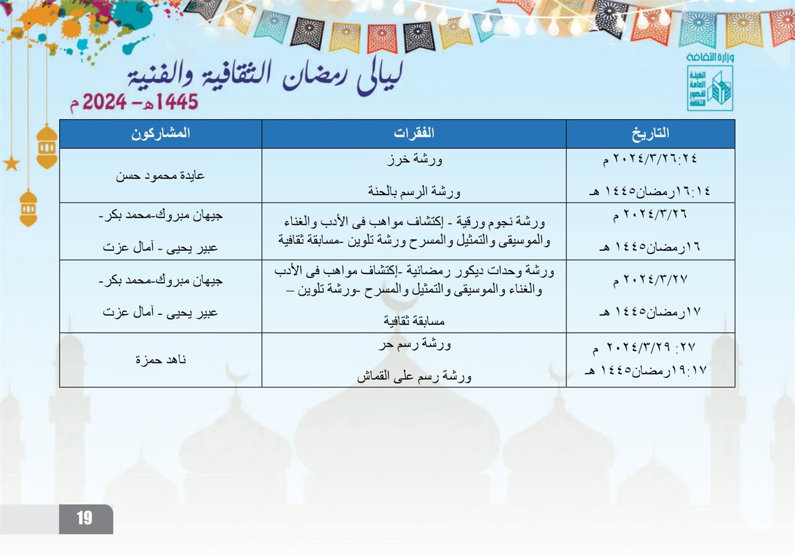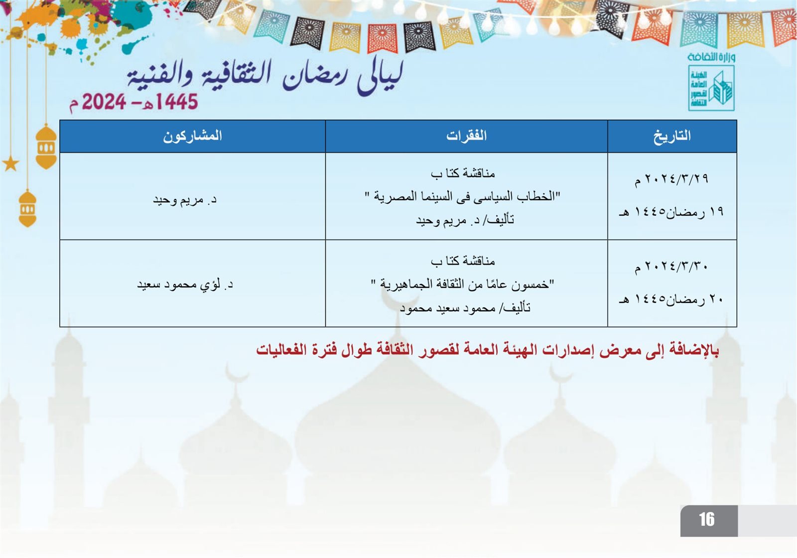 وتنظم هيئة قصور الثقافة، برنامجًا يضم عددًا كبيرا من الفعاليات الثقافية والفنية على مدار شهر رمضان، عبر برنامجها السنوي "ليالي رمضان الثقافية والفنية"، بالقاهرة والمحافظات، يتضمن فعاليات تتنوع بين العروض الفنية والسيرة الهلالية وعروض المسرح والأمسيات الثقافية واللقاءات والورش الحرفية ومعارض الكتب والفنون، وغيرها.