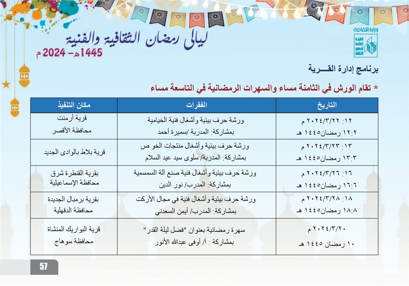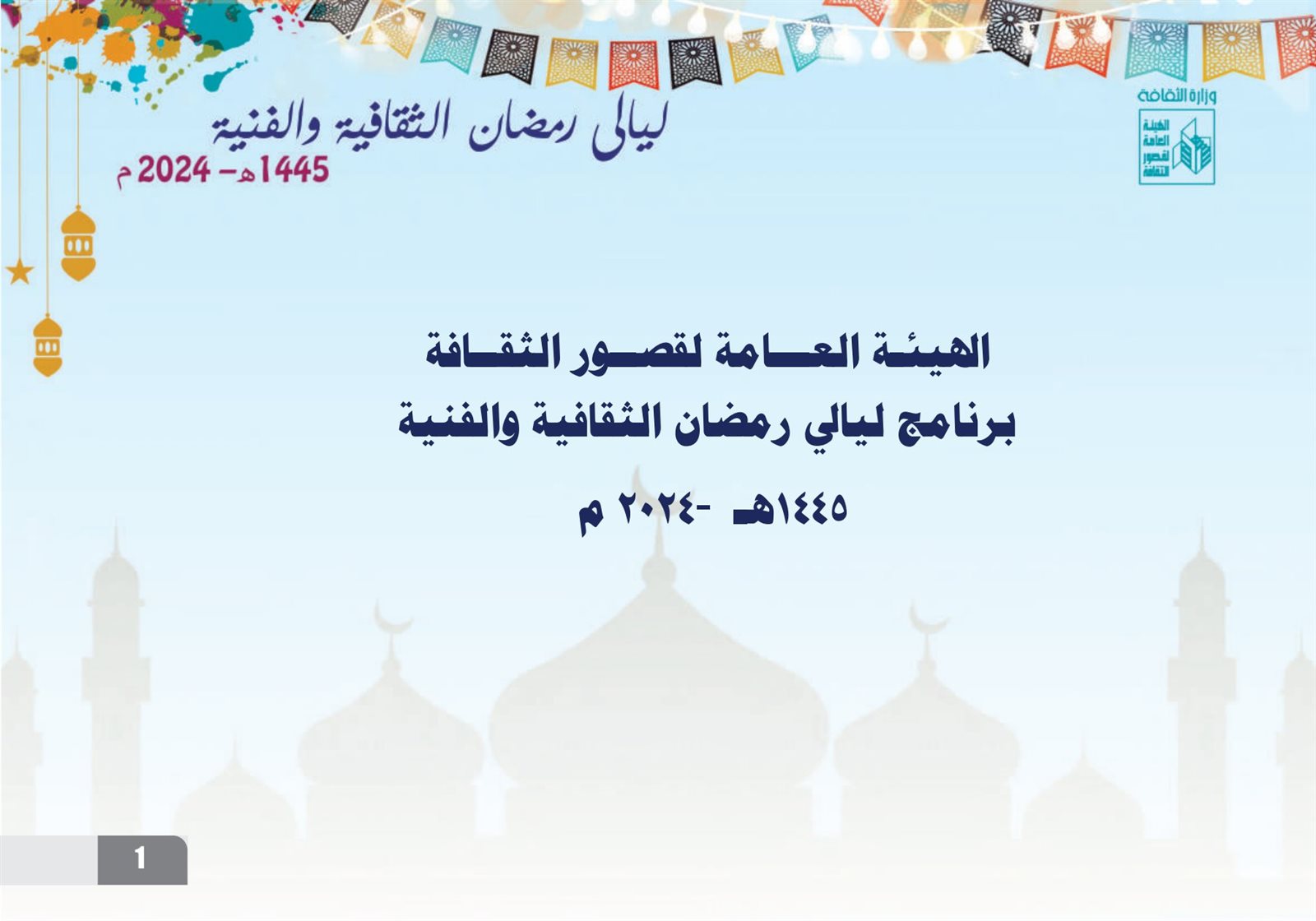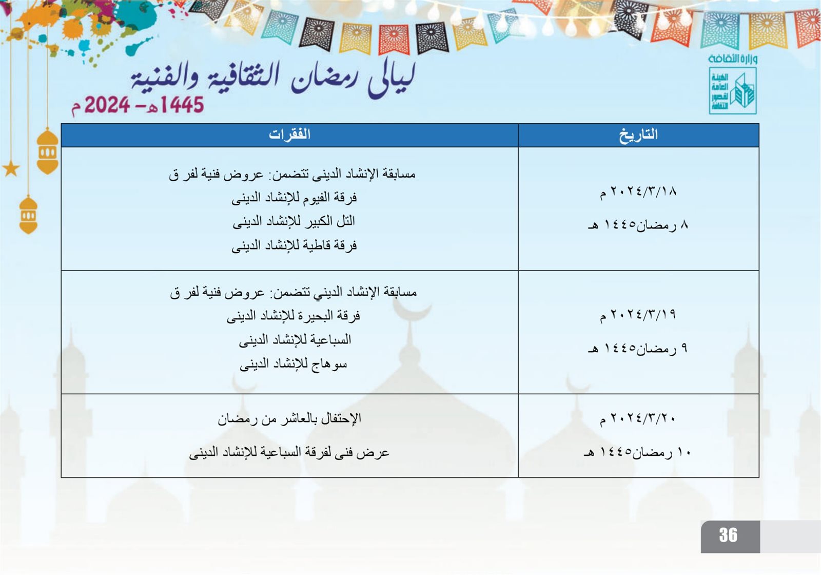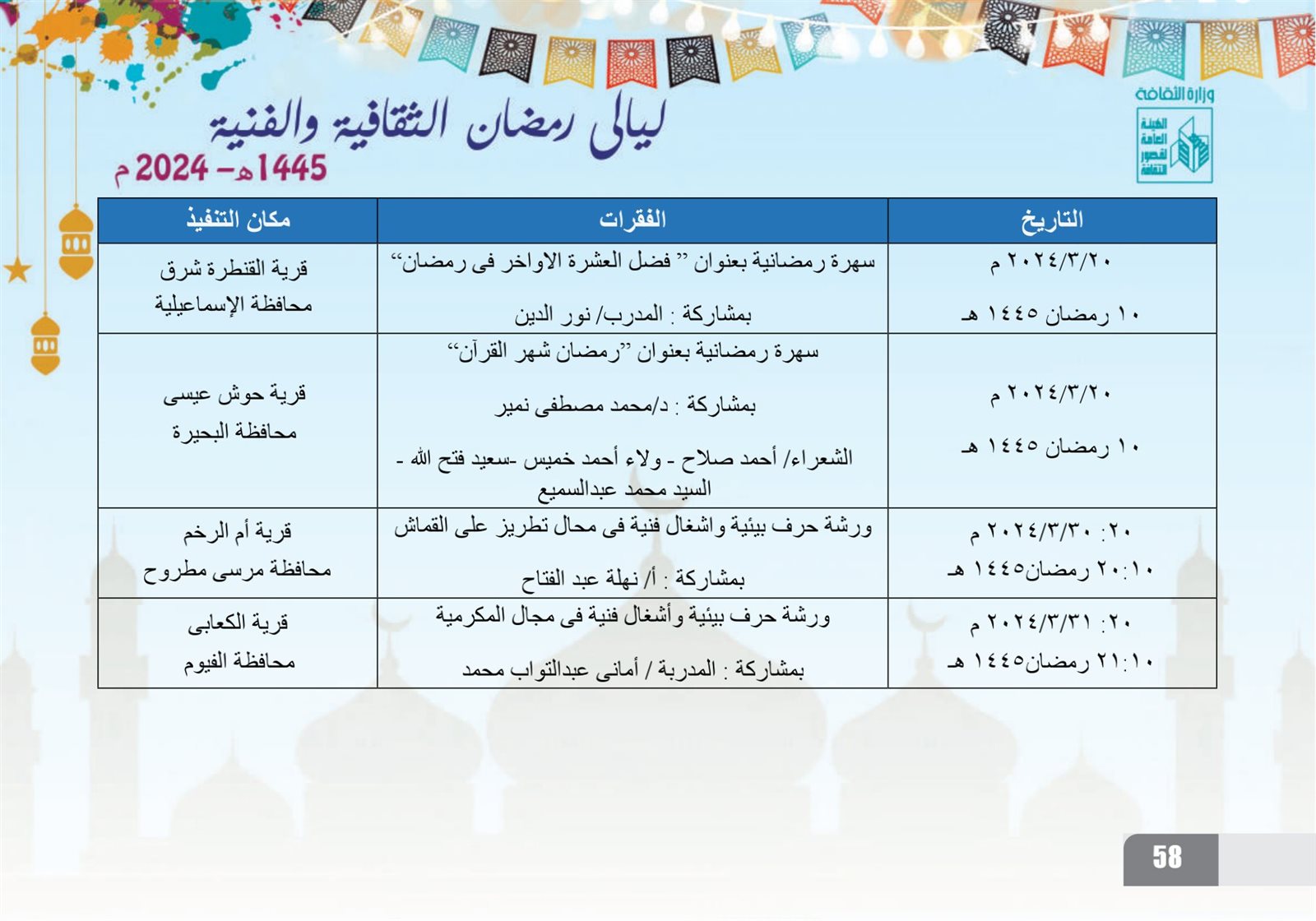 وتنظم هيئة قصور الثقافة، برنامجًا يضم عددًا كبيرا من الفعاليات الثقافية والفنية على مدار شهر رمضان، عبر برنامجها السنوي "ليالي رمضان الثقافية والفنية"، بالقاهرة والمحافظات، يتضمن فعاليات تتنوع بين العروض الفنية والسيرة الهلالية وعروض المسرح والأمسيات الثقافية واللقاءات والورش الحرفية ومعارض الكتب والفنون، وغيرها.