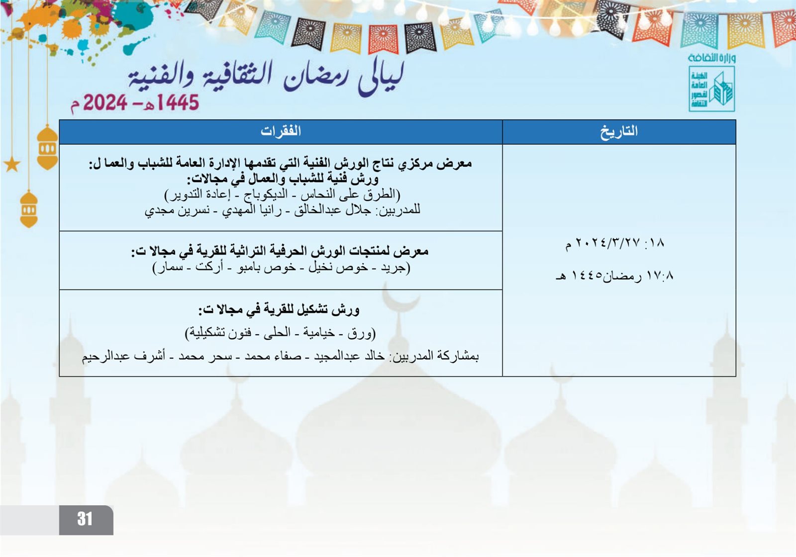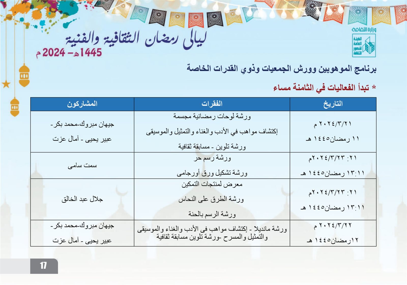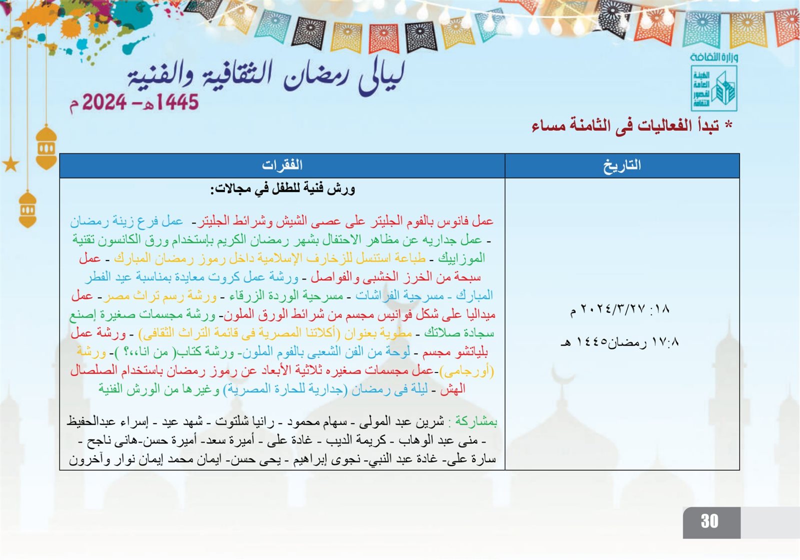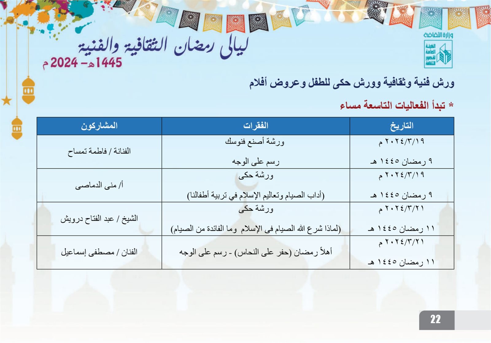 وتقدم عدة ورش فنية للأطفال عن أهم مظاهر رمضان في شكل جداريات، وميداليات، ومجسمات صغيرة، ومطويات، لوحات من الفن الشعبي، مجسمات ثلاثية الأبعاد، طباعة ستنسل. كما تعرض مسرحية الأطفال "الوردة الزرقاء"، و"الفراشات".