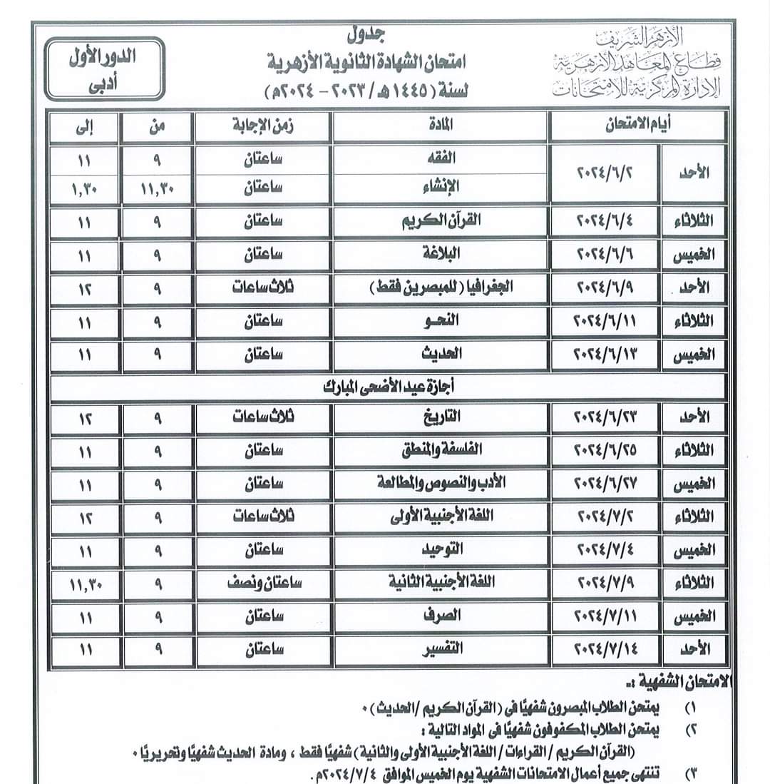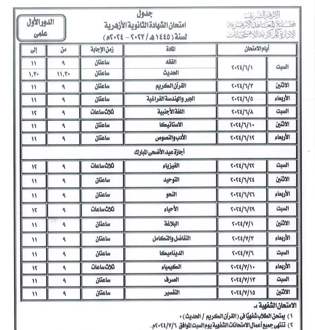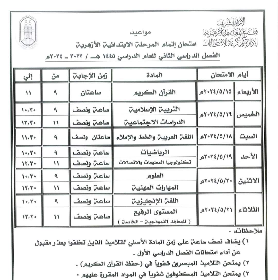 أعلن قطاع المعاهد الأزهرية، عن جدول الشهادة الابتدائية والإعدادية والثانوية الأزهرية لعام 2023 - 2024.
