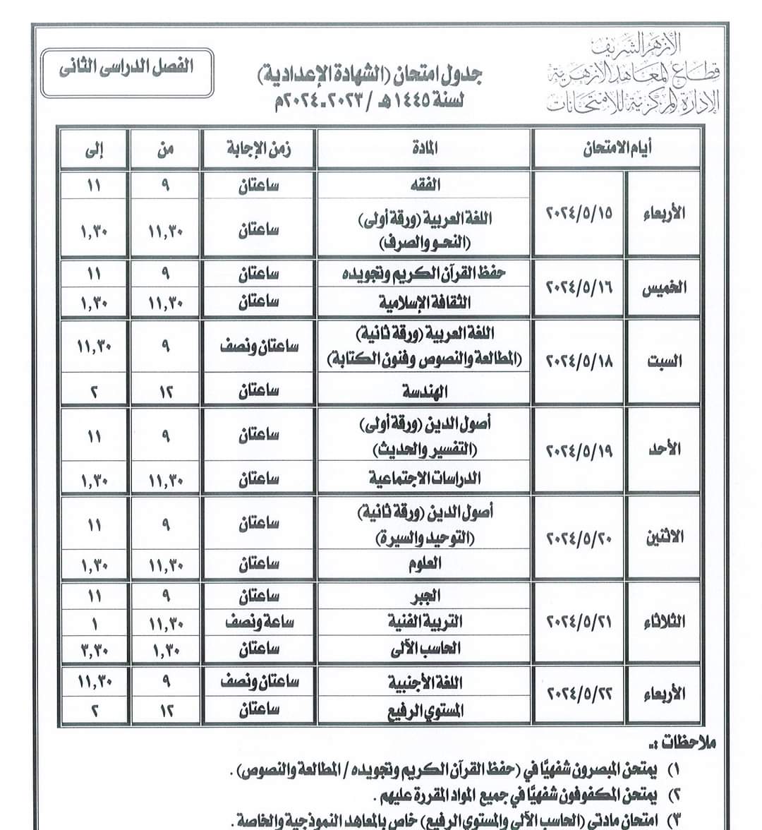 وقال قطاع المعاهد الأزهرية، إنه تم اعتماد جداول امتحانات الفصل الدراسي الثاني"النسخة المعتمدة" للمرحلة