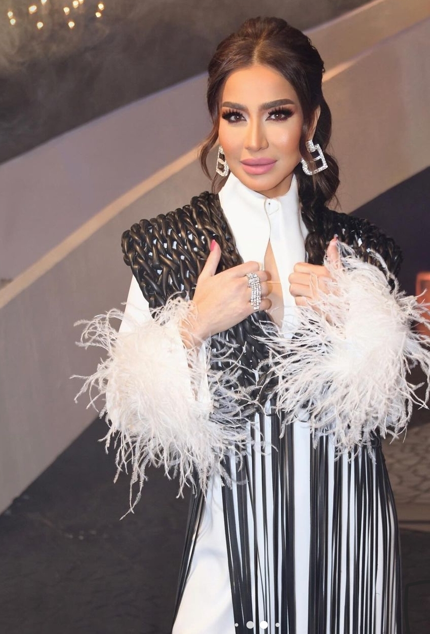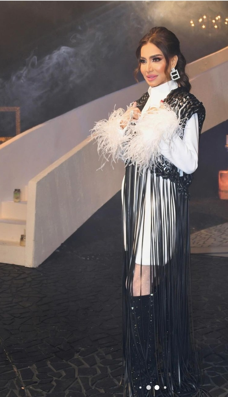 وبدت بسمة وهبة بإطلالة عصرية جذابة، حيث ارتدت فستان قصير فضفاض بأكمام طويلة مزينة بالريش الطويل من الأطراف ونسقت عليه جاكيت طويل صمم من الجلد المزين بالشراشيب باللون الأسود فيما انتعلت بوت طويل وصل لحدود الركبة.