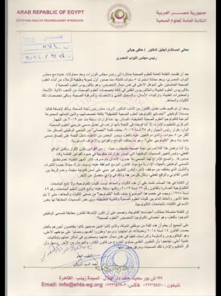 وخاطبت النقابة العامة للعلوم الصحية، المستشار حنفي جبالي، رئيس مجلس النواب، والمستشار أحمد مناع، أمين عام المجلس، لتوضيح تلك التداعيات، وقالت النقابة في خطاباتها لهما "بعد أن تقدمت النقابة بمذكرة إلى رئيس مجلس الوزراء، وبعد محاولات عديدة مع مجلس النواب، ومعاناة استمرت 5 سنوات كاملة، منذ صدور أول تسوية وظيفية للزملاء من أبناء العلوم الصحية، الحاصلين على المؤهل الأعلى فى نفس مجال التخصص، وهو بكالوريوسي العلوم الصحية / العلوم الطبية/ والبكالوريوس التقنى فى كافة تخصصات العلوم الصحية، من شعب الأشعة، والمختبرات الطبية، وتركيبات الأسنان، والتسجيل الطبى والاحصاء، والمراقبة الصحية، وباقى تخصصات تلك الكليات والمعاهد، قدم الدكتور أشرف حاتم، رئيس لجنة الصحة بالبرلمان، طلبا لتعديل القانون، وذلك لإضافة فئاتنا بمسمانا الوظيفى "أخصائيو تكنولوجيا العلوم الصحية التطبيقية" بكافة تخصصاتهم، والذين تشملهم المجموعة النوعية لتكنولوجيا العلوم الصحية التطبيقية، الصادر بها عدة قرارات سابقة منذ عام 2019 من الجهاز المركزى للتنظيم والإدارة.