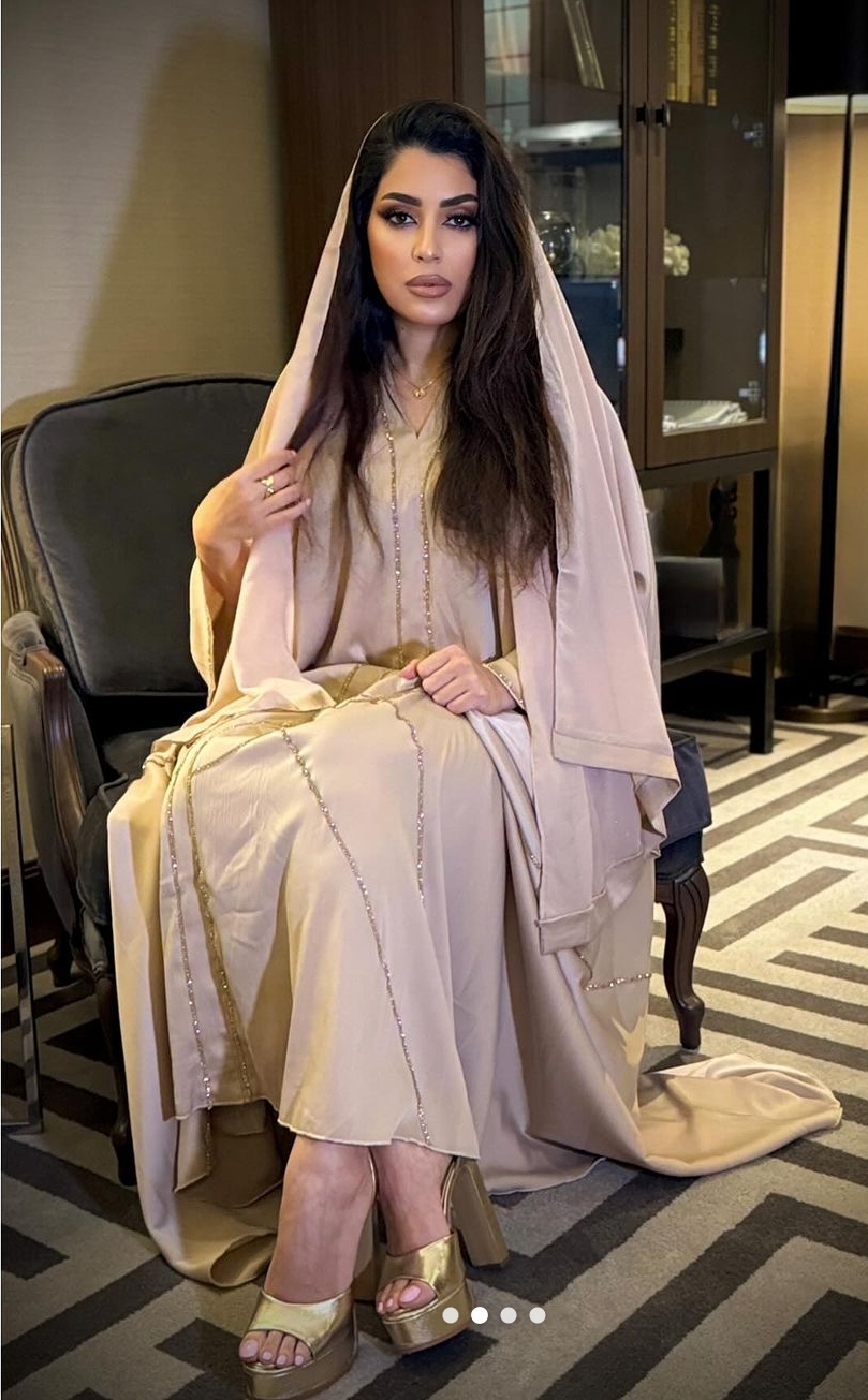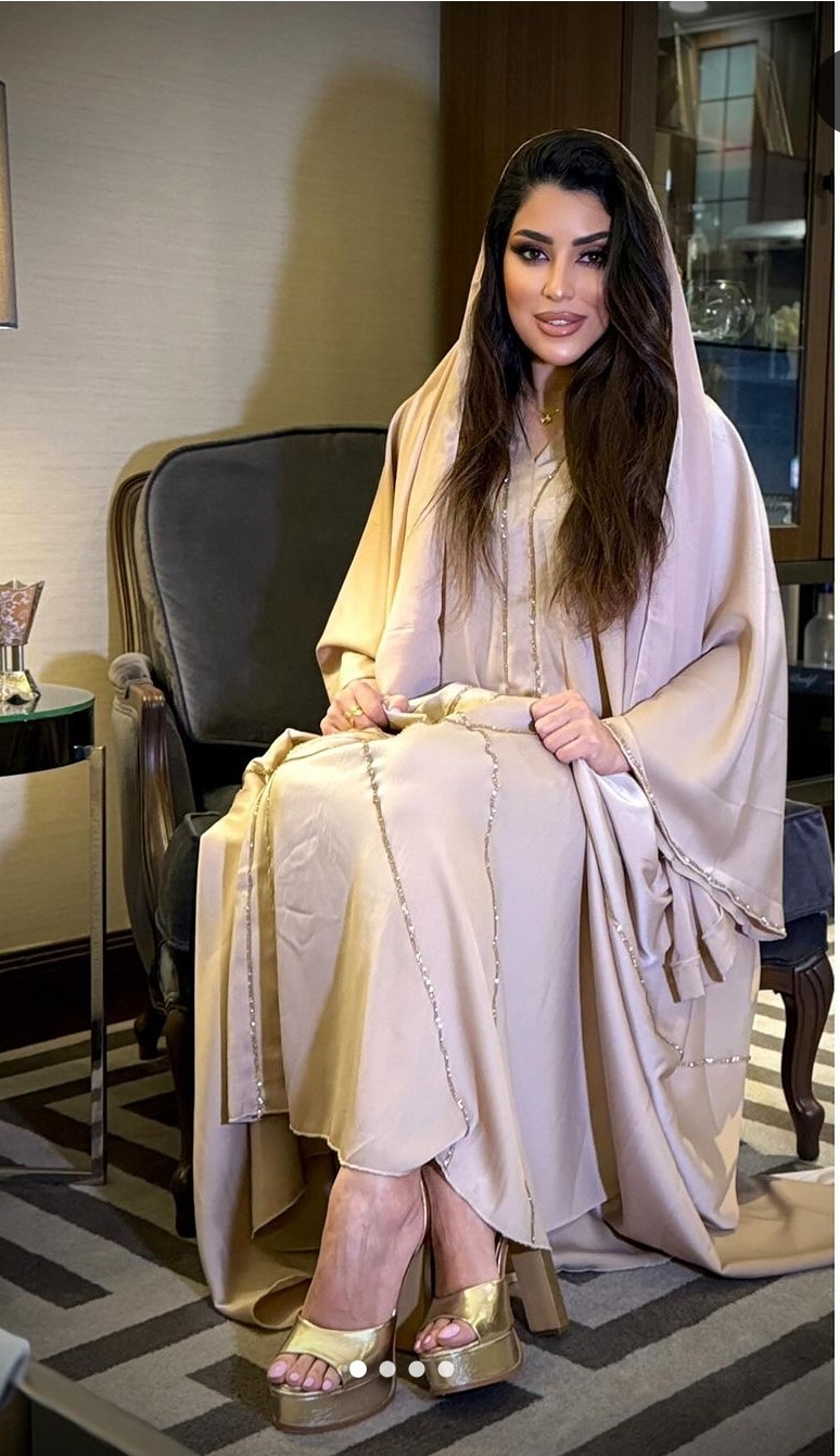 وبدت أيتن عامر بإطلالة محتشمة جذابة، حيث ارتدت عباءة طويلة فضفاضة، بأكمام طويلة، واسعة، صمم من قماش الكريب بلون البيج مزين بالكريستال من الأمام، فيما انتعلت صندلا بكعب عال باللون الذهبي.