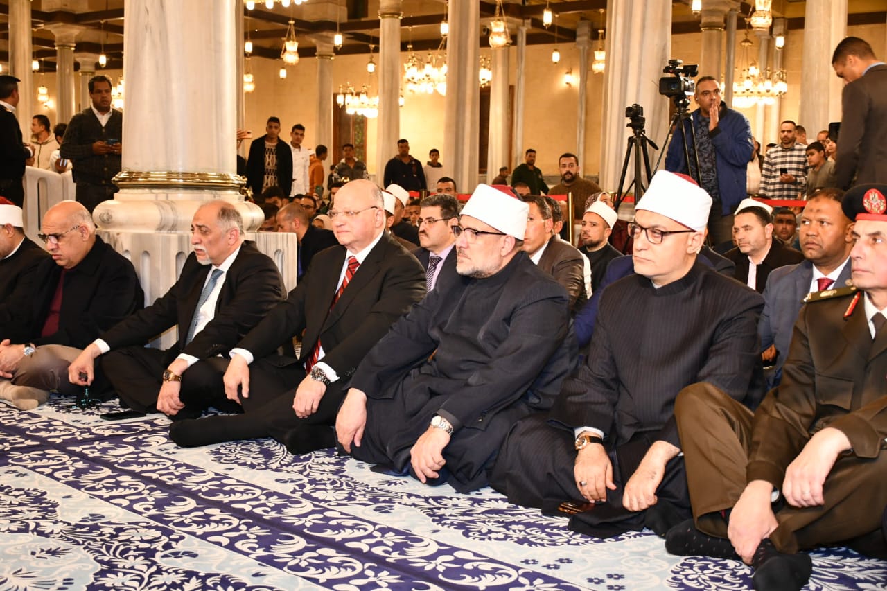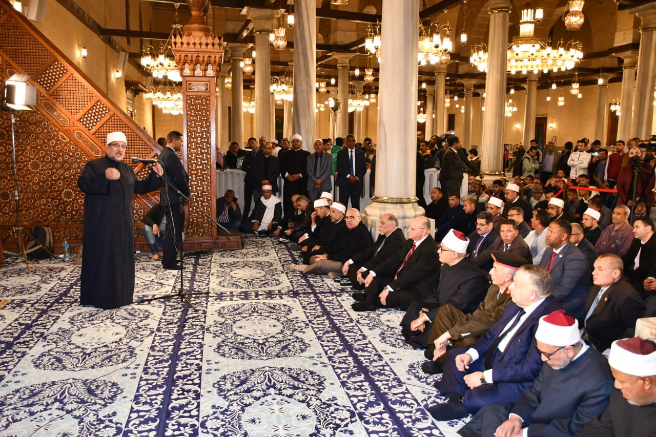 جاء ذلك بحضور الدكتور محمد مختار جمعة وزير الأوقاف، واللواء خالد عبد العال محافظ القاهرة، والأستاذ الدكتور نظير عياد الأمين العام لمجمع البحوث الإسلامية نائبًا عن الإمام الأكبر الأستاذ الدكتور أحمد الطيب شيخ الأزهر، واللواء أحمد شاهين مساعد مدير إدارة الشئون المعنوية نائبًا عن سيادة الفريق أول محمد زكي القائد العام للقوات المسلحة، والدكتور سلامة داود رئيس جامعة الأزهر، والدكتور عبد الهادي القصبي شيخ مشايخ الطرق الصوفية، والسيد محمود الشريف نقيب السادة الأشراف، والدكتور هشام عبد العزيز علي رئيس القطاع الديني، والدكتور نوح عبد الحليم العيسوي رئيس الإدارة المركزية لشئون مكتب الوزير، والدكتور أيمن علي أبو عمر رئيس الإدارة المركزية لشئون الدعوة، والدكتور أسامة فخري الجندي رئيس الإدارة المركزية لشئون المساجد والقرآن الكريم، ولفيف من القيادات الدينية والتنفيذية والشعبية.