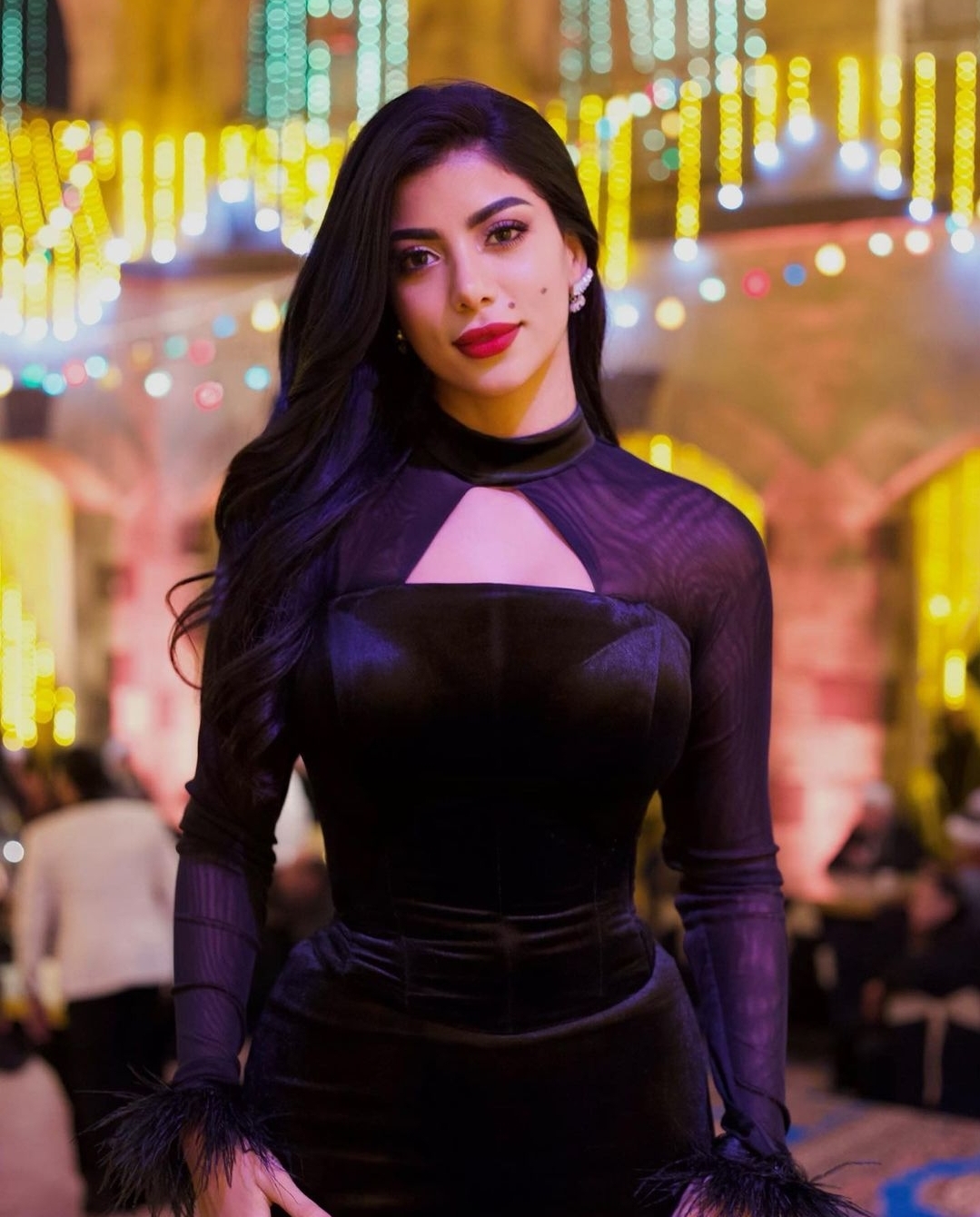 وتألقت كارولين عزمي بإطلالة ساحرة حيث ارتدت فستان مجسم طويل بأكمام طويلة مزين بالريش من الأطراف، واتسم بلياقة عالية لتواكب موضة فساتين سهرة لشتاء 2024،. صمم الفستان من قماش المخمل باللون الأسود.