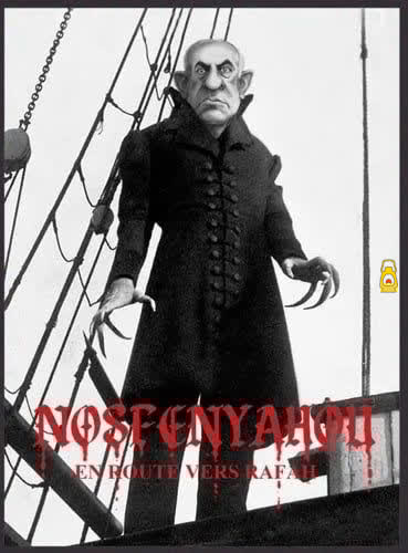 وتحت الرسم جاءت عبارة "نوسفينياهو في طريقه إلى رفح"، في إشارة إلى فيلم مصاص الدماء "نوسفيراتو" (Nosferatu) الذي أنتج عام 1922.