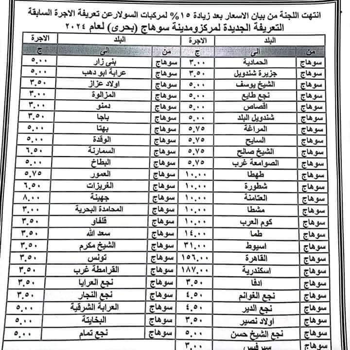 أصدر اللواء طارق الفقى محافظ سوهاج، اليوم الجمعة، قرارا بتعديل تعريفة الركوب الجديدة للمواصلات الداخلية والخارجية وسيارات نقل الركاب السرفيس والتاكسي، للنقل الداخلي بالمدن والمراكز وبين المحافظات، وكذلك بين المدن والمراكز والقرى التابعة لها بزيادة 15% لمركبات السولار عن تعريفة الأجرة السابقة، أما بالنسبة للتاكسي العداد الأجرة 13.50 غرب المدينة و17.50 شرق مدينة سوهاج .