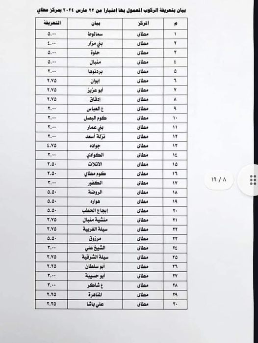 أصدر اللواء أسامة القاضي محافظ المنيا، قرارًا بتحريك أسعار تعريفة الركوب بالخطوط الداخلية والخارجية للمحافظة، مؤكدًا على التزام السائقين بتعريفة الركوب وإلا سيعرض نفسه المساءلة، وأكد المهندس حامد فخري، رئيس المركز، على المتابعة المستمرة للمواقف بمطاي والسائقين، من حيث الالتزام بالتعريفة المحددة من لجنة التسعير، كما تابع رئيس المركز سير العمل بمحطات البترول بالمركز، واطمأن على المخزون من المواد البترولية، والالتزام بالتعليمات والقوانين.