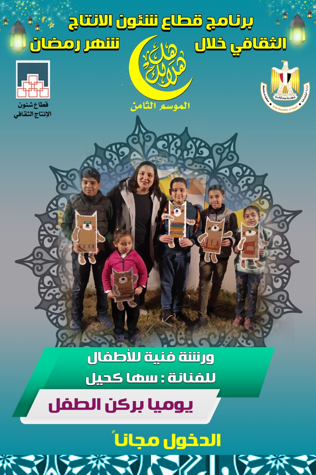 وانطلاقا من اهتمام القطاع بالطفل وتنمية مهاراته الفنية، يتضمن برنامج هل هلالك ركن الطفل، الذى يشمل ورش رسم وأشغال فنية تحت إشراف الفنانة "سها كحيل"، وأيضا يوميا طوال فترة إقامة البرنامج .
