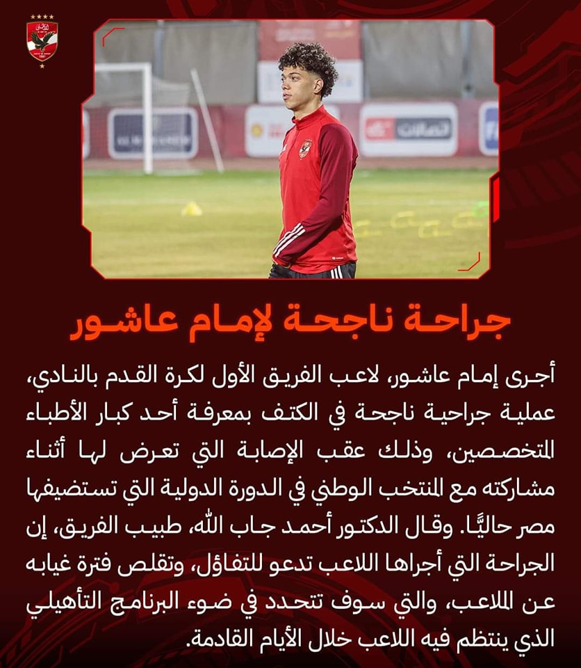 وقال الدكتور أحمد جاب الله، طبيب الفريق الأول لكرة القدم بالنادي الأهلي، إنه في ضوء الفحوصات الطبية التي خضع لها اللاعب إمام عاشور، بعد الإصابة التي تعرض لها أثناء مشاركته مع المنتخب الوطني في مباراة نيوزيلندا، وبعد العرض على كبار الأطباء المتخصصين في إصابات الكتف، تقرر خضوع اللاعب لإجراء عملية جراحية في الكتف.