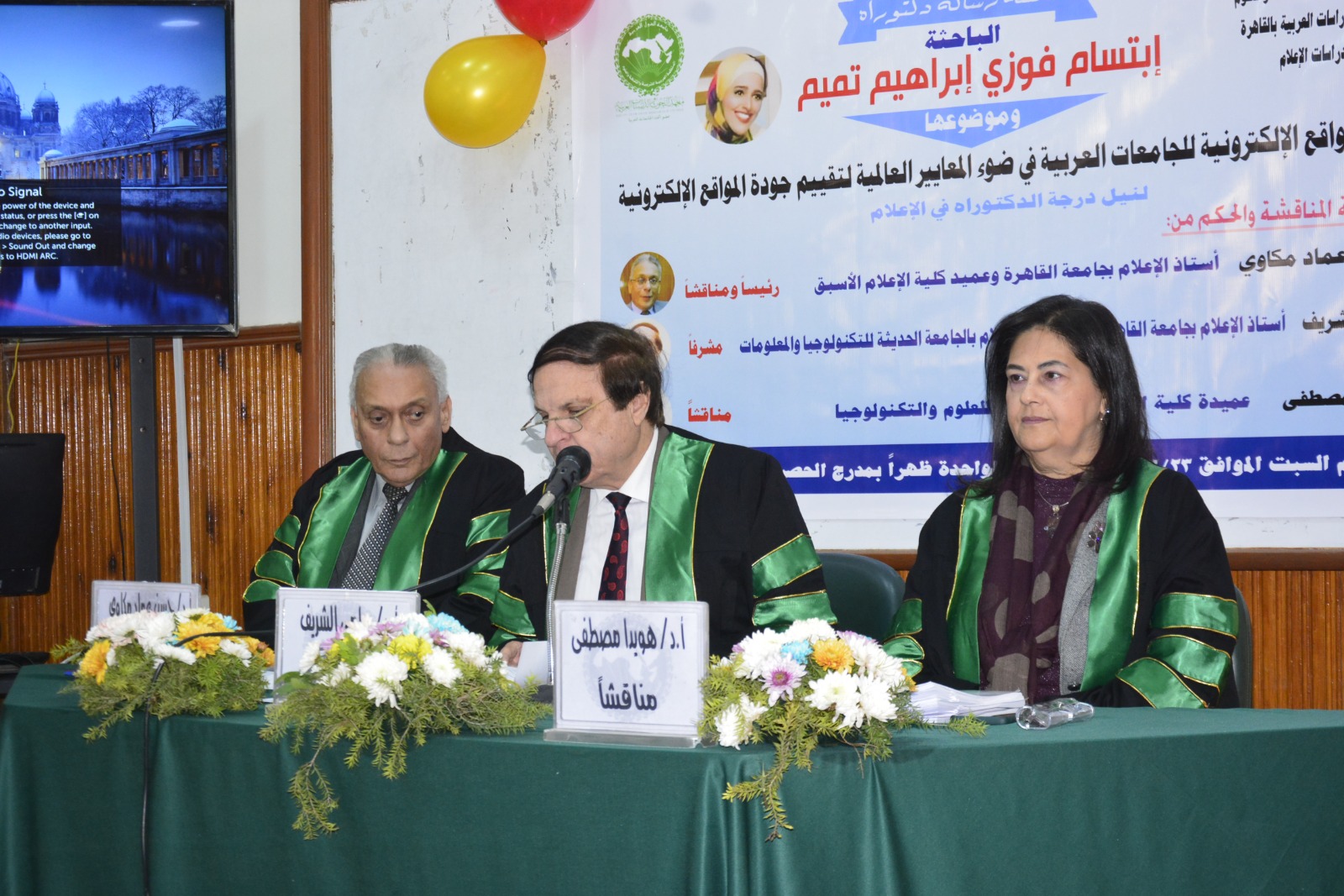 جدير بالذكر، أن لجنة المناقشة والحكم تكونت من: الدكتور حسن عماد مكاوي أستاذ الإعلام بجامعة القاهرة وعميد كلية الإعلام الأسبق رئيسا ومشرفا، والدكتور سامي الشريف أستاذ الاعلام بكلية إعلام جامعة القاهرة وعميد كلية الإعلام بالجامعة الحديثة للتكنولوجيا والمعلومات مشرفًا، والدكتورة هويدا مصطفى أستاذ الإعلام بجامعة القاهرة وعميد كلية الاعلام الأسبق وعميد كلية الإعلام بجامعة مصر للعلوم والتكنولوجيا مناقشًا.