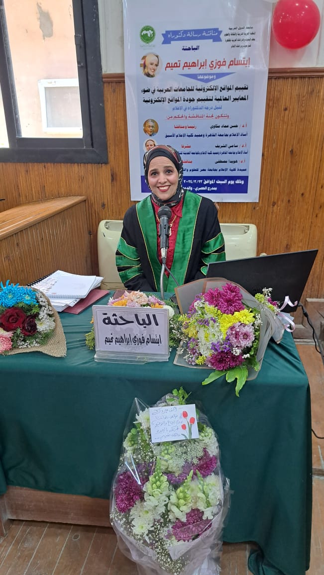 حصلت الباحثة ابتسام فوزي تميم علي درجة الدكتوراه في الدراسات الإعلامية من قسم البحوث والدراسات الإعلامية بتقدير مرتبة الشرف الأولي، في رسالة بعنوان “تقييم المواقع الإلكترونية للجامعات العربية في ضوء المعايير العالمية لجودة المواقع الإلكترونية”، بمدرج الحصري في معهد البحوث والدراسات العربية التابع لجامعة الدول العربية.