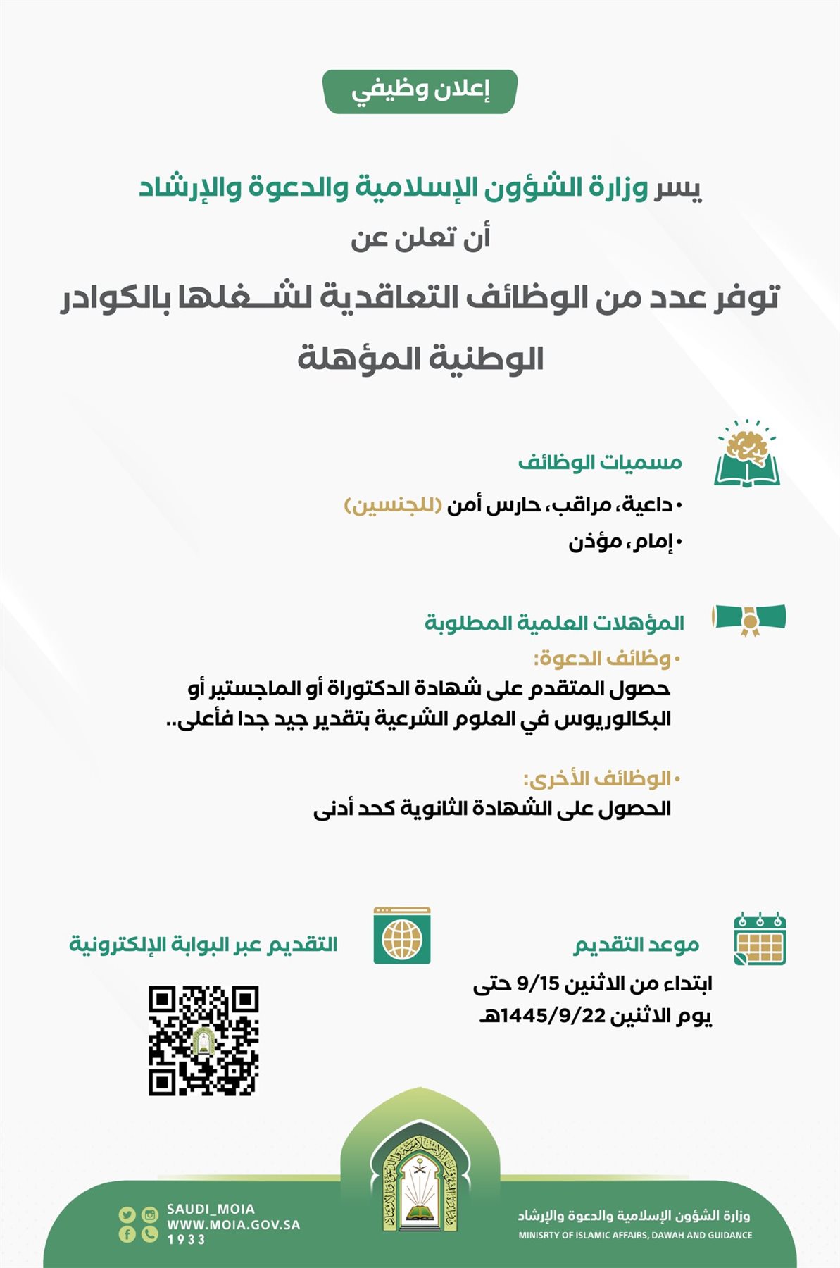 وكانت وزارة الشؤون الإسلامية والدعوة والإرشاد، أعلنت عبر موقعها الإلكتروني الرسمي وحسابها بموقع التواصل الاجتماعي "إكس" تويتر سابقًا، توافر عدد من الوظائف التعاقدية لشغلها بالكوادر الوطنية المؤهلة في مجال الدعوة، ومراقبة المساجد، والحراسات الأمنية للجنسَيْن، أما مجال الإمامة والأذان فللرجال فقط.