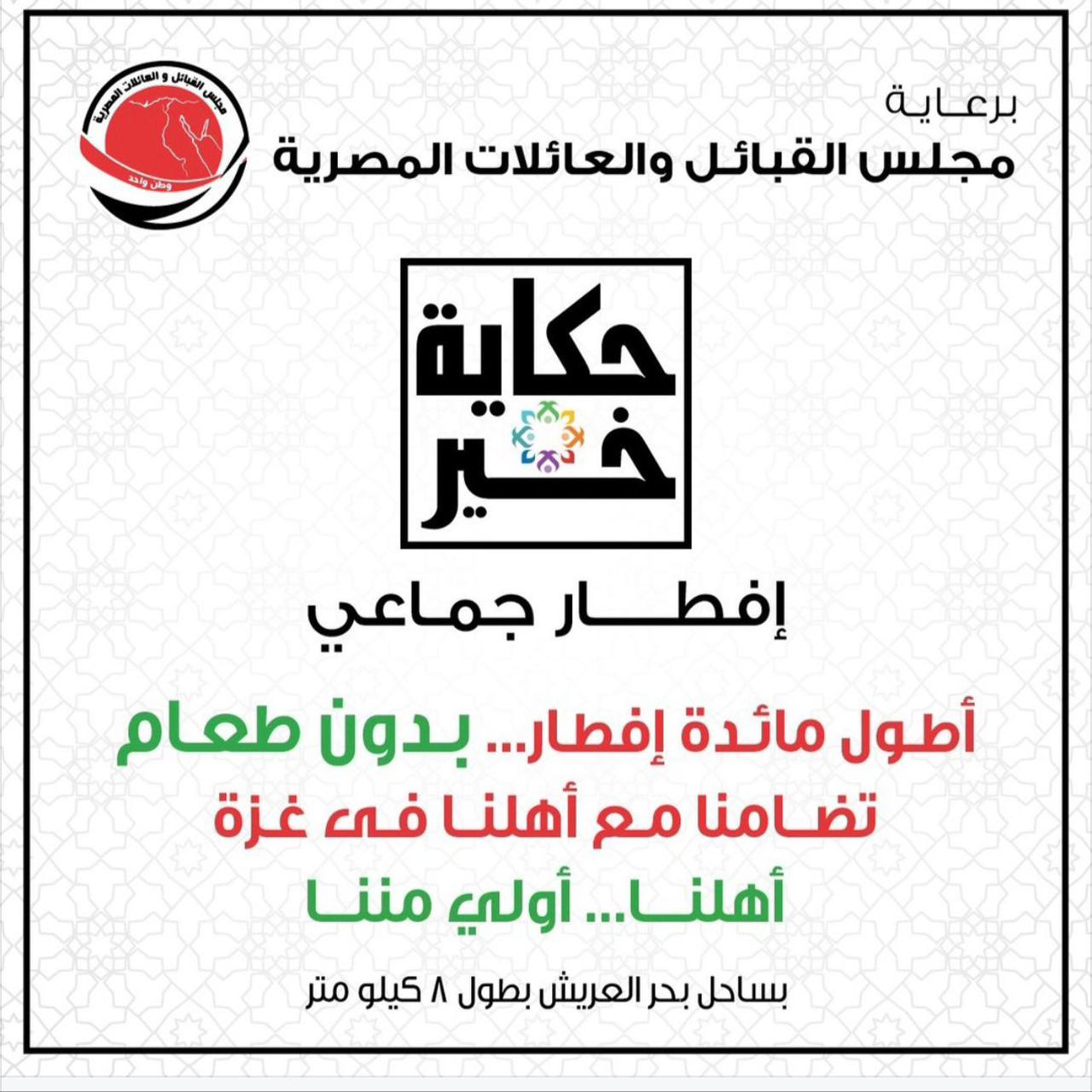 أعلن مجلس القبائل والعائلات المصرية عن تنظيم اطول مائدة إفطار على ساحل مدينة العريش الجمعة المقبلة بدون إفطار تضامنا مع الشعب الفلسطيني في قطاع غزة والاحوال المعيشية الصعبة التي يتعرضون لها مع استمرار العدوان الاسرائيلين وذلك يوم الجمعة المقبل.