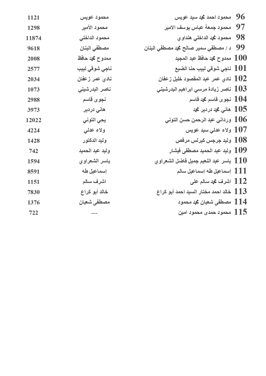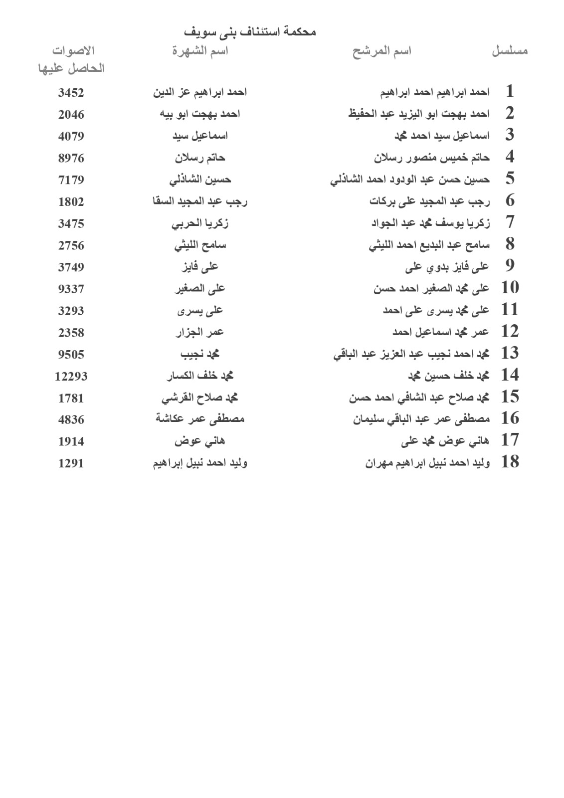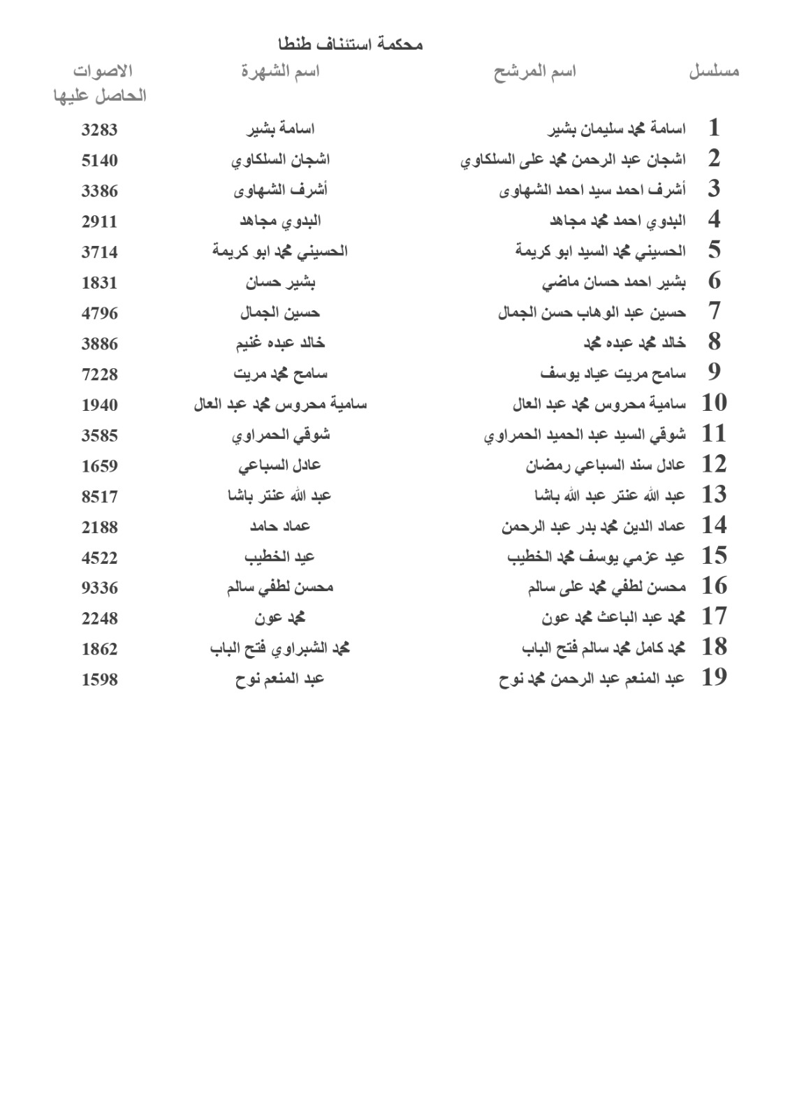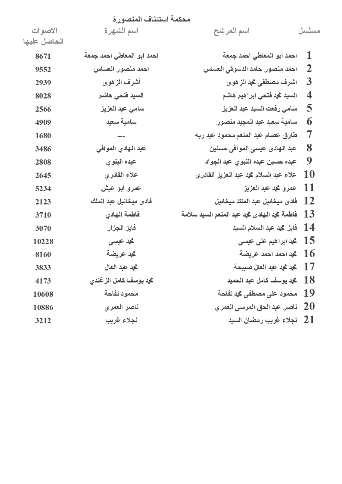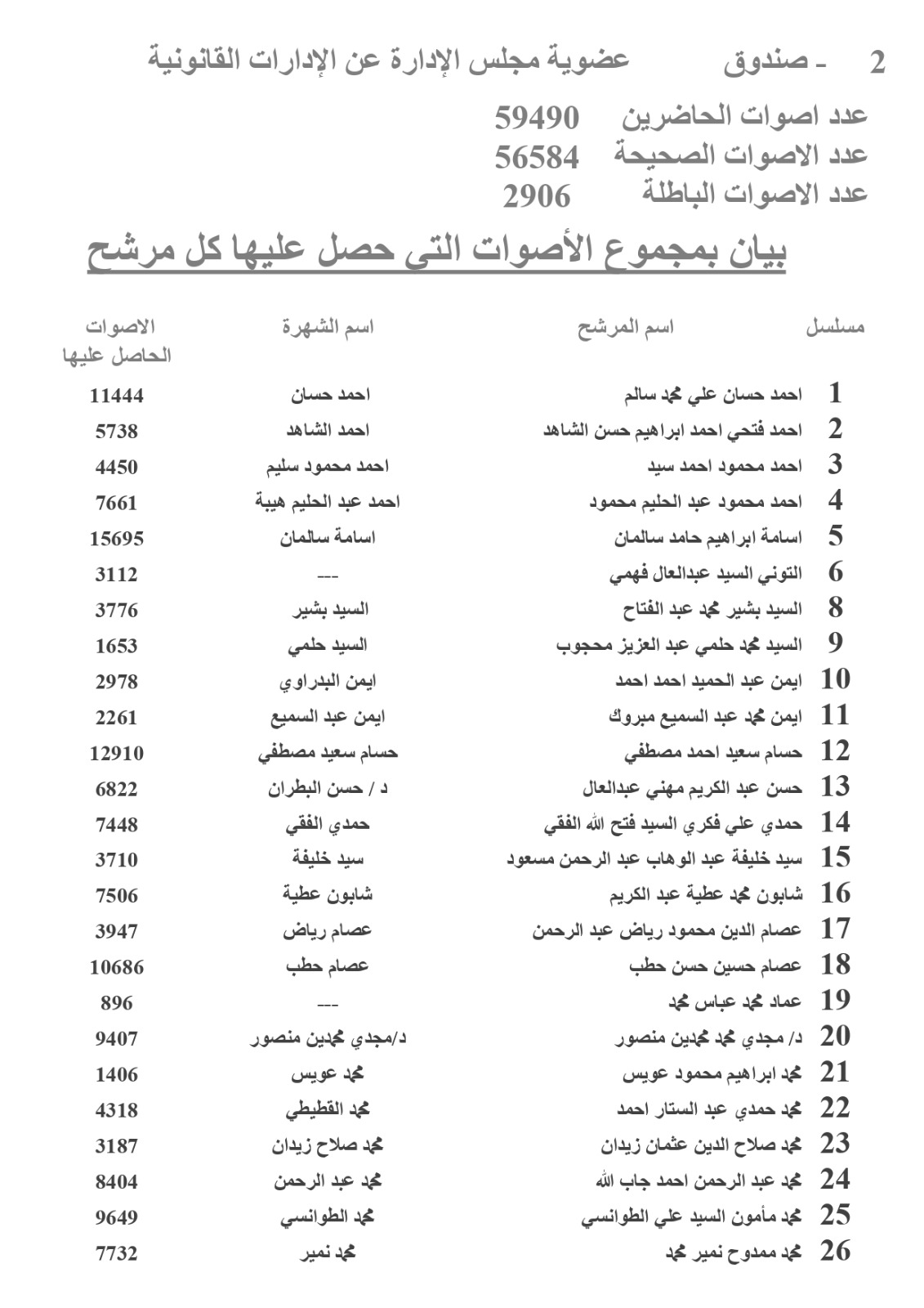 وأضاف أن أسامة الشتشاوى حصل على 168 صوتًا وأسعد هيكل 99 صوتًا وأشرف فتح الباب 97 صوتًا وأيمن عبد العزيز 52 صوتًا وخالد حافظ 31 صوتًا ودعاء العجوز 274 صوت وسامح عاشور 20316 صوتًا وعبد الحليم علام 23955 صوتًا وفرج عاشور 314 صوتا و نبيل عبد السلام 12087 صوتًا.