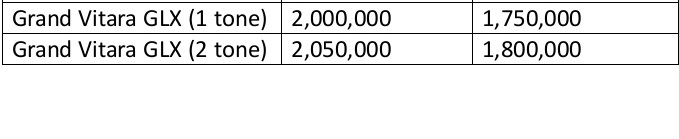 وبحسب المعلن فإن مودرن موتورز، تقدم السيارة سوزوكي جراند فيتارا الجديدة بفئة واحدة من التجهيزات GLX تتوافر عبر إصدارين، الإصدار الأول "GLX MONO"، ويقدم بسعر مليون 750 ألف جنيه بعد الخصم الجديد، بينما يقدم الإصدار الثاني "GLX TWO"، بسعر مليون و800 ألف جنيه.
