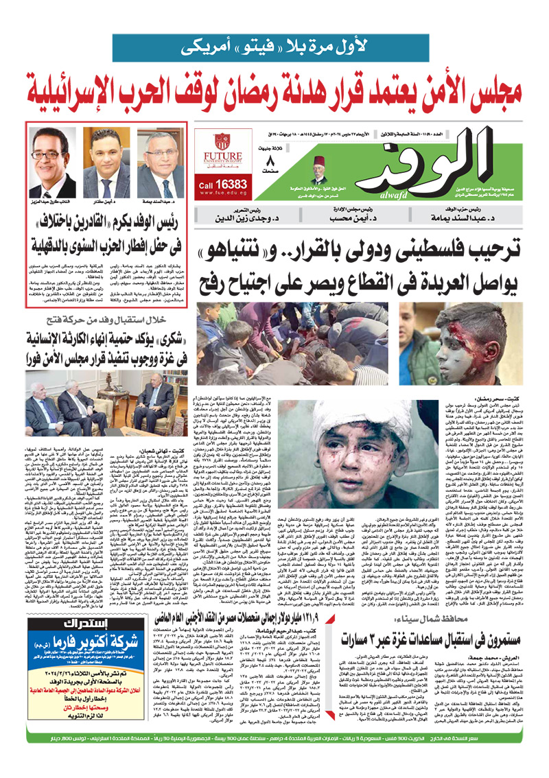 تنشر جريدة الوفد في عددها الصادر، غدًا الأربعاء، الكثير من الموضوعات والتقارير الإخبارية المهمة، أبرزها: "مجلس الأمن يعتمد قرار هدنة رمضان لوقف الحرب الإسرائيلية".