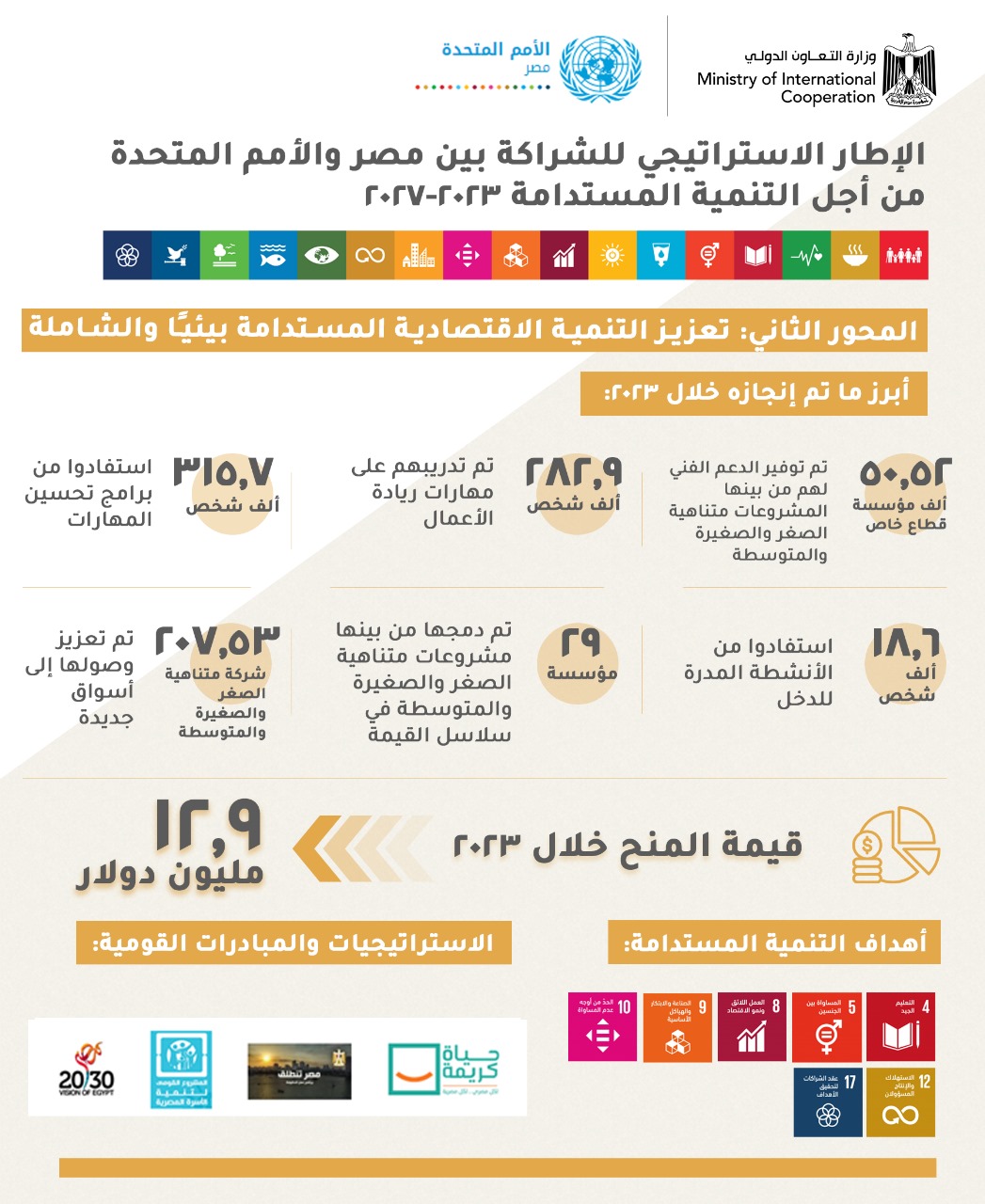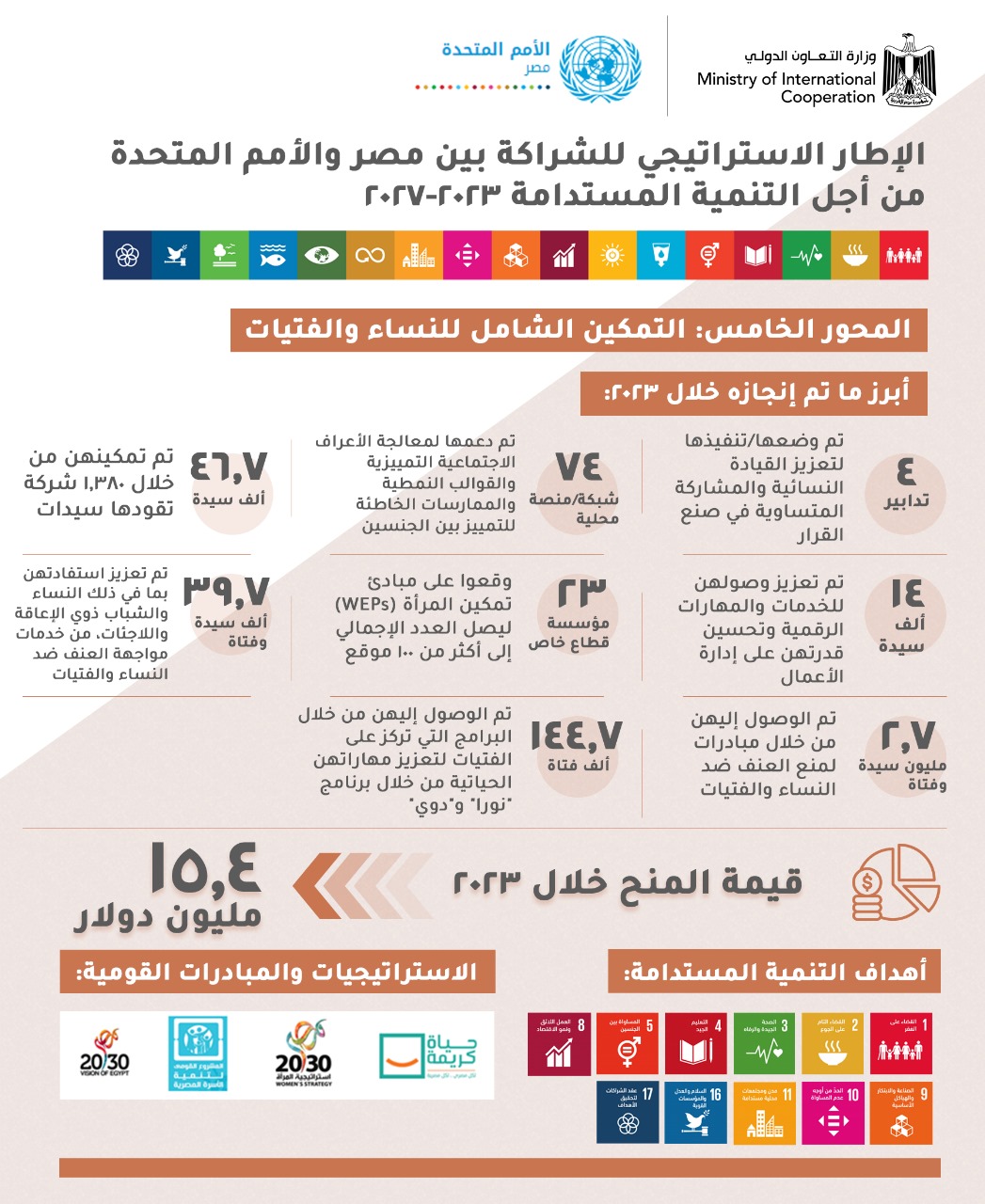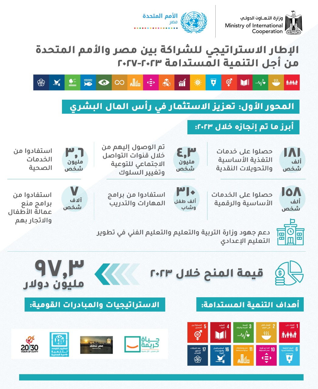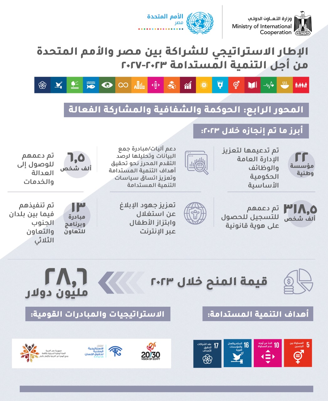 ومن خلال الجهود المشتركة بين الجهات الوطنية ممثلة في وزارات الخارجية، والجهاز المركزي للتعبئة العامة والإحصاء، ووزارات التنمية المحلية، والعدل، ومركز المعلومات ودعم اتخاذ القرار، ومنظمة اليونيسيف، وبرنامج الأمم المتحدة الإنمائي، والمفوضية السامية للأمم المتحدة لشؤون اللاجئين، فقد تم تنفيذ العديد من التدخلات التي ساهمت في دعم 22 مؤسسة وطنية لتعزيز الإدارة العامة والوظائف الحكومية الأساسية، بالإضافة إلى دعم آليات/مبادرة جمع البيانات وتحليلها لرصد التقدم المحرز نحو تحقيق أهداف التنمية المستدامة وتعزيز اتساق سياسات التنمية المستدامة، تمكين 318.5 ألف شخص للتسجيل للحصول على هوية قانونية، وتعزيز جهود الإبلاغ عن استغلال وابتزاز الأطفال عبر الإنترنت، وتنفيذ 13 مبادرة وبرنامجاً للتعاون فيما بين بلدان الجنوب والتعاون الثلاثي، وبلغت المنح خلال عام 2023 نحو 28.6 مليون دولار.
