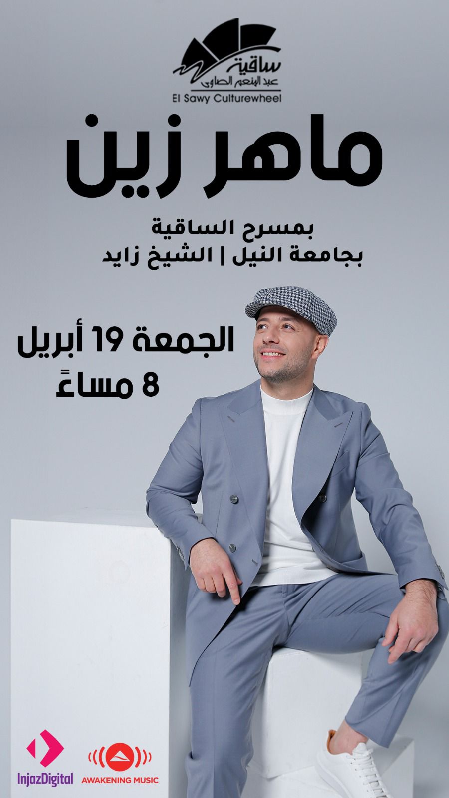 يطل الفنان ماهر زين ، على جمهوره المصري في حفل غنائي ضخم يقام على مسرح ساقية الصاوي بجامعة النيل بالشيخ زايد، وذلك يوم 19 أبريل المقبل، بمدينة أكتوبر.