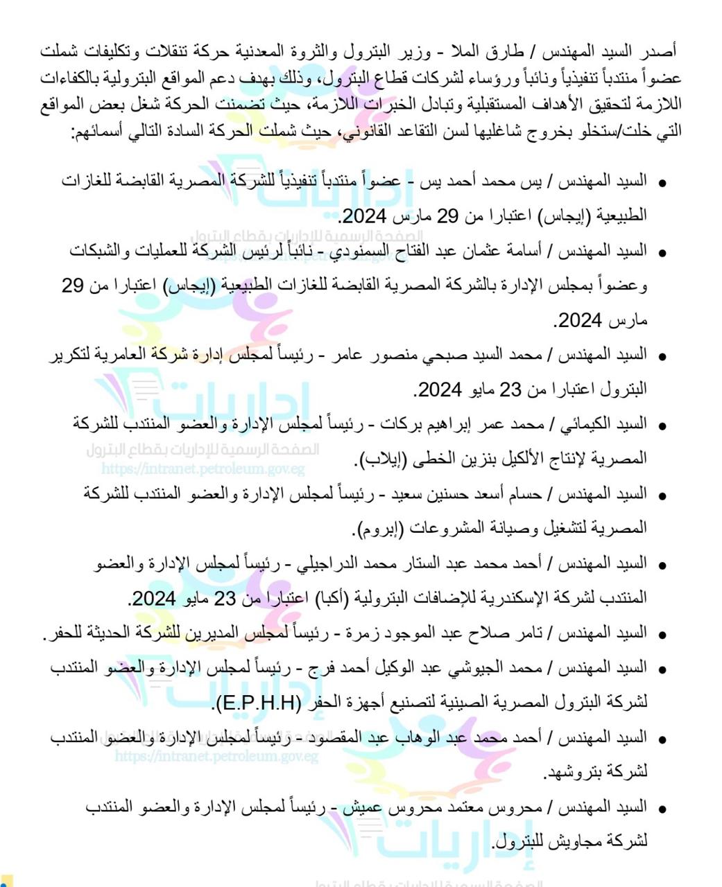 أصدر المهندس طارق الملا وزير البترول والثروة المعدنية ، حركة تكليفات وتنقلات
