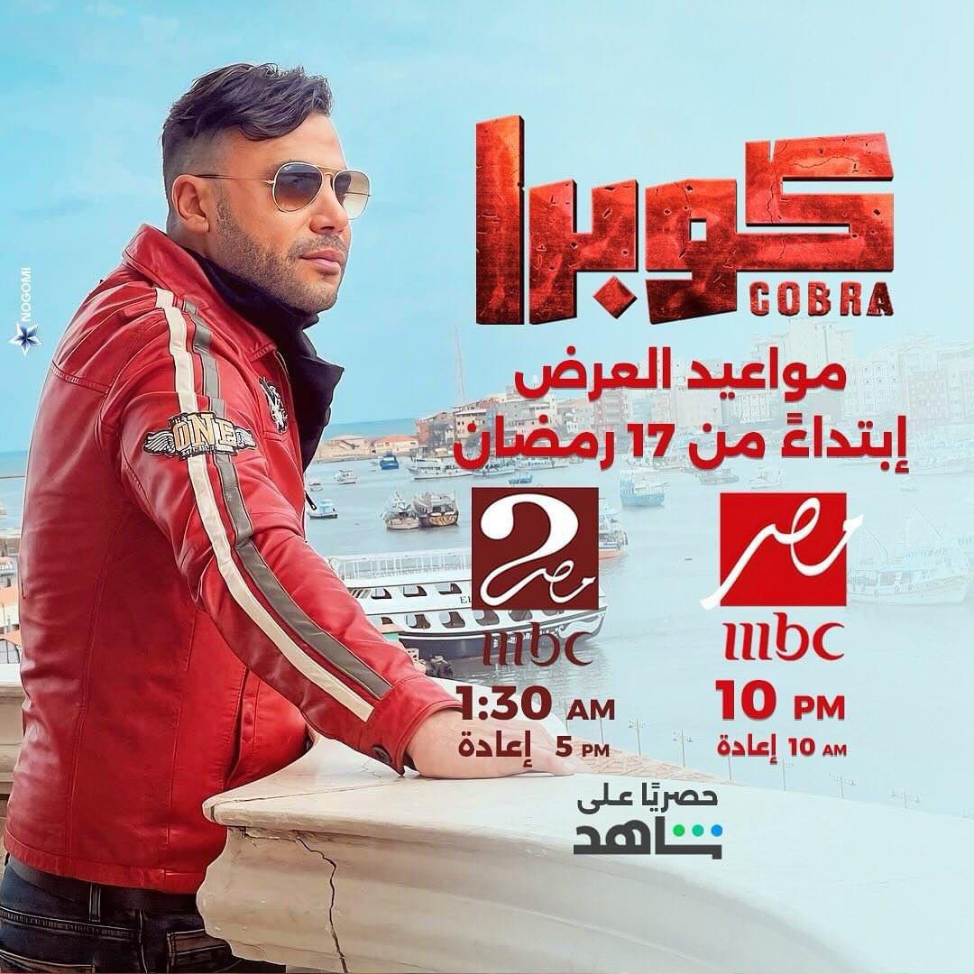 ينطلق عرض أولى حلقات مسلسل "كوبرا" للنجم محمد إمام في تمام الساعة 10 مساء اليوم الأربعاء على قناة Mbc مصر ومنصة شاهد ويعاد الساعة 10 صباحاً، ويعرض على قناة Mbc مصر 2 الساعة 1.30 صباحاً ويعاد الساعة 5 مساء.