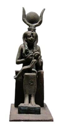يعرض تمثال من البرونز يصور الإلهة إيزيس من العصر المتأخر جالسة ترضع الطفل حورس.