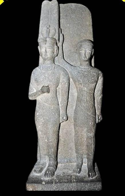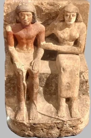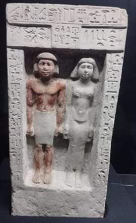 يعرض تمثال من العصر اليوناني الروماني من الحجر الجيري لبيبى عنخ وزوجتة وهى تحيط زوجها بذراعها.