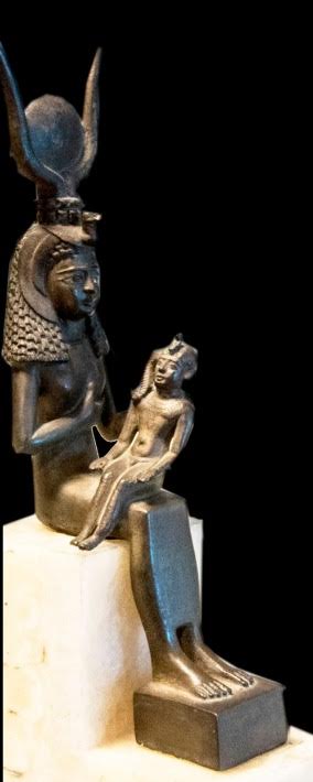 يعرض تمثال من البرونز للمعبودة إيزيس الربة الحامية و الأم العطوفة على ولدها حورس بعد مقتل أبيه أوزير على يد عمه ست.