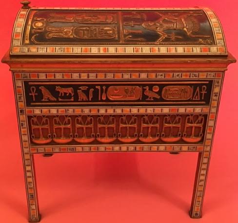 يعرض أحد مقتنيات الملك فاروق، وهو صندوق من الخشب، بأشرطة ملونه يحليها زخارف لرموز فرعونية وكتابات بالخط الهيروغليفي من ضمنها خرطوش باسم الملك أمنحتب الثالث.