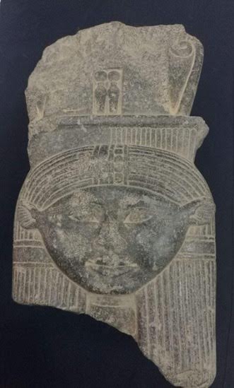 يعرض رأس تمثال من الجرانيت الأسود للمعبودة حتحور، رمز الحب والعطاء والأمومة .