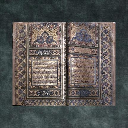يعرض نسخة من مصحف شريف من القرن 19، ذو غلاف من الجلد زينت أول صفحتين منه بزخارف نباتية دقيقة.