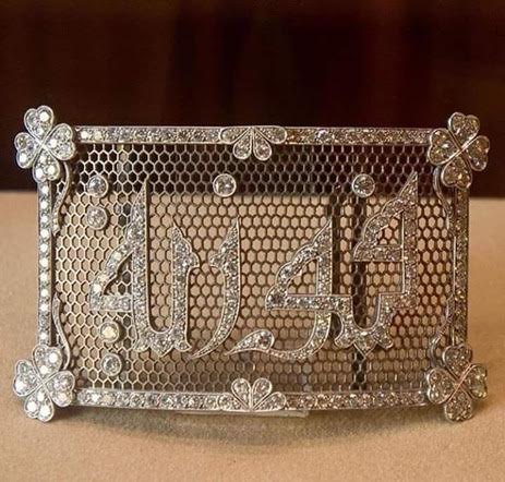 يعرض توكة لتزيين الشعر للأميرة فوزية مصنوعة من البلاتين مرصعة بالماس يتوسطها اسم الأميرة.