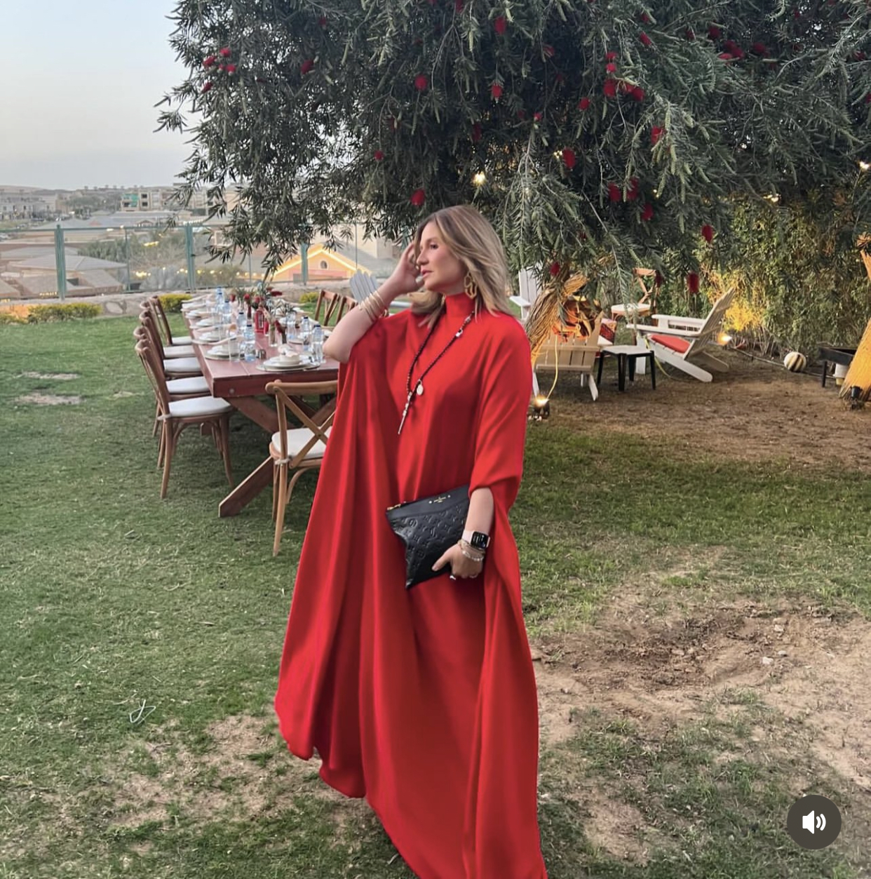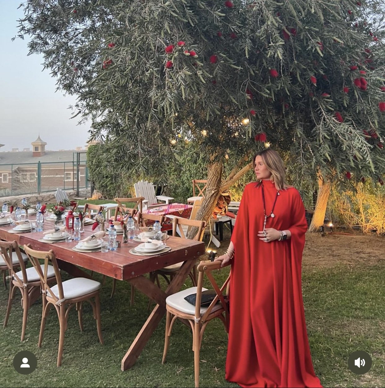 وبدت هنا شيحة بفستان يشبه العباءة باللون الأحمر الناري واسع وطويل، ومحتشم، وتميز بأكمام فضفاضة ورقبة عالية، لتخطف الأنظار بإطلالة أنثوية جذابة.