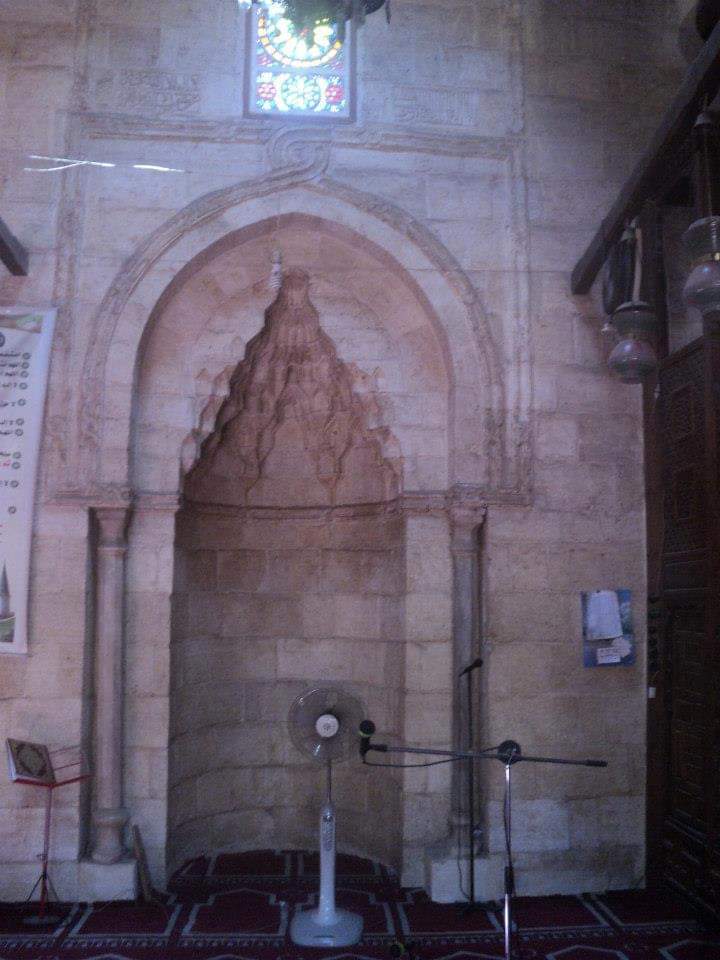 وجدار القبلة يشتمل على ثلاثة محاريب الأوسط أكبرها وهو عبارة عن حنية نصف دائرية يكتنفها عمودان من الرخام ذات قواعد وتيجان ناقوسية ويزخرف طاقية المحراب ست حطات من المقرنصات المدببة ويعلو المحراب منطقة مستطيلة بها زخارف كتابية محفورة بالخط الكوفى ويعلو المربع الذى يتقدم المحراب شخشيخة صغيرة من الخشب.